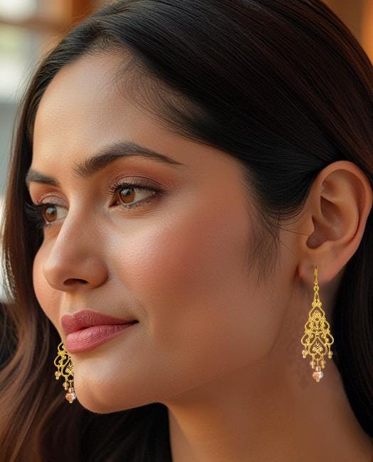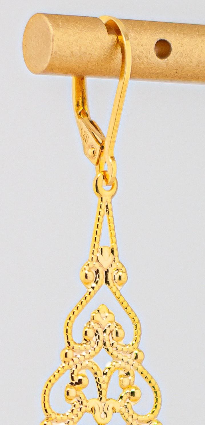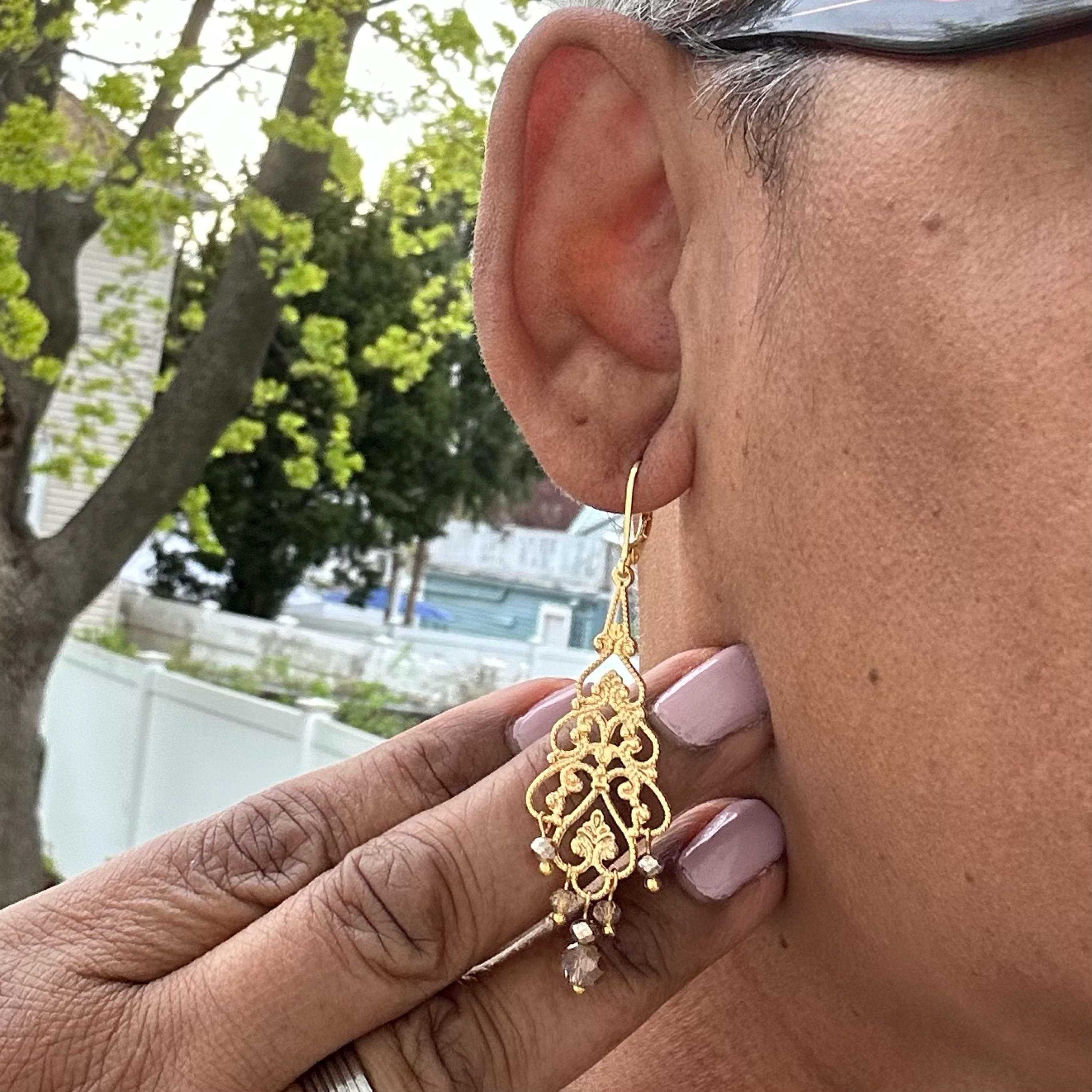 The filigree work in the earrings is very pretty. The beads at the bottom of the earrings add just a touch of sparkle. This is a dangle earring and I really love the design.