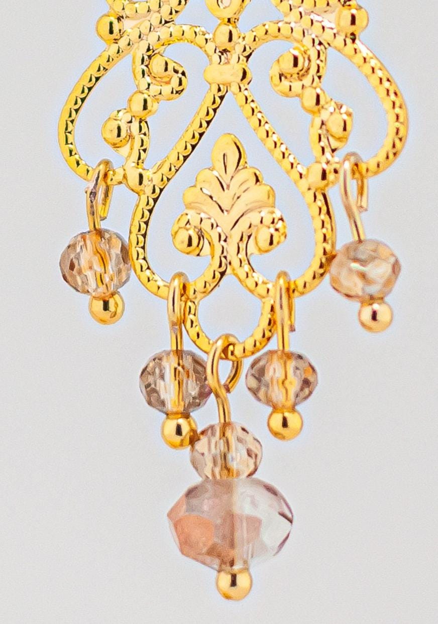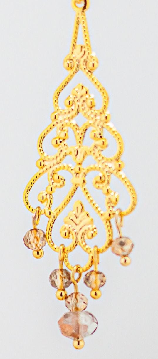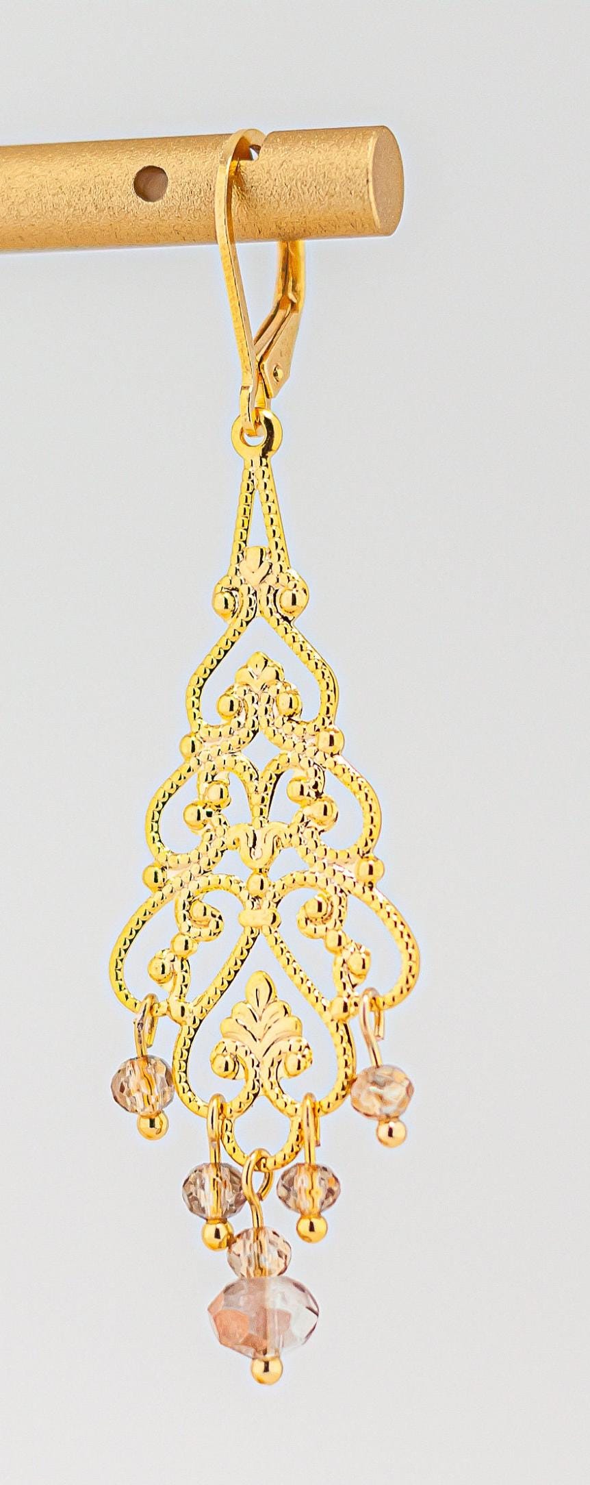 Add a touch of elegance and romance to your look with these stunning beaded gold filigree earrings. The shimmering, faceted amber glass beads catch the light and perfectly complement the lovely warm gold tones of the gold filigree.