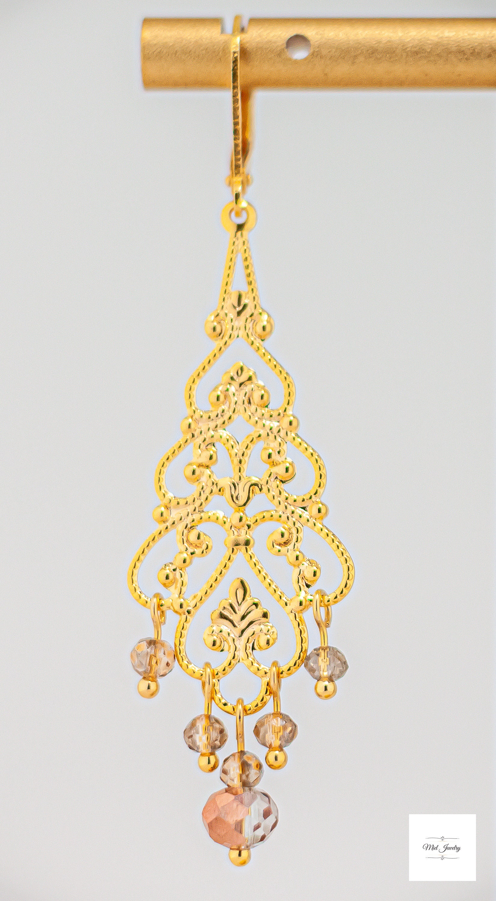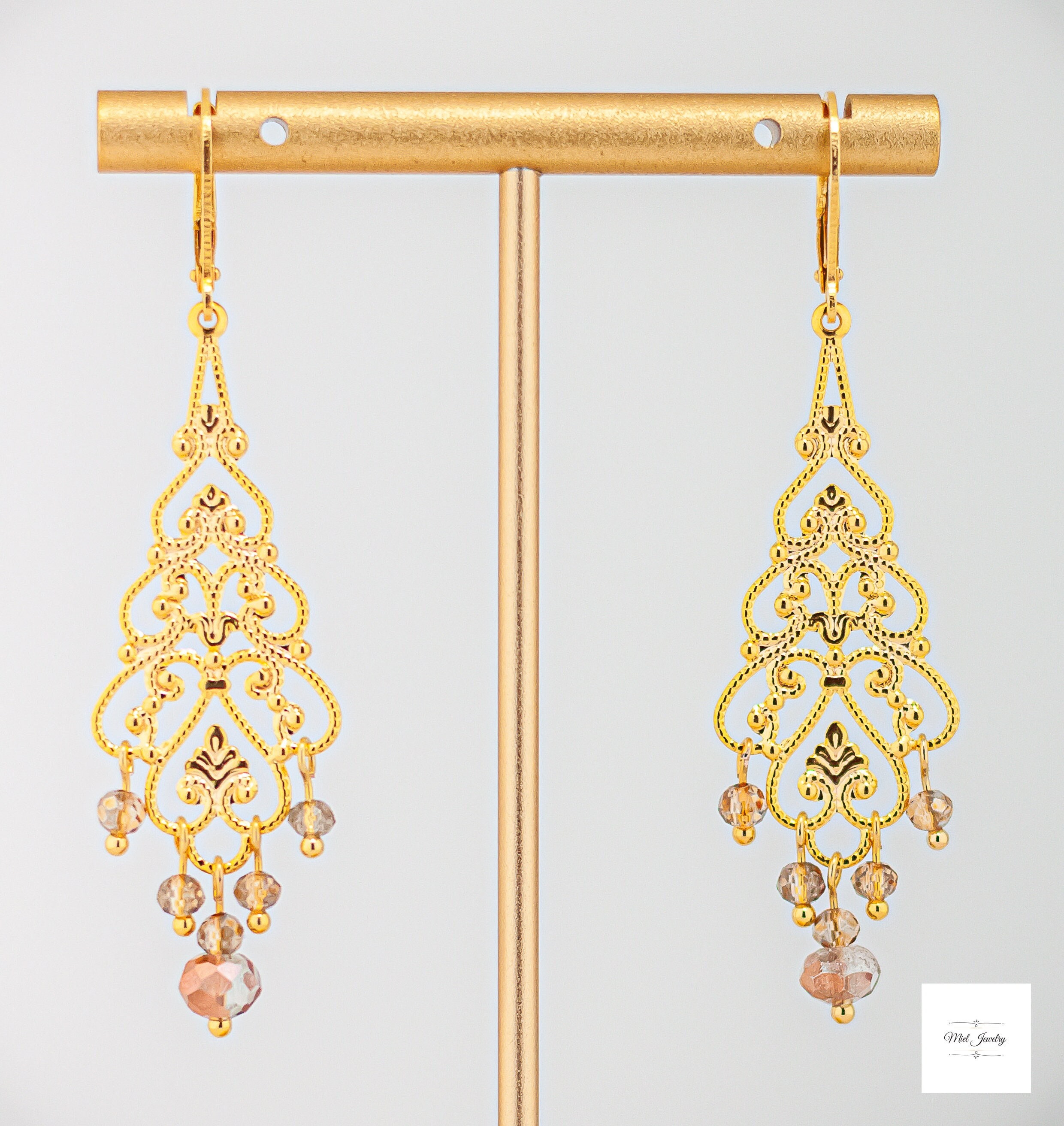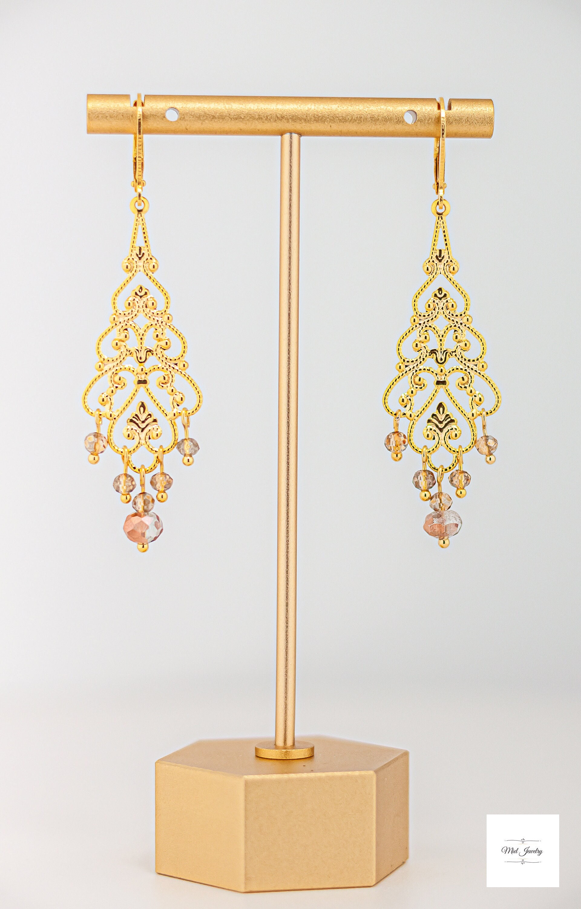 Add a touch of elegance and romance to your look with these stunning beaded gold filigree earrings. The shimmering, faceted amber glass beads catch the light and perfectly complement the lovely warm gold tones of the gold filigree.
