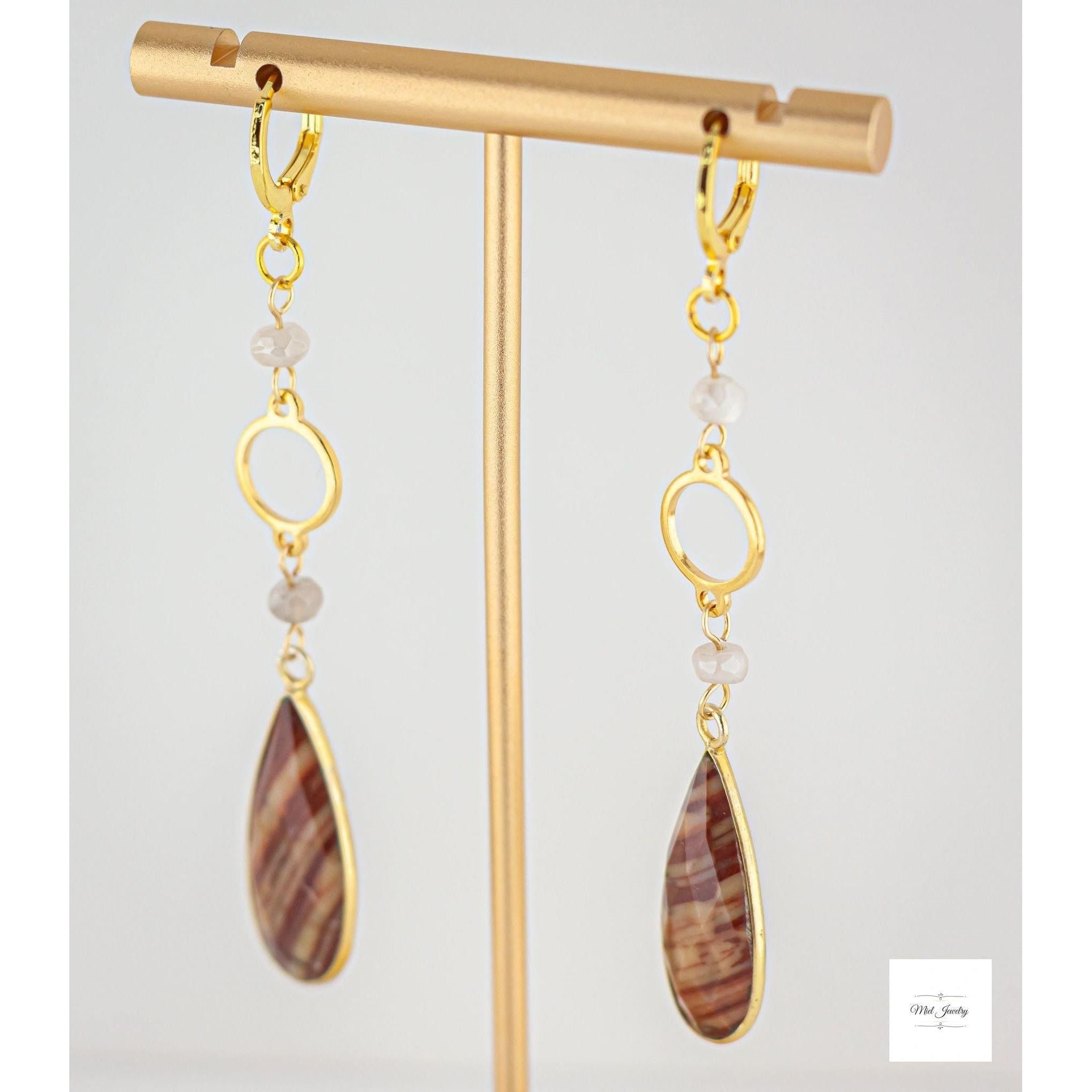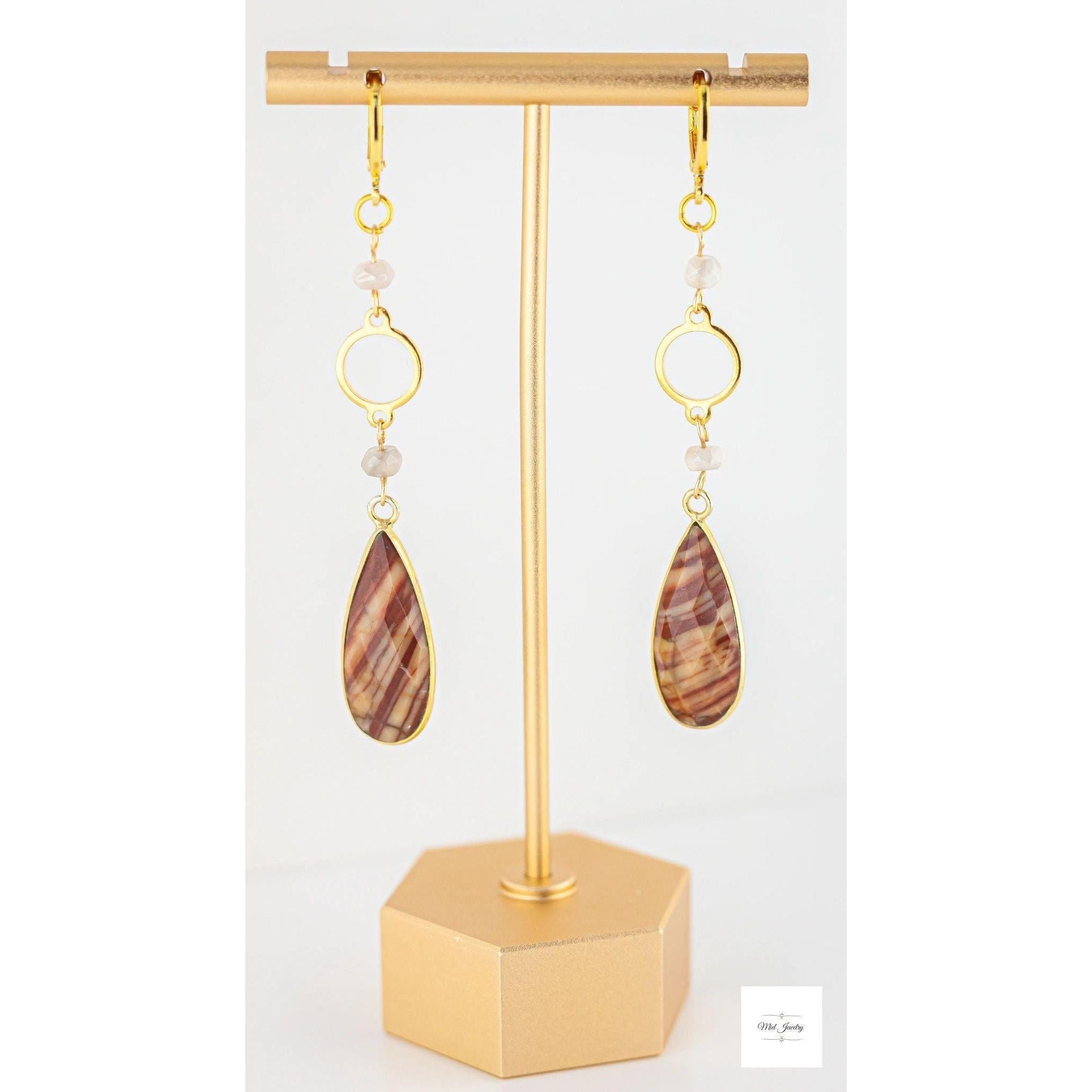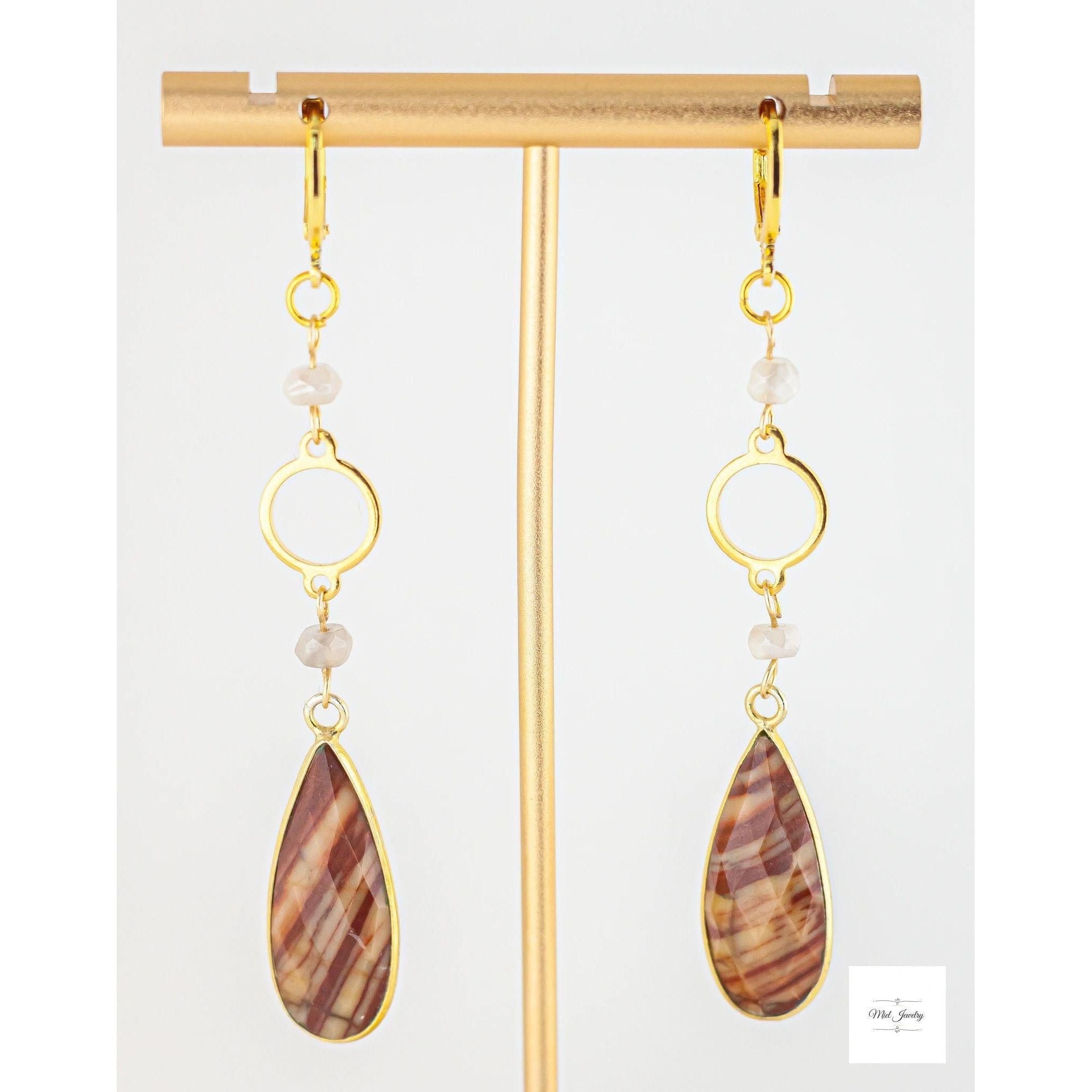 These earrings terracotta red jasper and luminous mystic moonstone beads to create a unique and stunning earth toned gemstone accessory. The beautiful jasper stones boast natural patterns with matte reddish orange hues and ribbons of cream, grey, and beige. The moonstone beads have an iridescent shimmery creamy grey tone that add a touch of natures design and lovely color contrast. These beaded long gold earrings are suitable for any occasion and will surely make you stand out. They are your go-to whether you're looking for a bold everyday boho chic accessory or to add an earthy statement piece in your jasper jewelry collection for a special event.