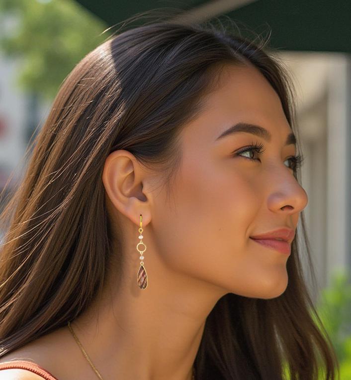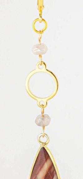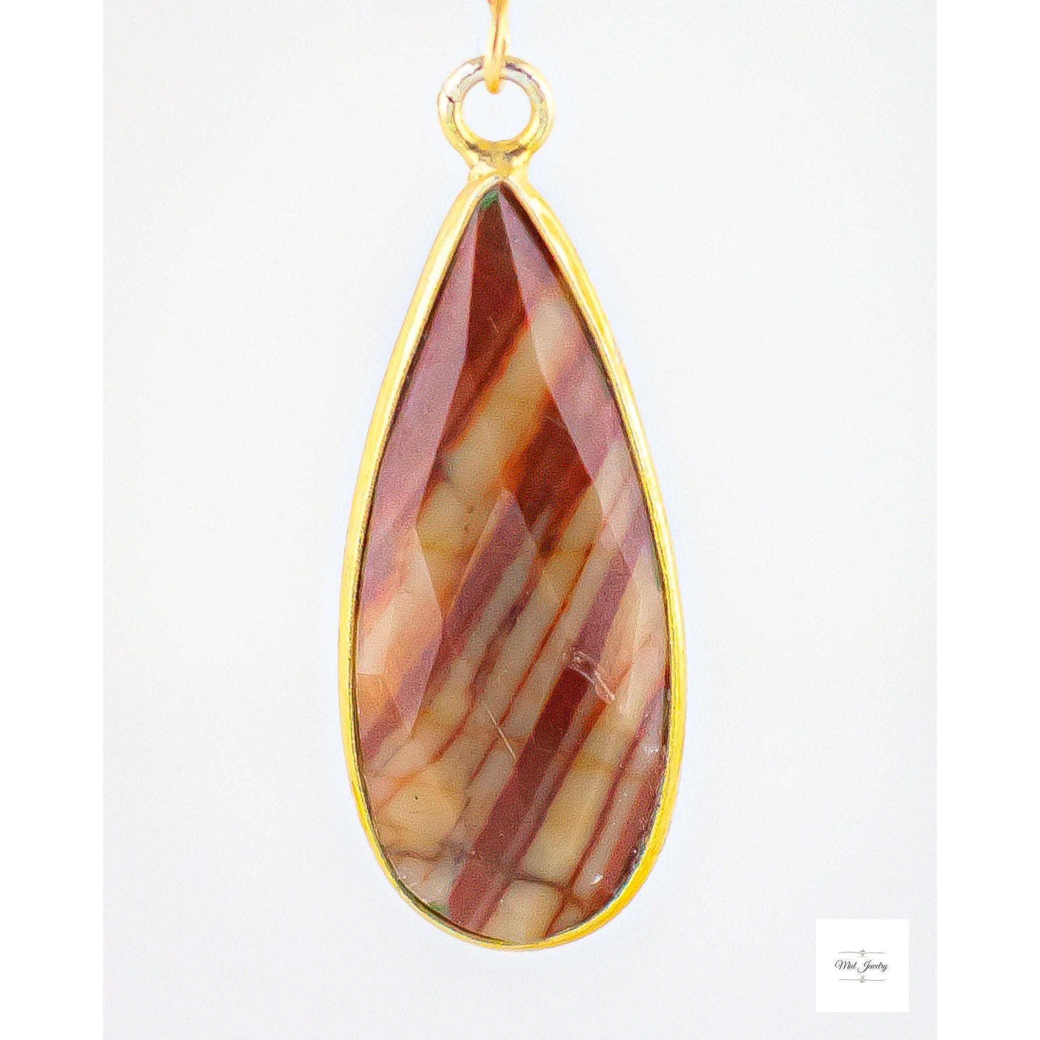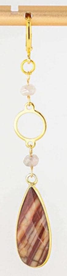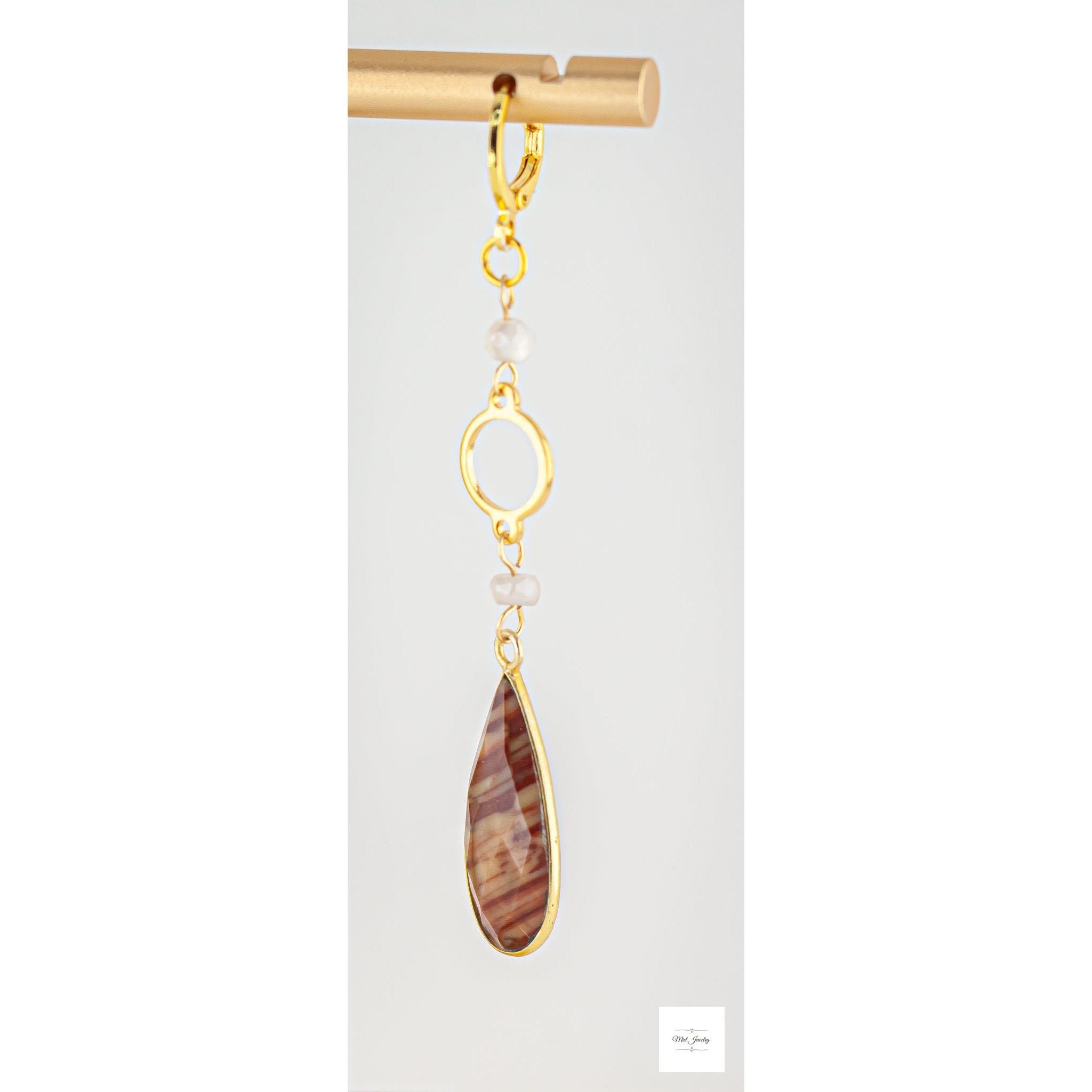 These earrings terracotta red jasper and luminous mystic moonstone beads to create a unique and stunning earth toned gemstone accessory. The beautiful jasper stones boast natural patterns with matte reddish orange hues and ribbons of cream, grey, and beige. The moonstone beads have an iridescent shimmery creamy grey tone that add a touch of natures design and lovely color contrast. These beaded long gold earrings are suitable for any occasion and will surely make you stand out. They are your go-to whether you're looking for a bold everyday boho chic accessory or to add an earthy statement piece in your jasper jewelry collection for a special event.