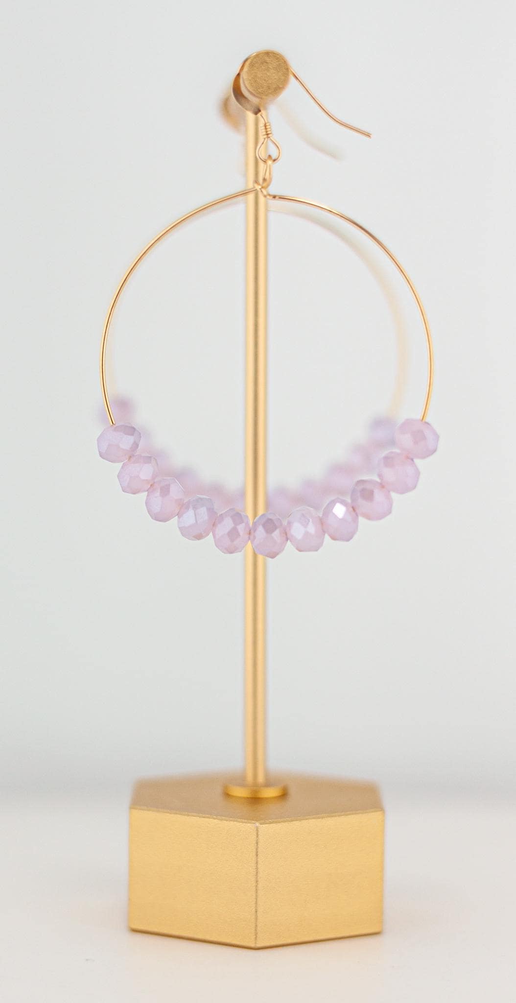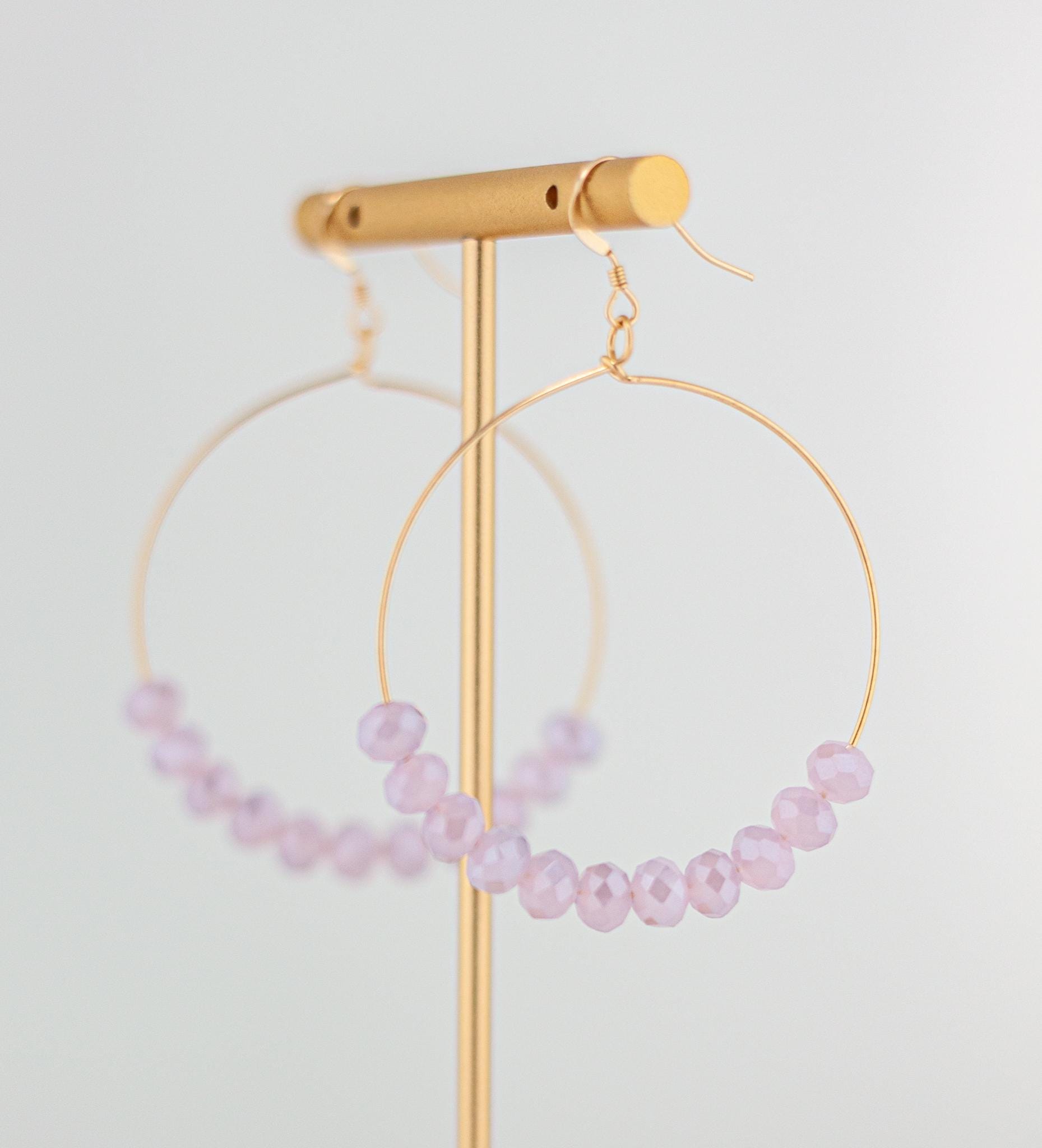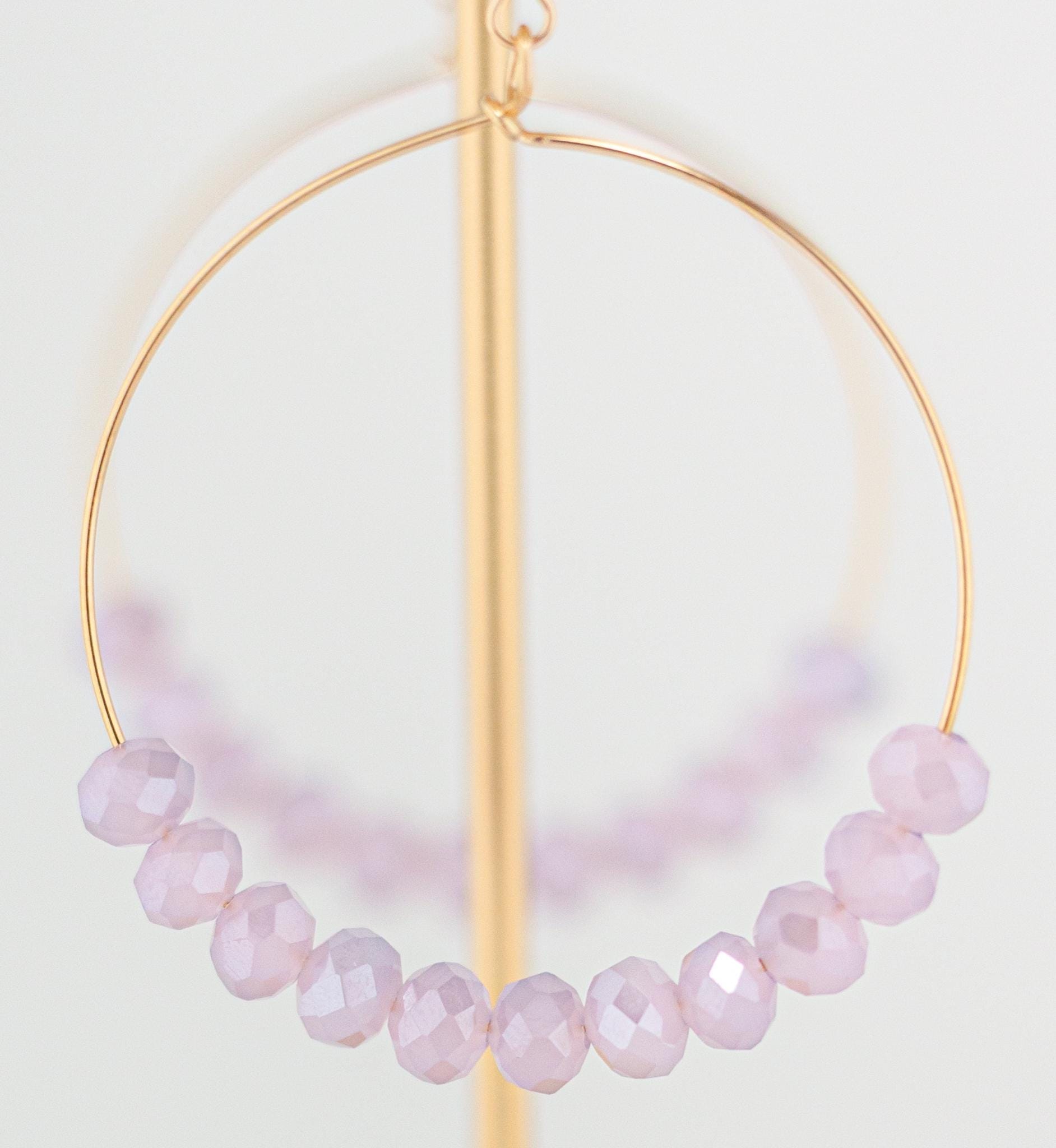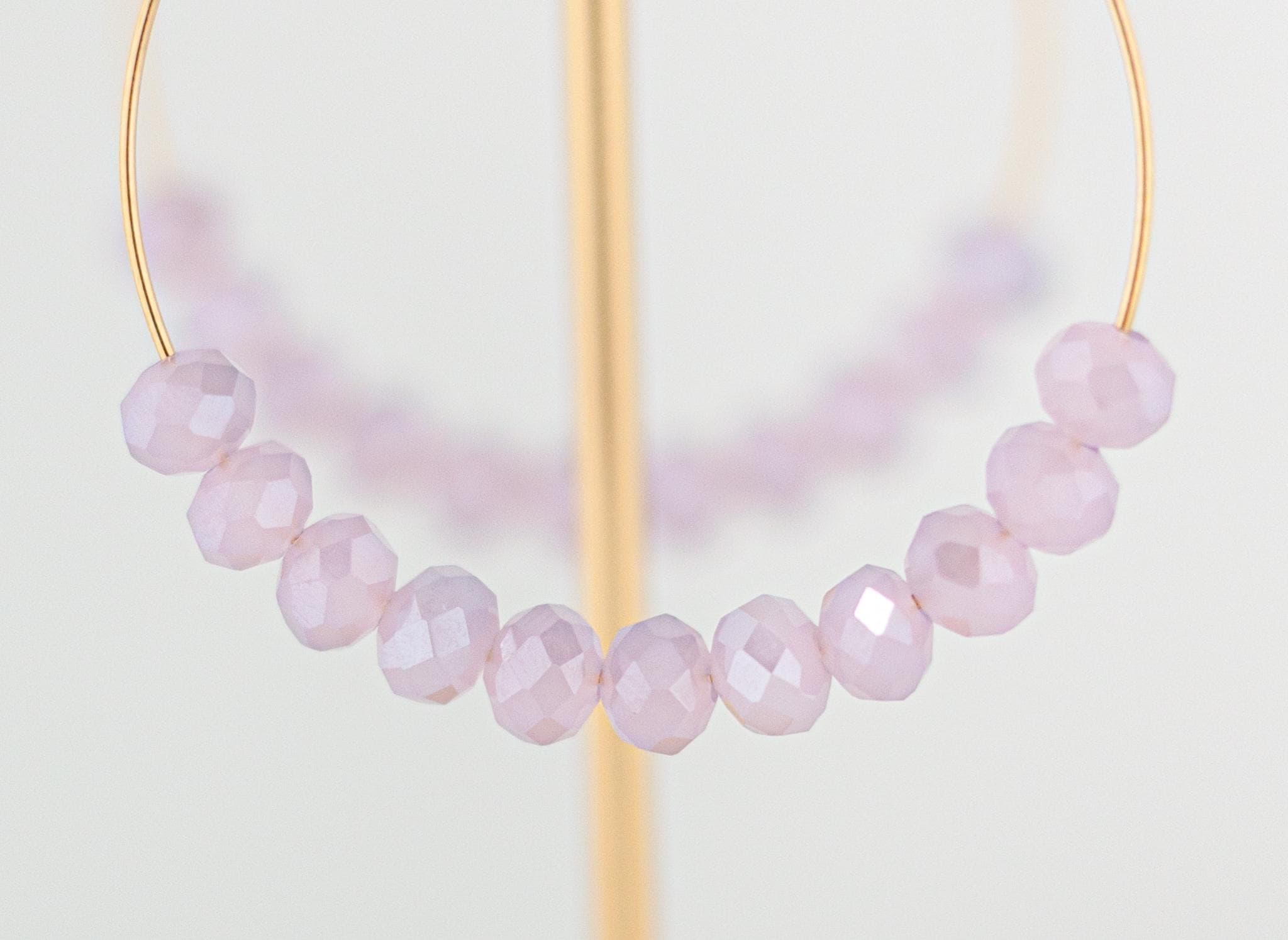 Discover the exquisite charm of our delicate beaded gold hoop earrings. Featuring light lavender purple glass beads that shimmer in the light these elegant large gold hoops have a beautiful blend of cool pastel color and warm gold tones. The dangling gold hoops add a touch of luxury, making these earrings the perfect gold and purple accessory for any occasion.