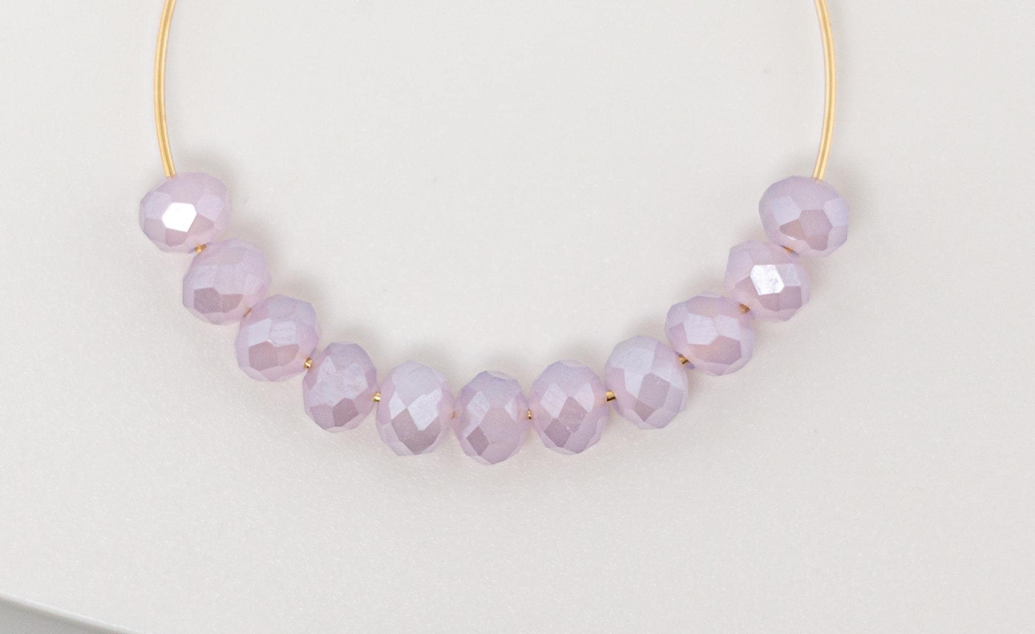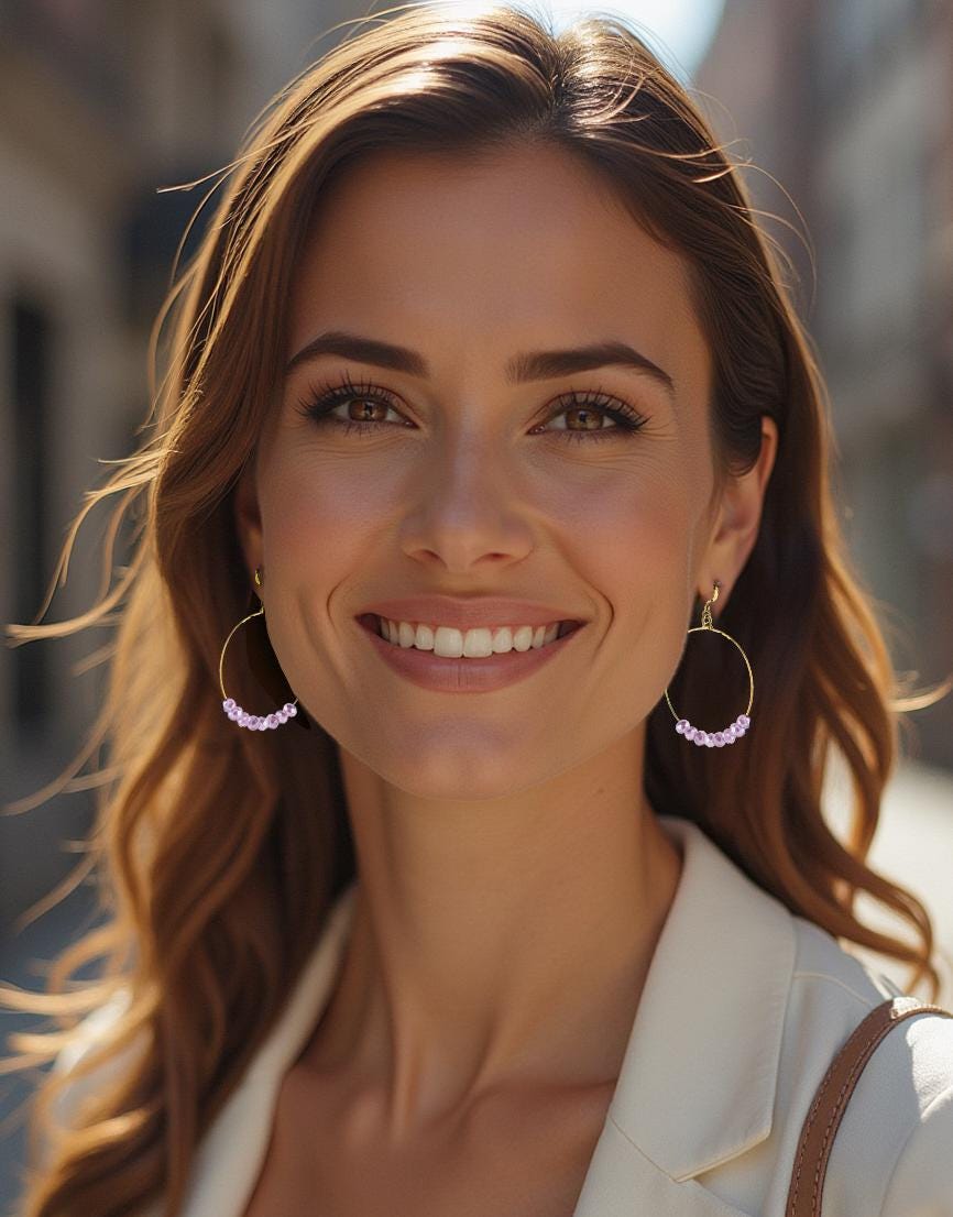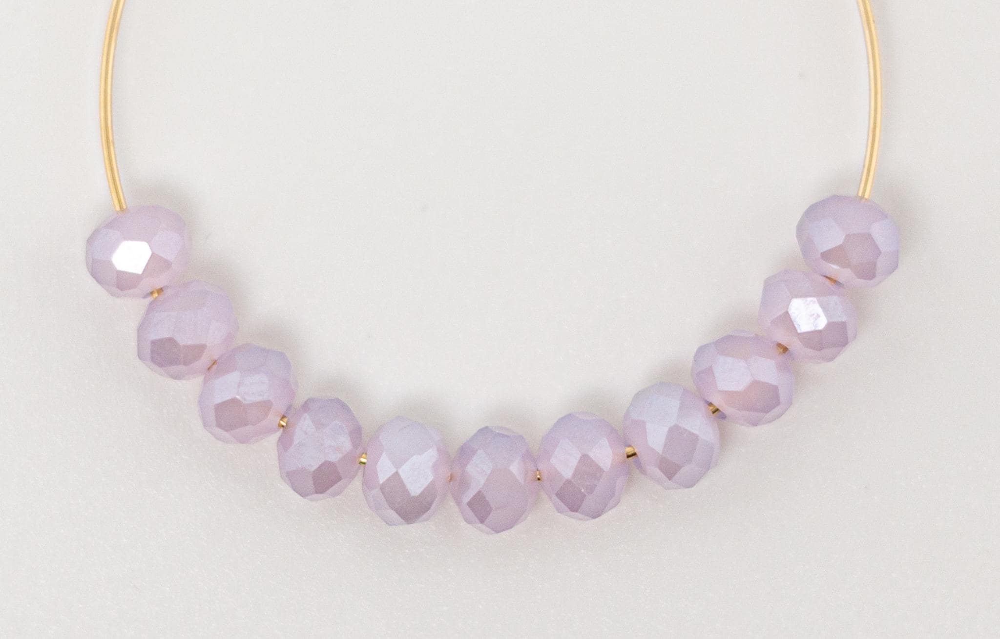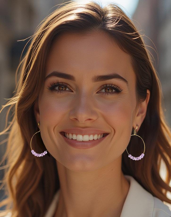 Discover the exquisite charm of our delicate beaded gold hoop earrings. Featuring light lavender purple glass beads that shimmer in the light these elegant large gold hoops have a beautiful blend of cool pastel color and warm gold tones. The dangling gold hoops add a touch of luxury, making these earrings the perfect gold and purple accessory for any occasion.