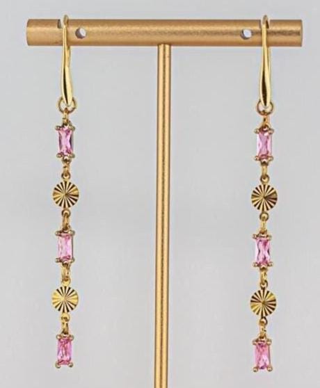 Embrace timeless style with these Elegant Vintage-Inspired Long Gold dangle Earrings. These pretty crystal statement earrings features a retro Art Deco-inspired design with rectangular shaped light rose pink glass links and intricate geometric gold connectors. Ideal for bridesmaids, weddings, date nights, or everyday accessories. A lightweight and versatile glass accessory that seamlessly transitions from casual to formal settings. These long glamorous pink earrings pair effortlessly with any outfit, mixing classic girly subtle sparkle and timeless feminine charm with minimal modern chic drop earring ensuring you shine wherever you go!