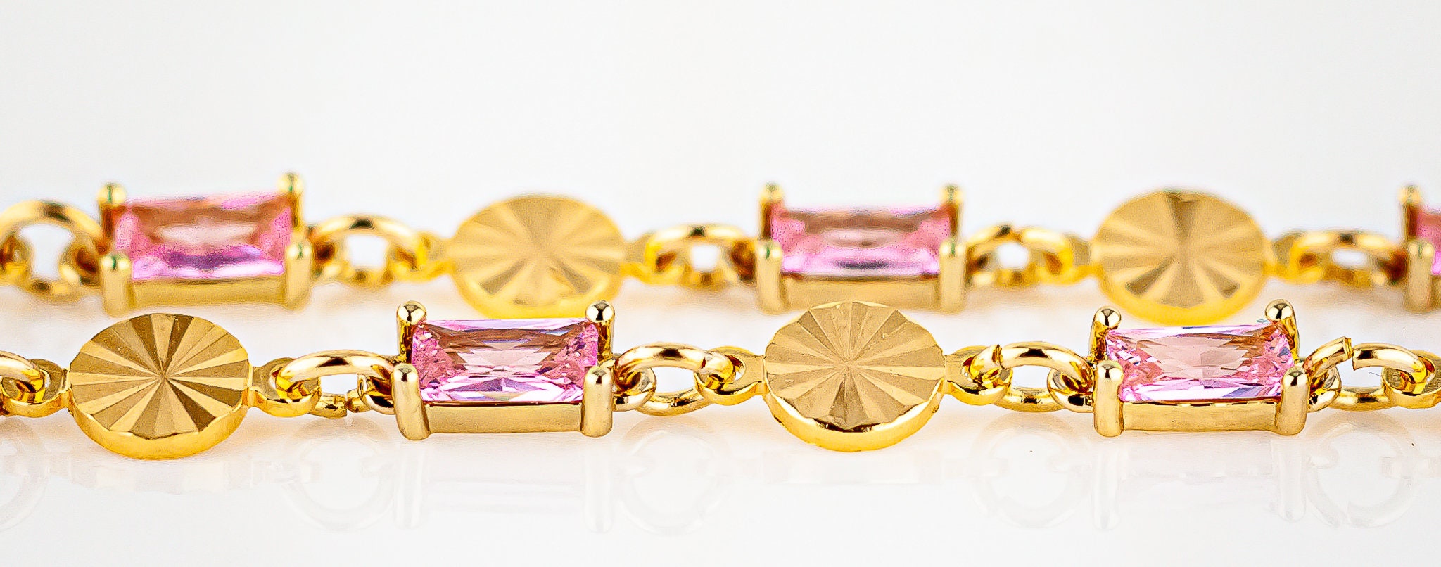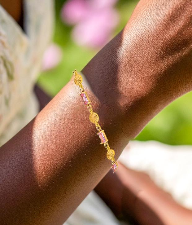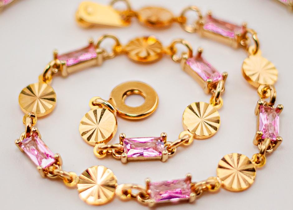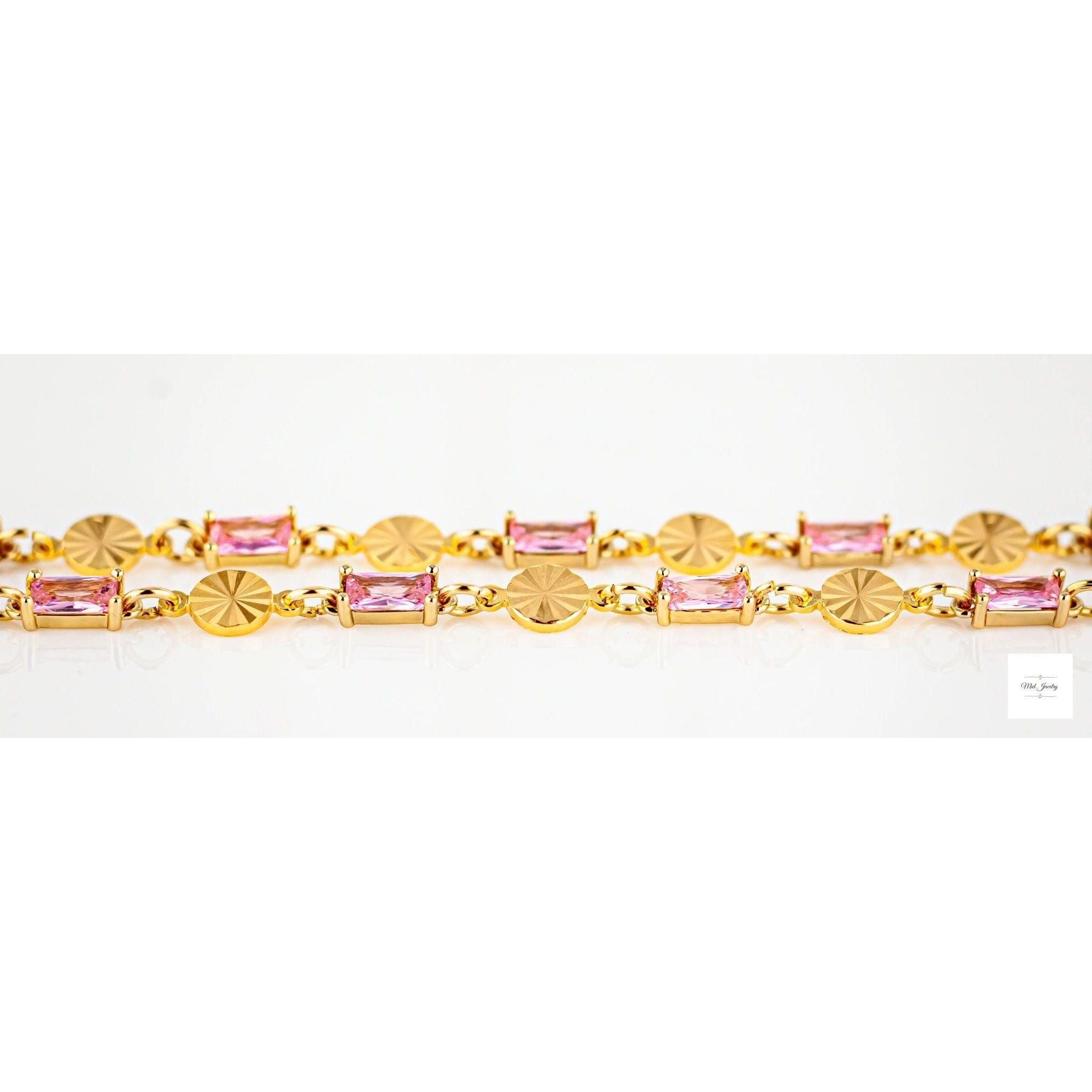 Enhance your jewelry pink collection with this exquisite glass bracelet. This dainty gold link bracelet features an Art Deco-inspired design with pink glass accents and intricate geometric gold connectors. It combines retro vintage style, and a minimal modern take on the classic tennis style bracelet. This sparkly geometric bracelet is a feminine, timeless and versatile piece that will make you feel effortlessly stylish; and is a versatile accessory that seamlessly transitions from casual to formal settings. Perfect for adding a subtle pop of color to any outfit, this cute light rose pink bracelet ideal for both everyday wear and special occasions.