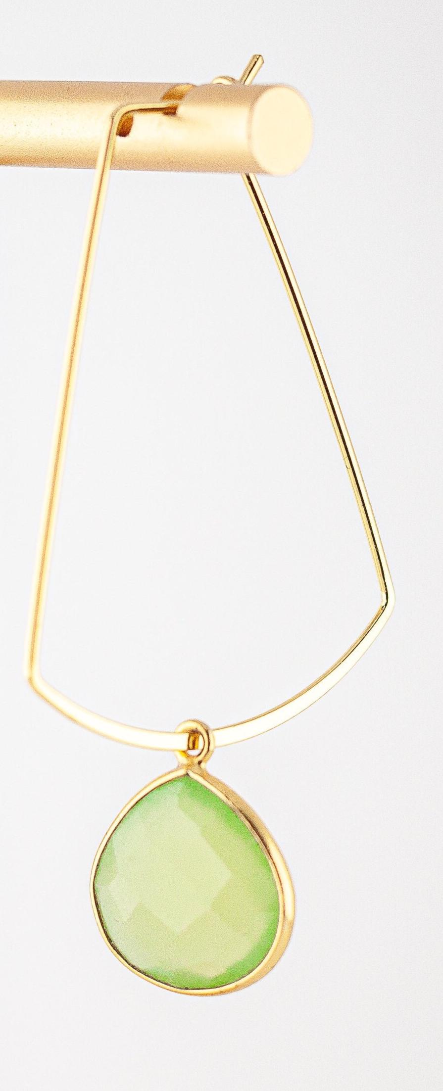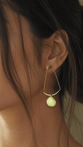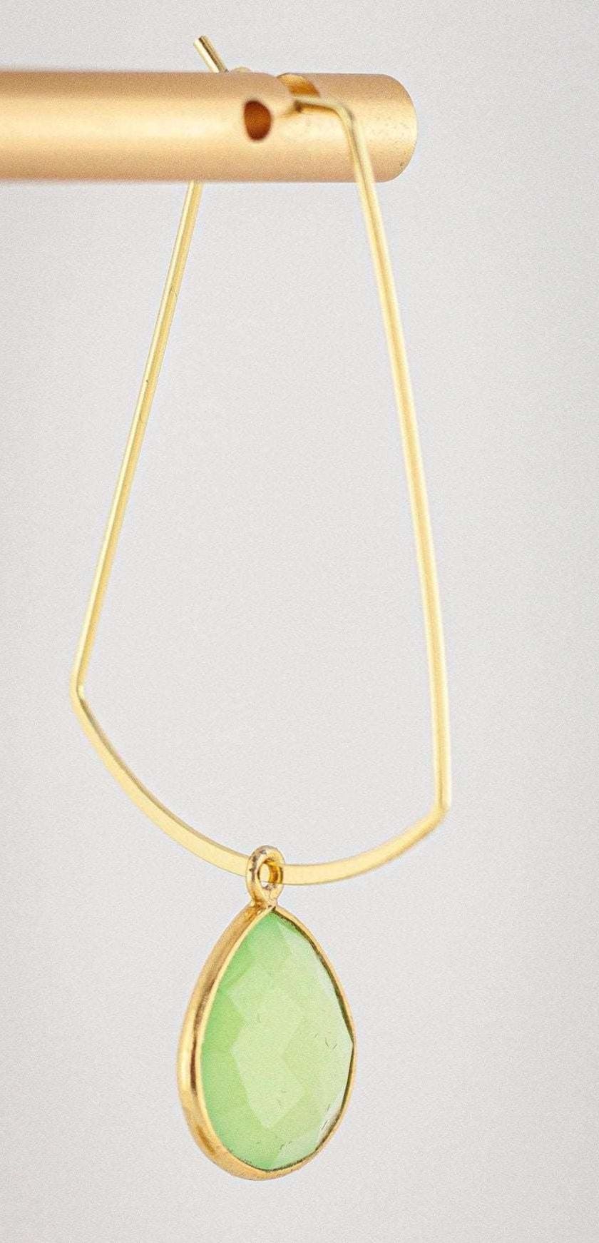 A stunning addition to any jewelry chalcedony jewelry collection, these large gold hoop earrings feature shimmering lime green gemstones and log dainty 14K plated bow-shaped ear wires. These gorgeous boho luxe gold drop earrings will make a statement and ignite conversations wherever you go. From dressing up for a night out to adding a touch of stylish glamour to your everyday look, these beautiful bold and bright green earrings are perfect for any occasion.