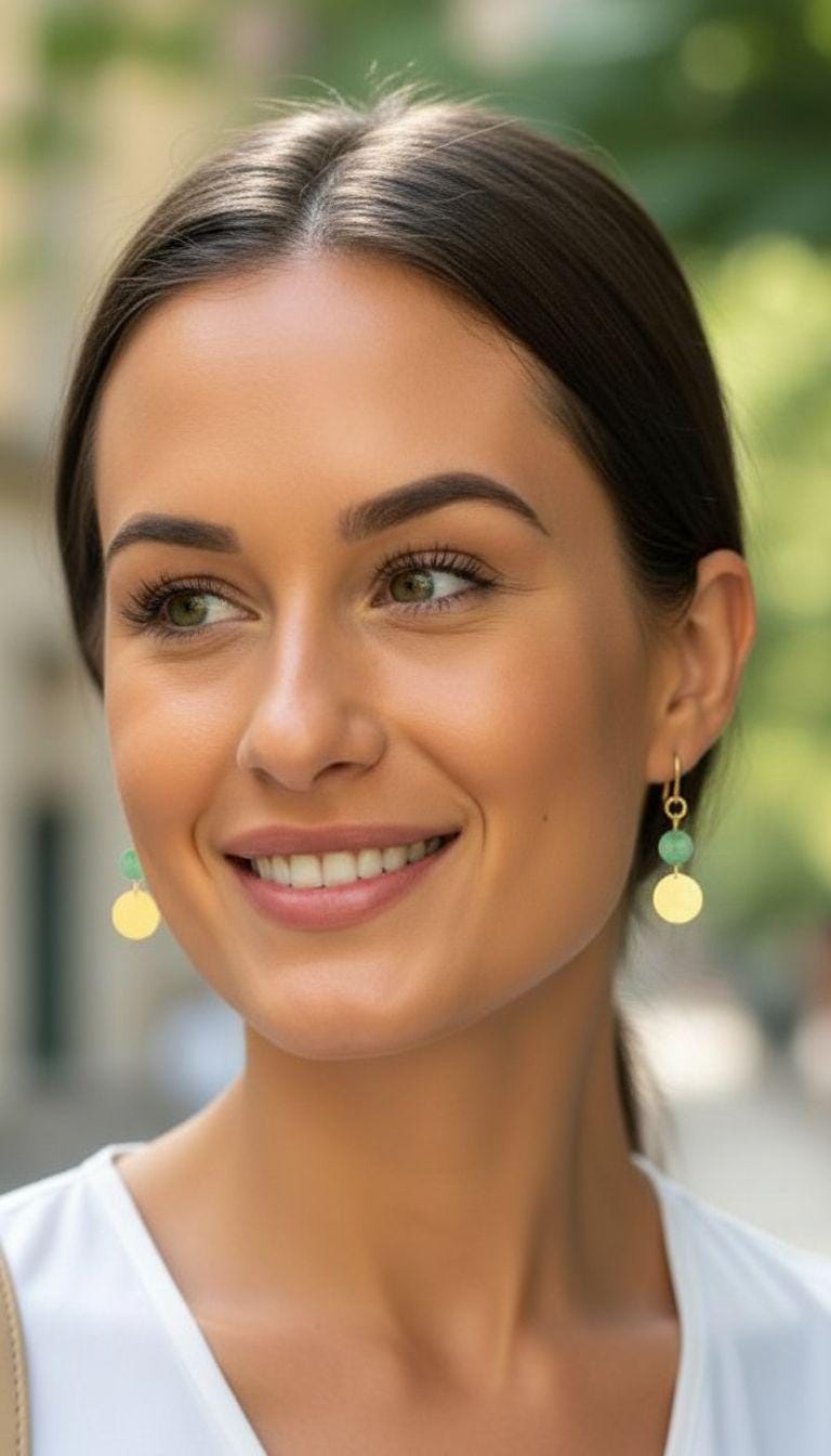 Indulge in the versatile pretty boho chic beauty of these Green Aventurine Earrings. These dainty gold earrings embody modern elegance with shimmery sage green aventurine beads, bright gold circular drops. They add a touch of understated sophistication to any outfit, with their lustrous white moonstone beads and gleaming gold drops. are an everyday jewelry essential that seamlessly transitions from the office to happy hour. Elevate your style with these nature-inspired stylish gold drop earrings, adding a touch of sophistication to every outfit. These lightweight, beaded earrings add simple elegance, and are effortless to wear. Elevate your aventurine jewelry collection with these pretty bohemian dangles - the perfect earrings for everyday wear, office outfit and special occasions.