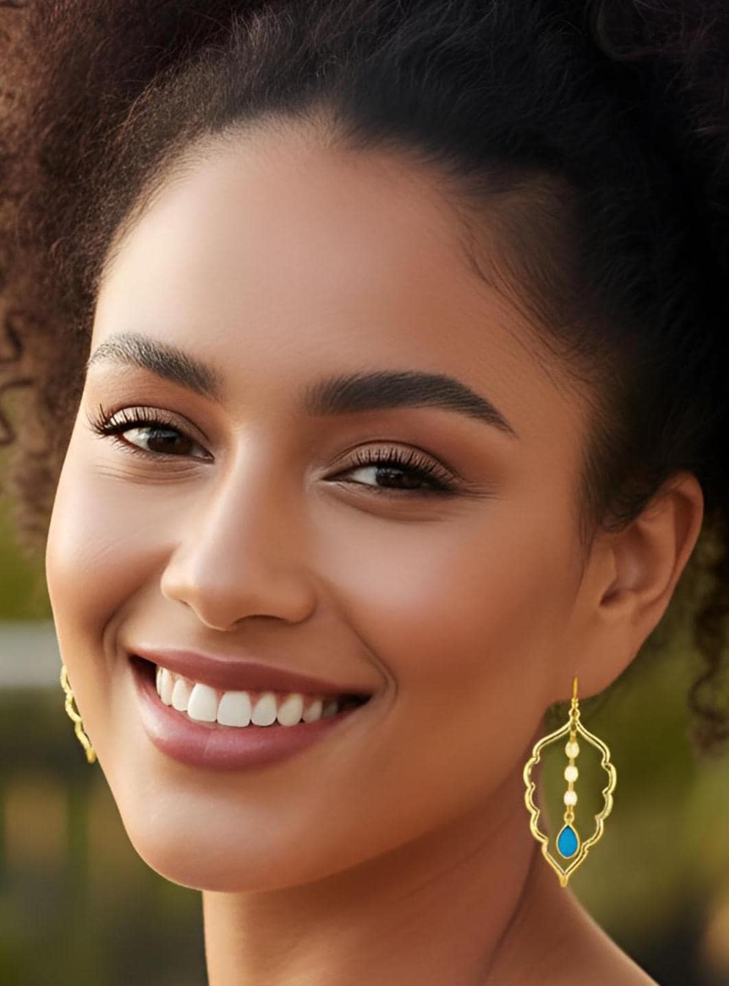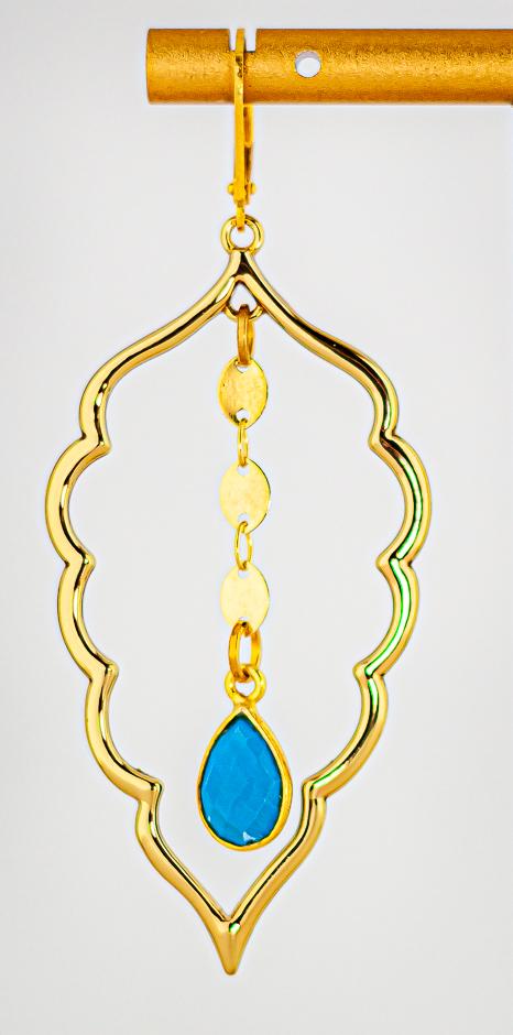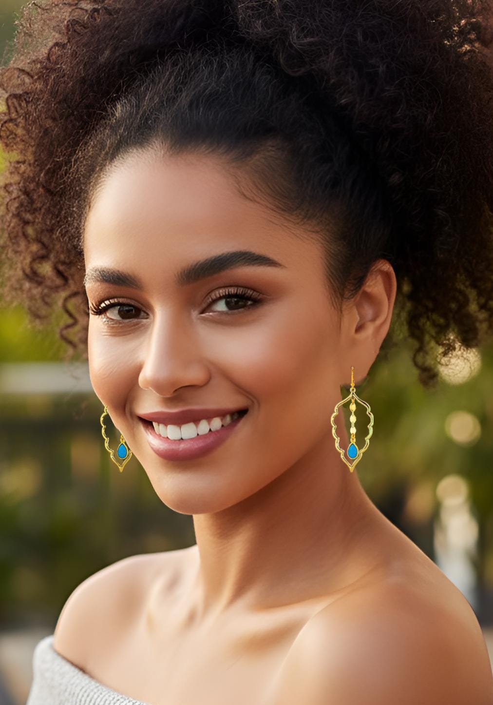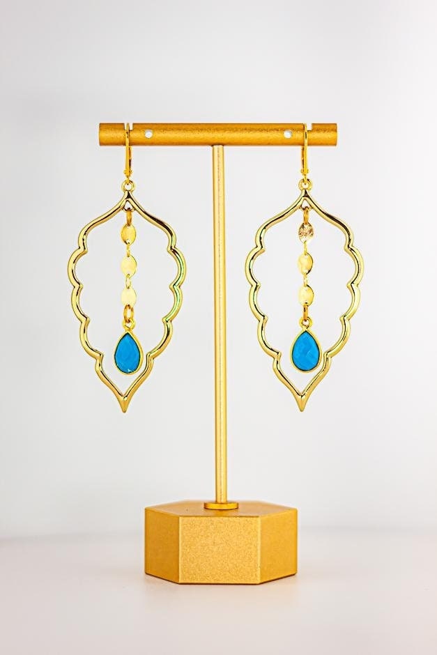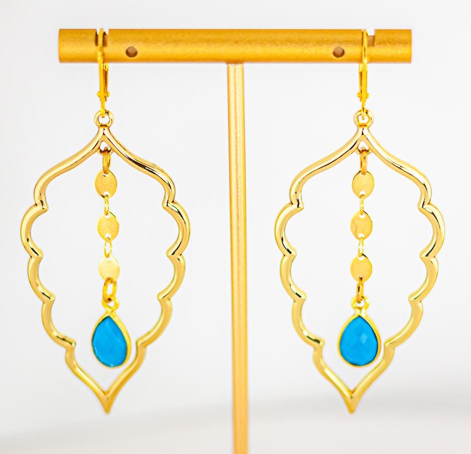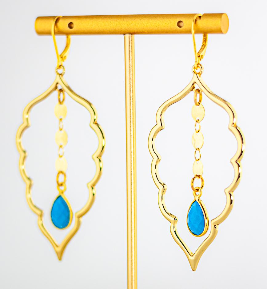 Experience the captivating charm of these chic boho luxe Turquoise Howlite & Gold Statement Earrings. These big, bold, and lightweight gold dangle earrings are an essential addition to your statement jewelry collection. Adorned with vibrant light blue howlite stones, they radiate a striking color combination that instantly captures attention. The bright blue gemstones dangle from on a shimmering gold chain from a 14K gold-plated scalloped geometric frame that makes these long drop earrings truly stand out. These large gold and blue earrings provide comfort and security, complete with gold-plated sterling silver lever backs and a gleaming oval-link gold chain. Unique, modern and artistic they are perfect for date night, a wedding guest outfit, happy hour, or a special occasion. Don't miss out on this unique and alluring pair of glamorous gold statement earrings that will have you turning heads wherever you go!