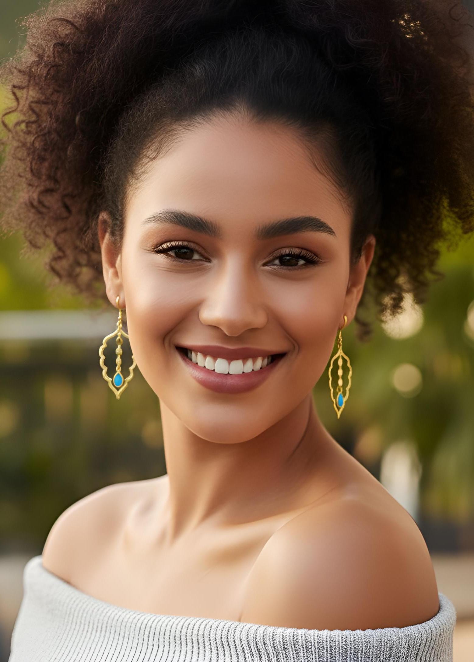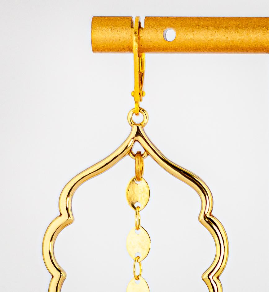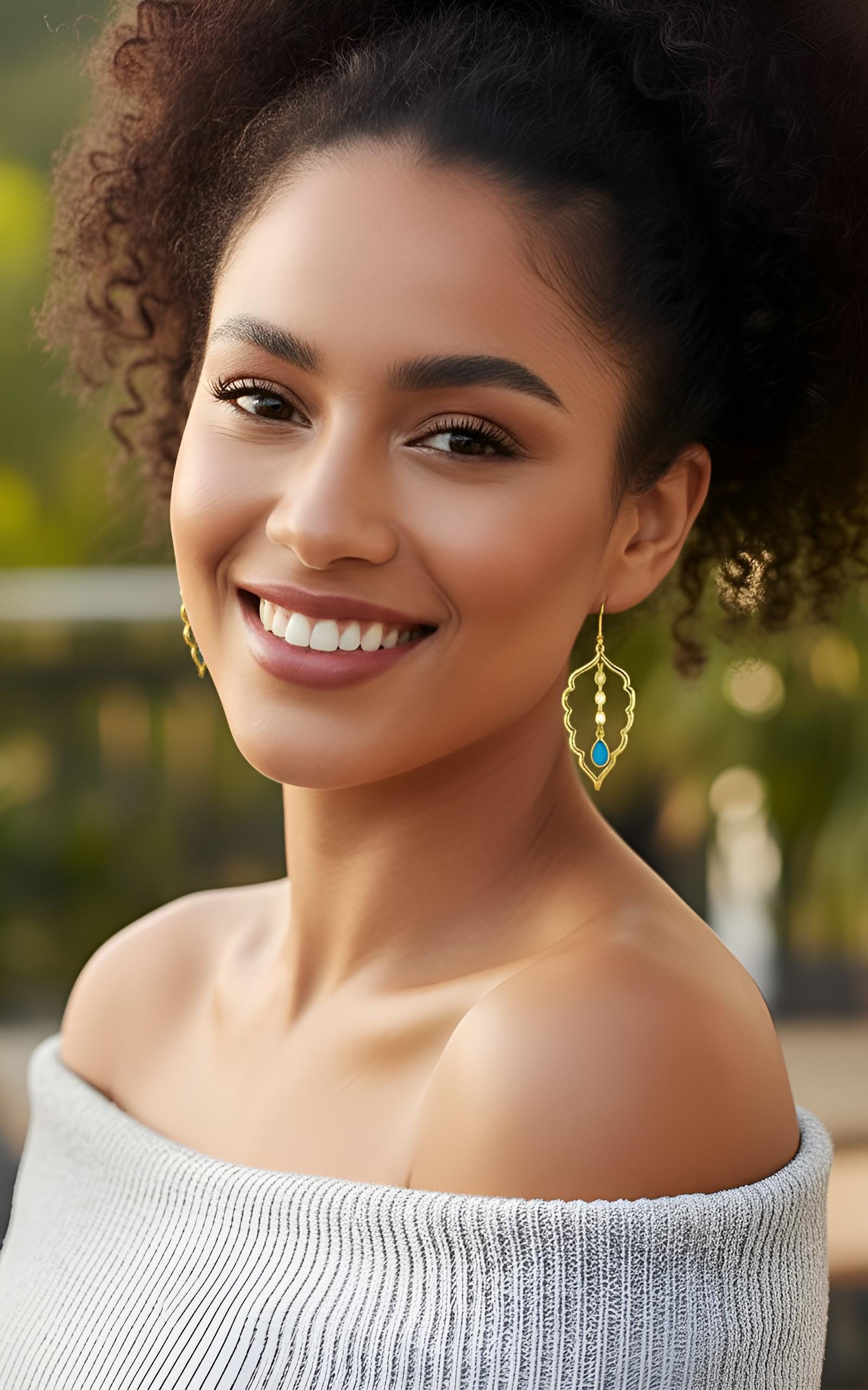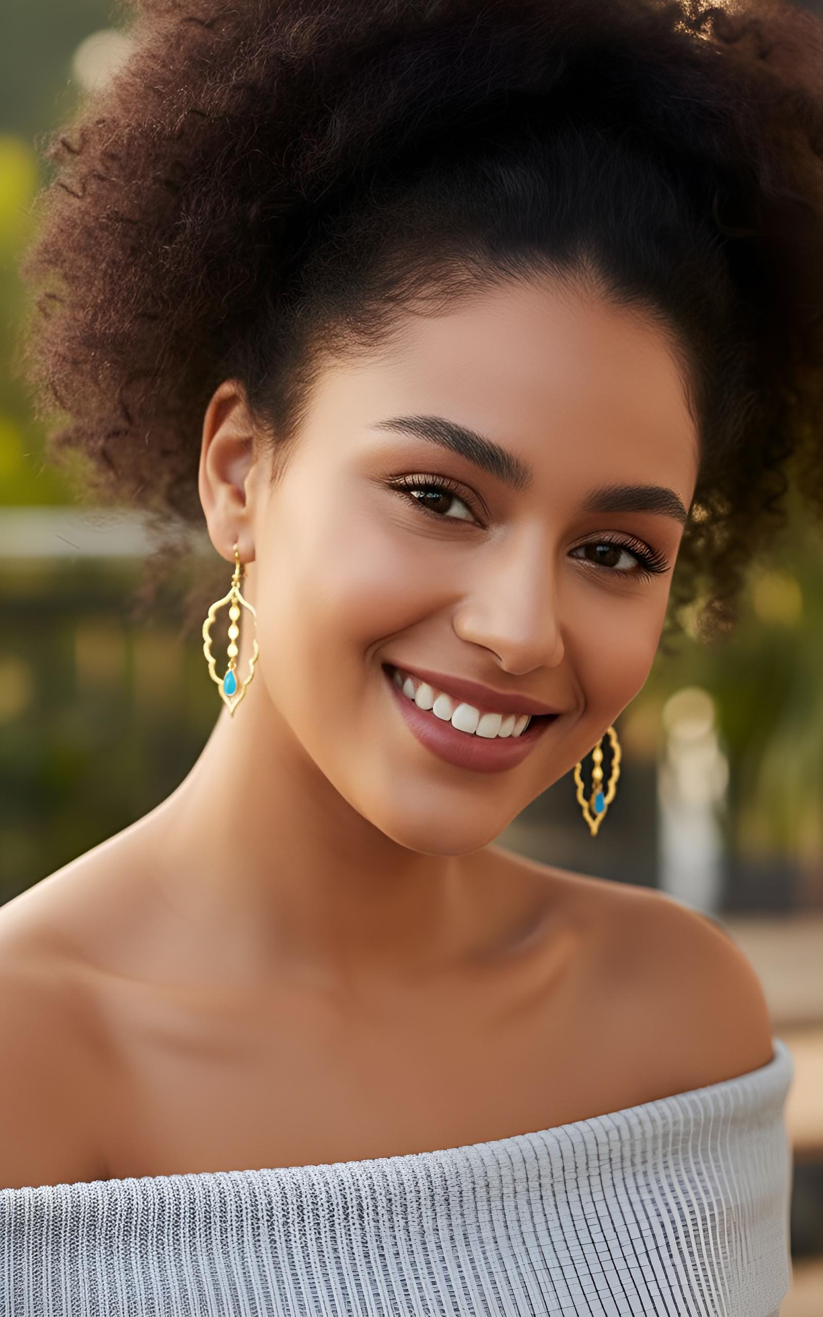 Experience the captivating charm of these chic boho luxe Turquoise Howlite & Gold Statement Earrings. These big, bold, and lightweight gold dangle earrings are an essential addition to your statement jewelry collection. Adorned with vibrant light blue howlite stones, they radiate a striking color combination that instantly captures attention. The bright blue gemstones dangle from on a shimmering gold chain from a 14K gold-plated scalloped geometric frame that makes these long drop earrings truly stand out. These large gold and blue earrings provide comfort and security, complete with gold-plated sterling silver lever backs and a gleaming oval-link gold chain. Unique, modern and artistic they are perfect for date night, a wedding guest outfit, happy hour, or a special occasion. Don't miss out on this unique and alluring pair of glamorous gold statement earrings that will have you turning heads wherever you go!
