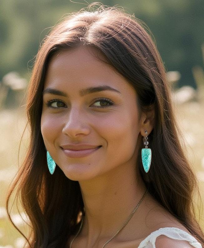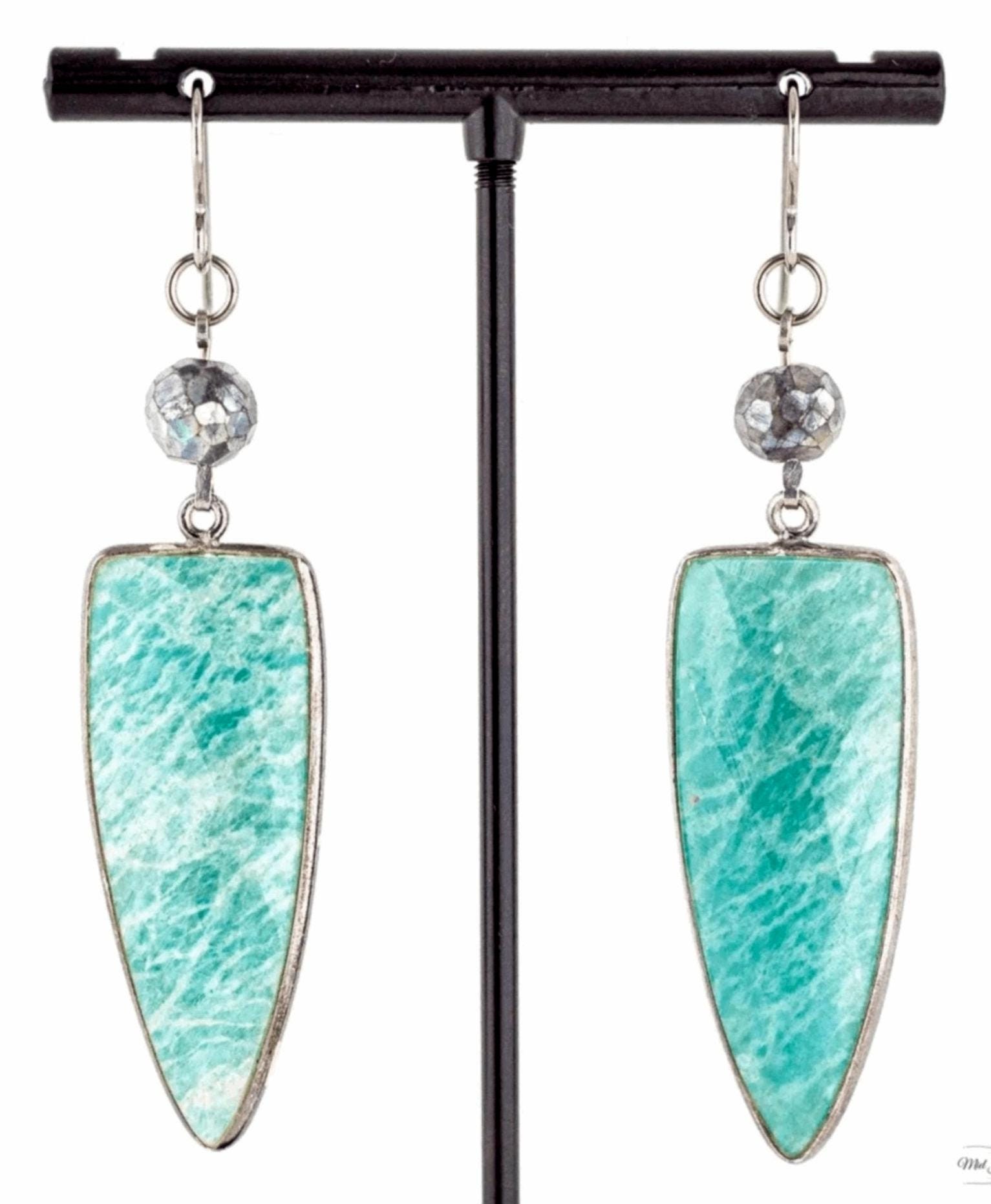 Embrace the spotlight with these stunning boho luxe Amazonite earrings, perfect for those seeking big bold statement earrings that combine timeless elegance with elevated boho chic style. The natural point shaped amazonite stones, adorned by natures beauty - boast natural patterns in dominant shades of dark teal green, mint, and subtle ribbons with hues of pale yellow, aquamarine seafoam green, white, beige and cream.