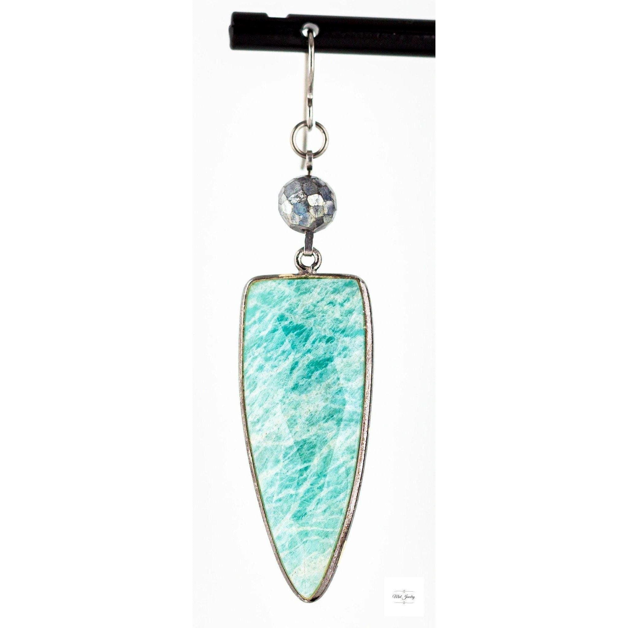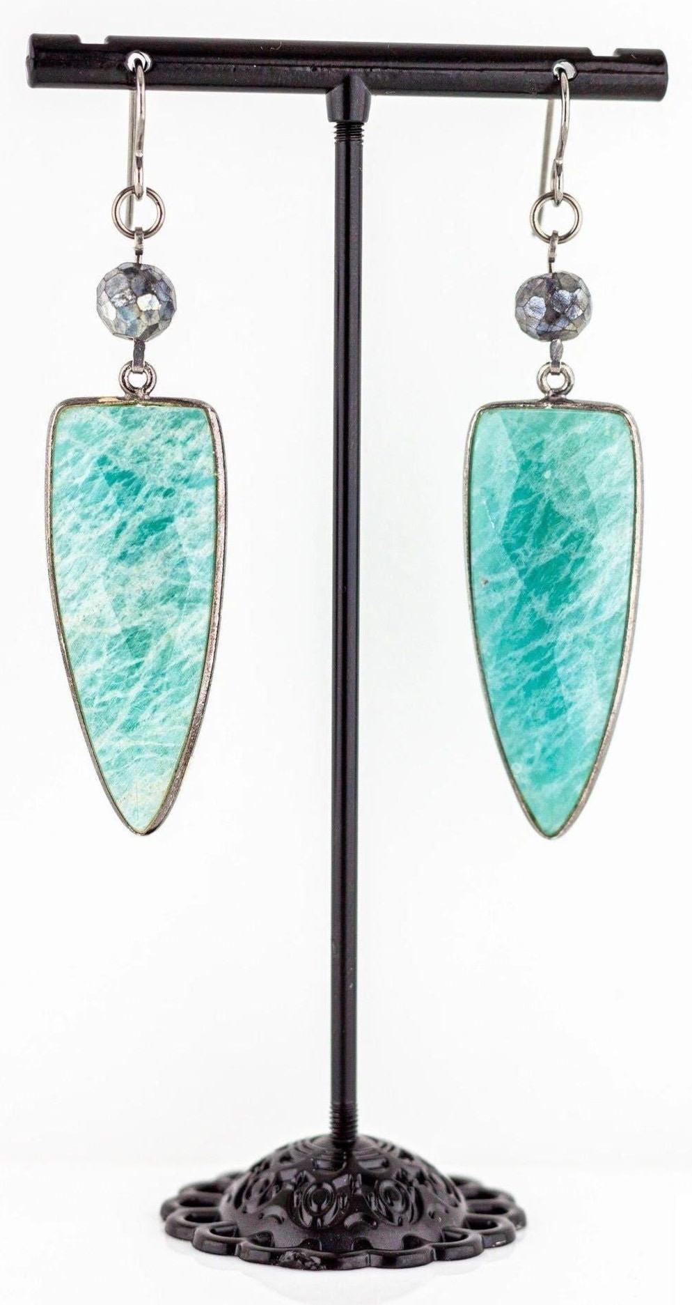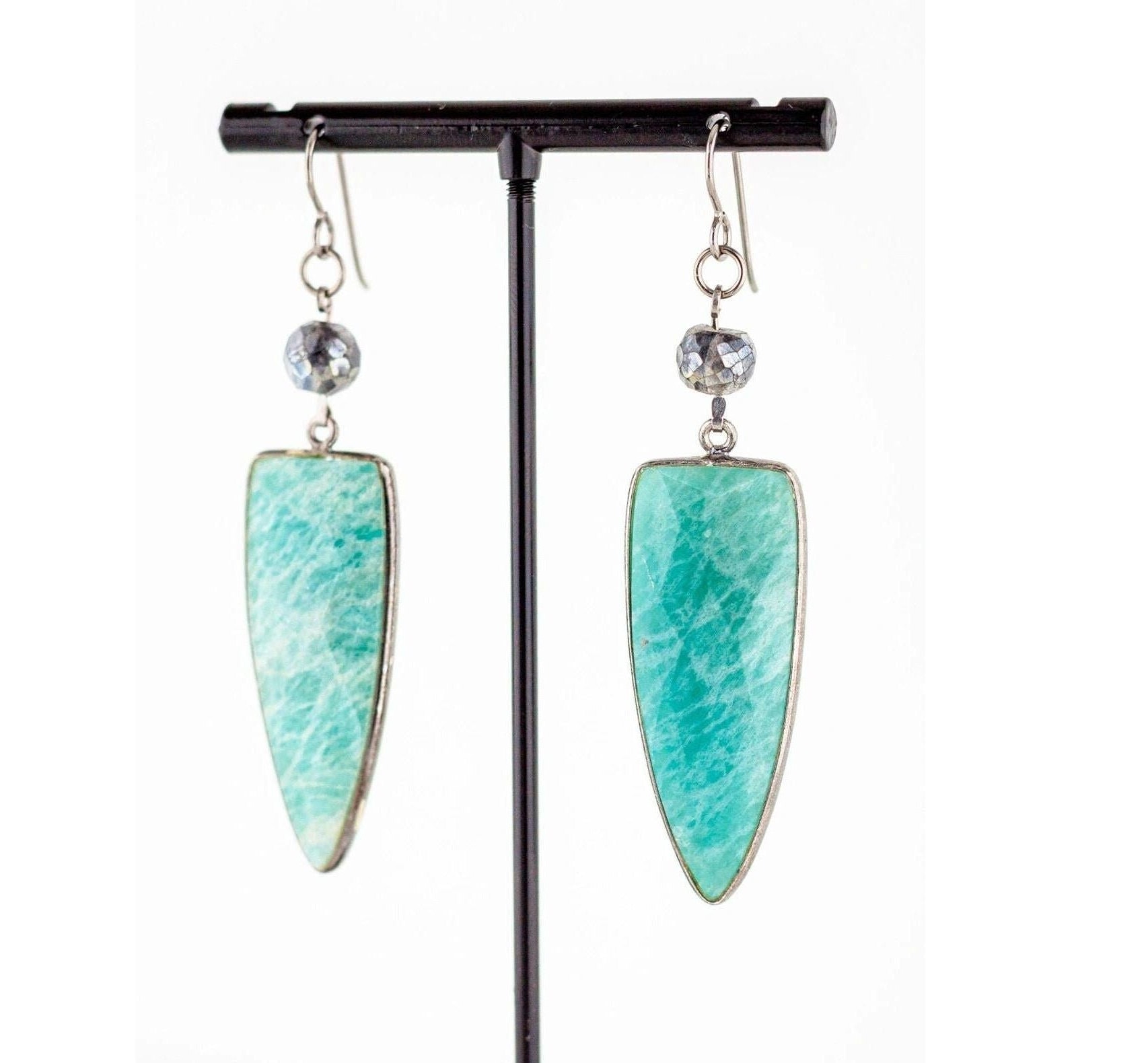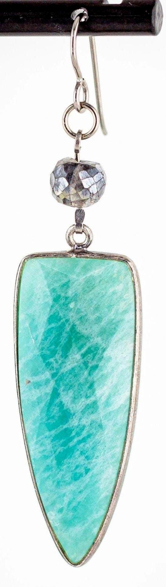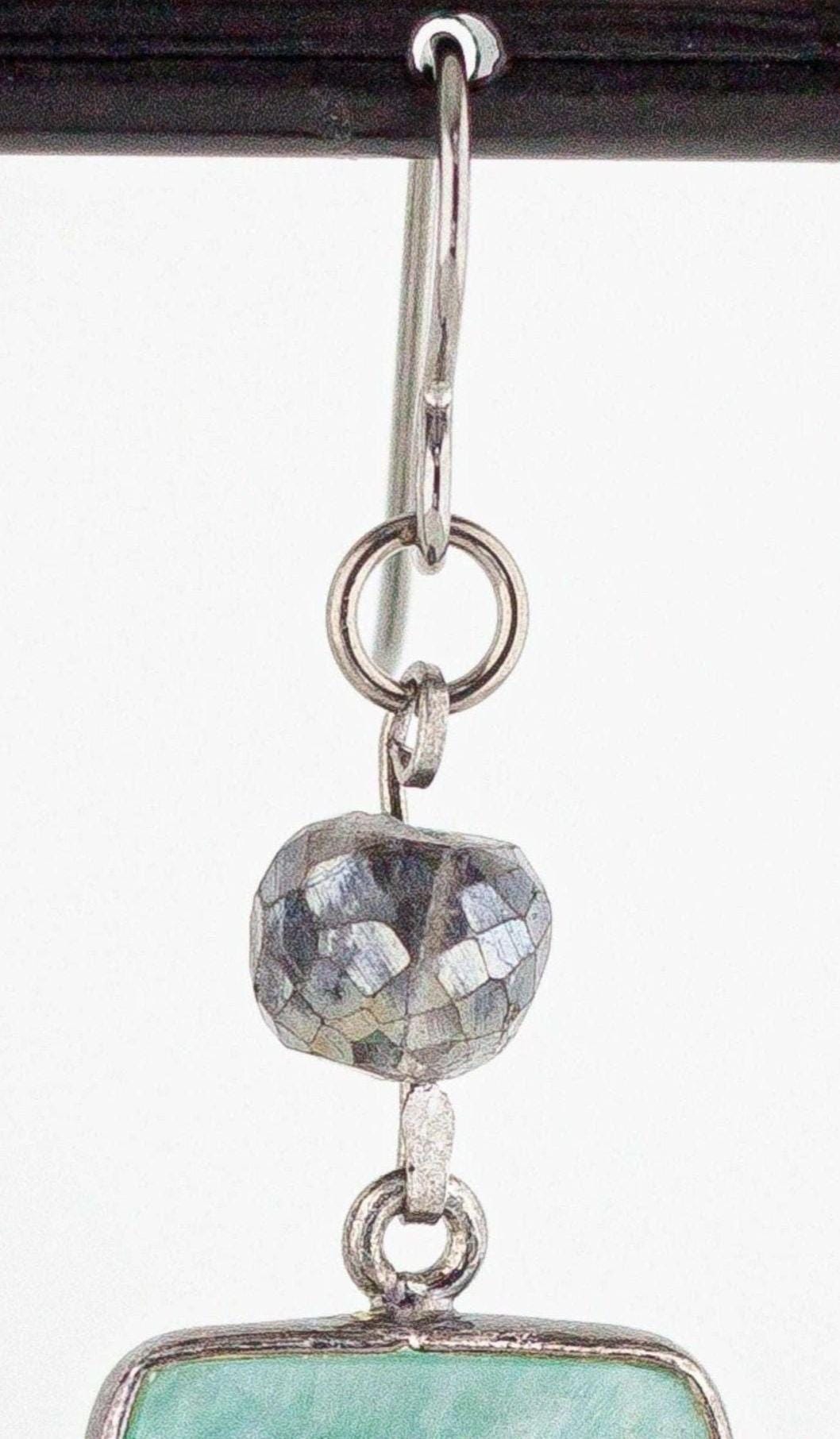 Discover the allure of our Green Amazonite & Grey Labradorite Earrings, a must-have for adding boho chic sophistication to your wardrobe. These gorgeous and unique Amazonite earrings feature shimmering raw Amazonite stones paired with iridescent grey Labradorite beads, creating a stunning blend of colors and textures in these gorgeous mint green drop earrings. These green gemstone earrings offer both modern elegance and boho luxe flair. Capture attention and elevate your amazonite jewelry collection with these limited edition green gemstone earrings. The shimmering bright pop of color in these bold Statement Earrings will captivate you with their exquisite beauty.