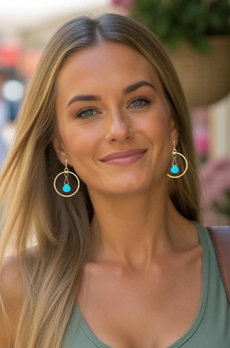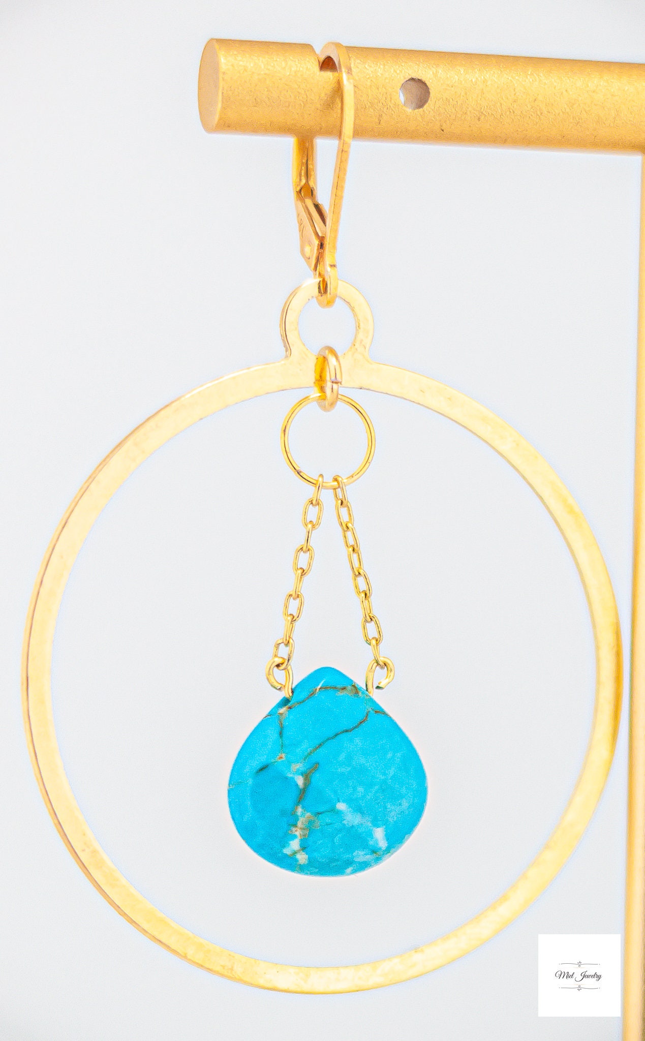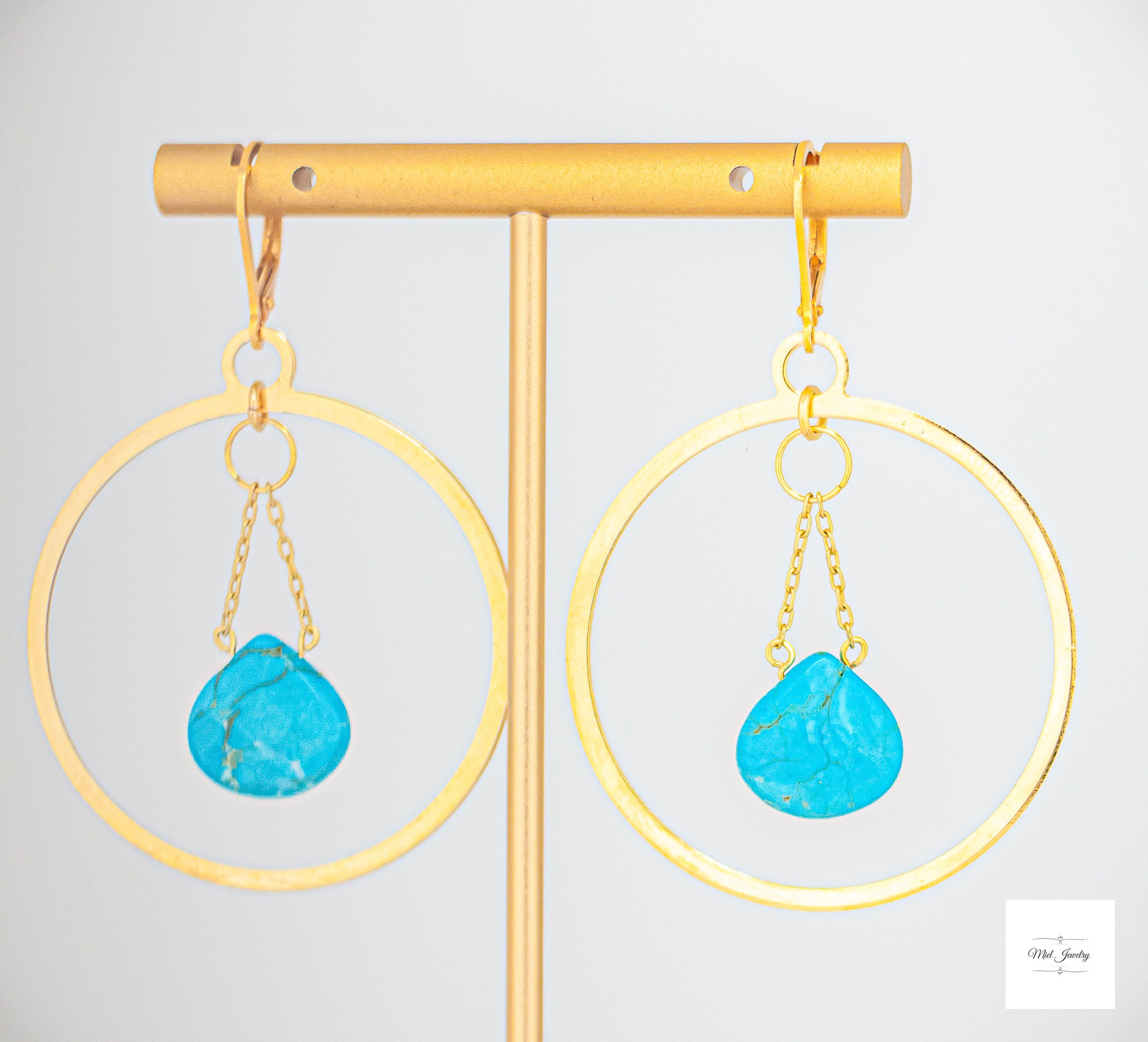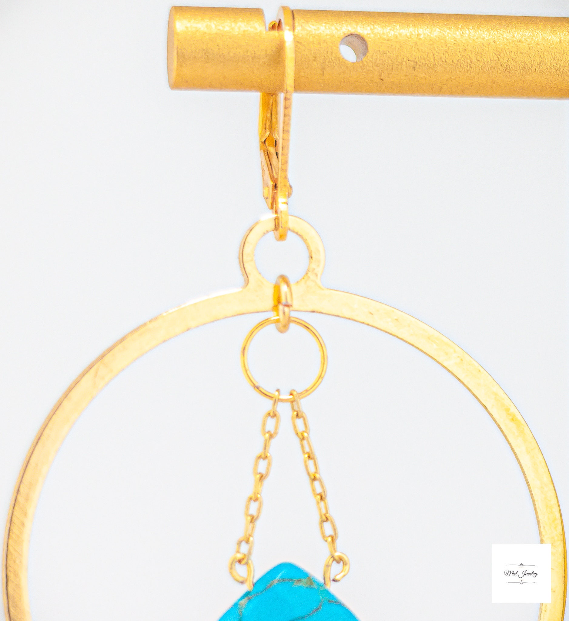 Elevate your style with the modern elegance of our Turquoise Howlite Gold Hoop Earrings. These unique large gold statement hoops feature stunning bright blue howlite beads, showcasing vibrant hues of turquoise blue with gold, white, green, brown, and lavender accents in the howlite stones. These pretty boho chic earrings are made with bright gold hoops add fun shapes and textures and combine the dangling movement of a drop earring with a geometric hoop design. Whether dressing up for a night out or adding a touch of boho chic style to your everyday look, these gold and turquoise earrings are the ideal everyday accessory in your hoplite jewelry collection.