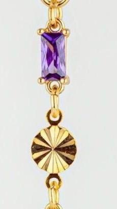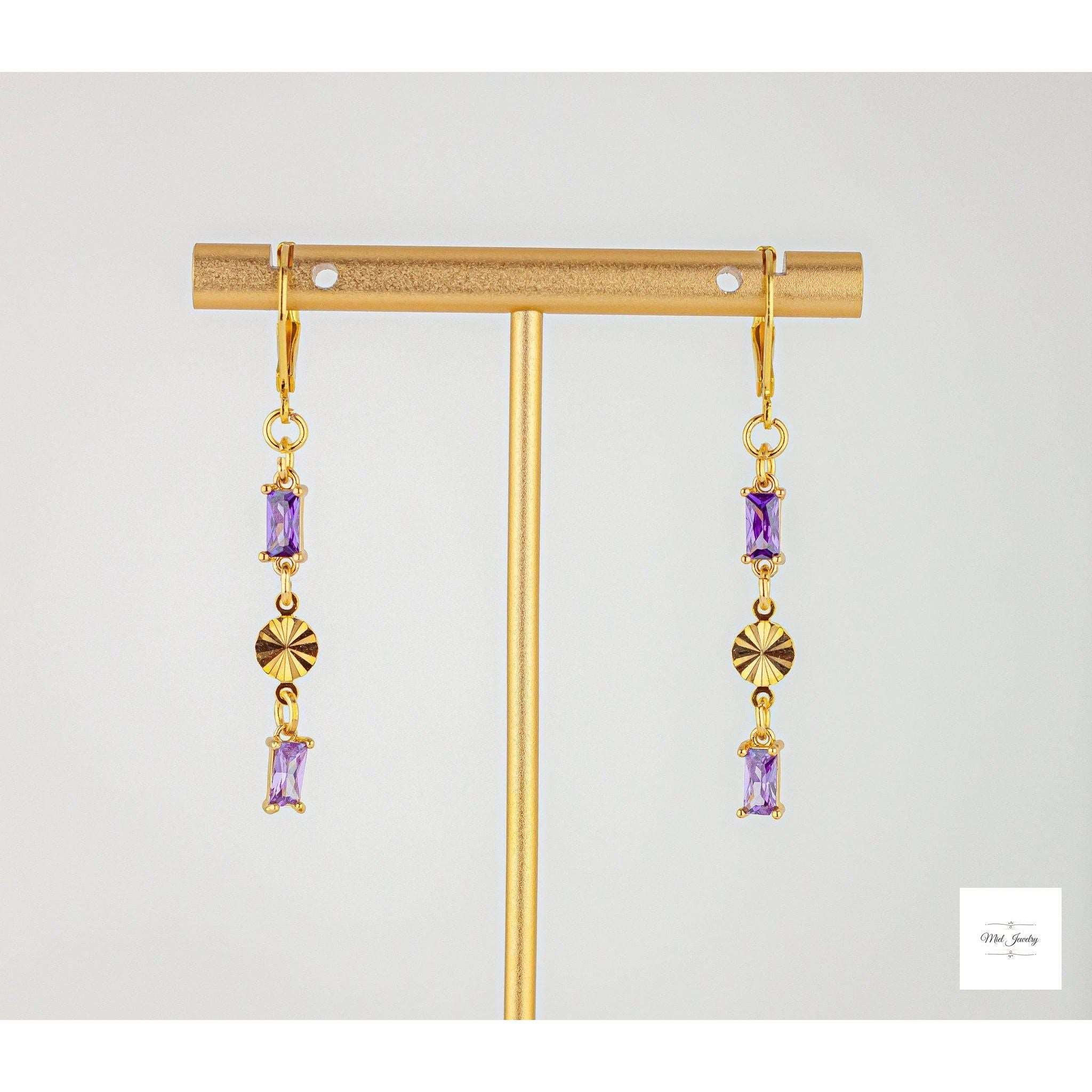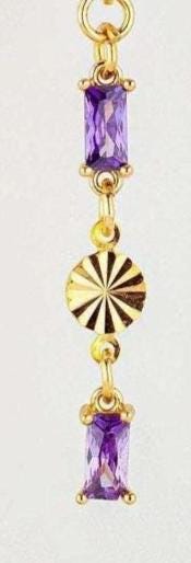 Add a touch of vintage style elegance to your look with these dainty purple earrings, featuring textured gold links and sparkly purple glass accents. The delicate rectangle-shaped gold links and pretty purple accents create a beautiful balance of modern sophistication and timeless feminine crystal dangles. Perfect for both everyday wear and special occasions, these lightweight glass earrings offer a pop of lilac color and subtle sparkle that is eye-catching yet won’t overpower your look. Crafted from high-quality, hypoallergenic materials, these pretty gold drop earrings are designed for comfort and lasting beauty. Elevate your everyday jewelry collection with these timeless and chic gold drop earrings.
