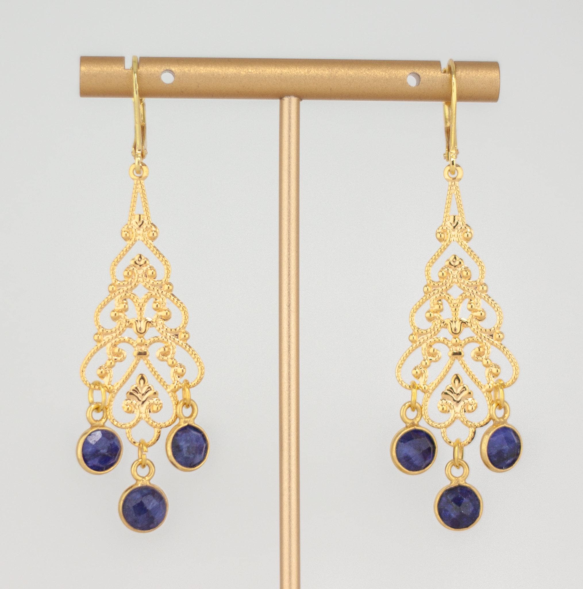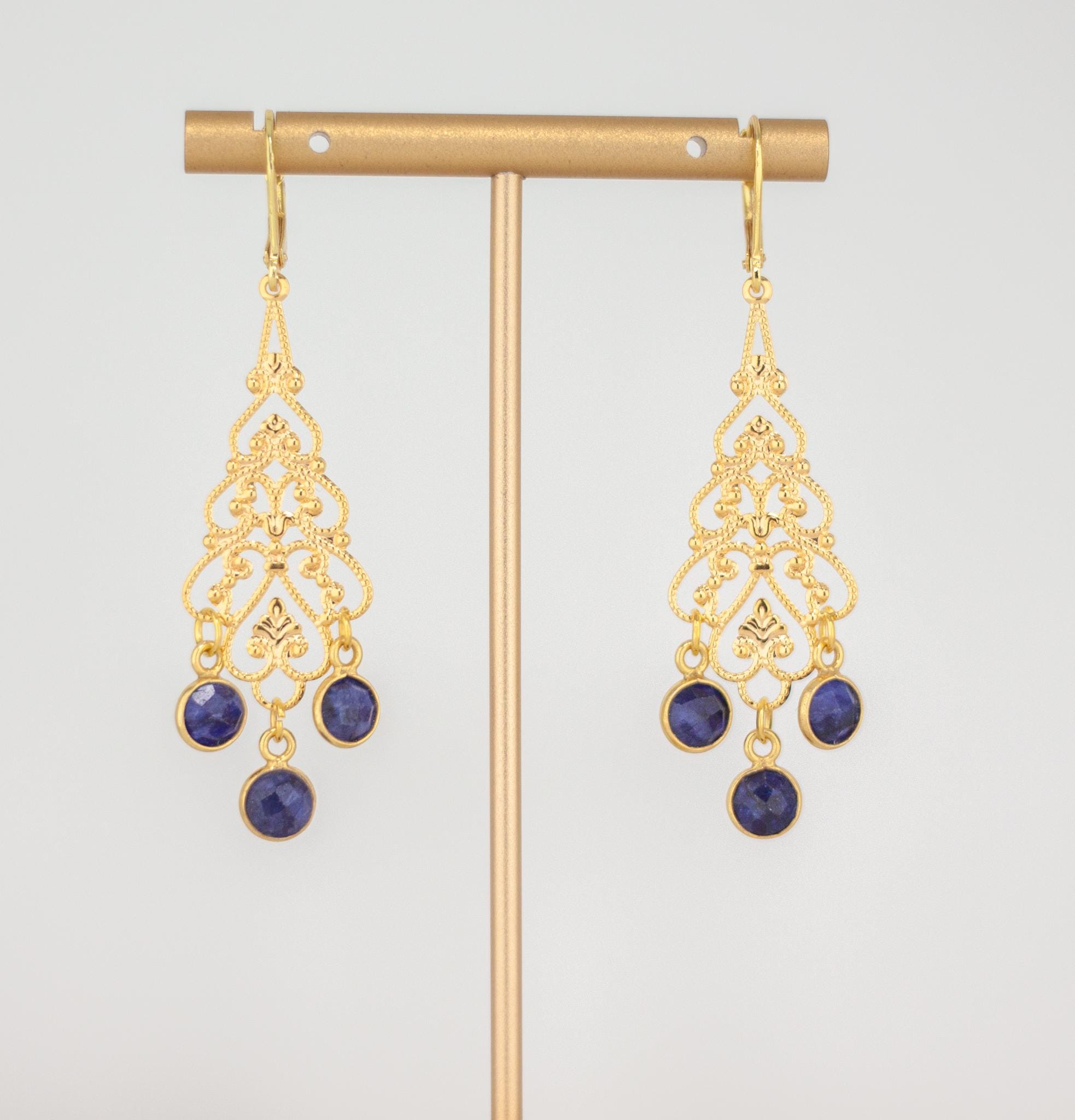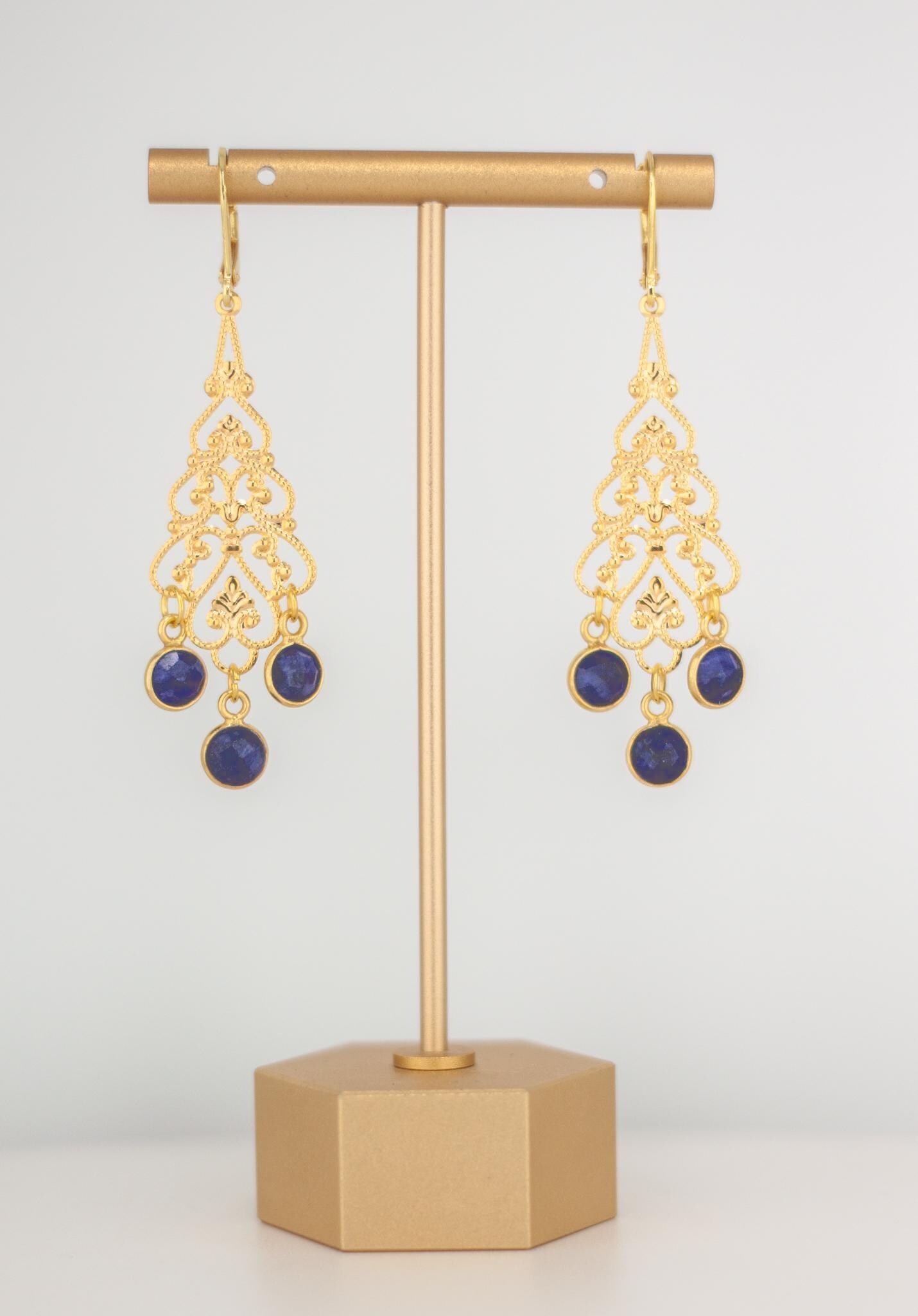 Elevate your style with these elegant Gold Filigree Dangle Earrings featuring deep royal navy blue quartz gemstones. The intricate filigree design of these boho luxe gemstone drops exudes timeless femininity, while the rich cobalt blue quartz stones add a touch of refined sophistication and charm. These long gold dangle earrings are perfect for any occasion, effortlessly transitioning from daytime elegance to evening glamour.