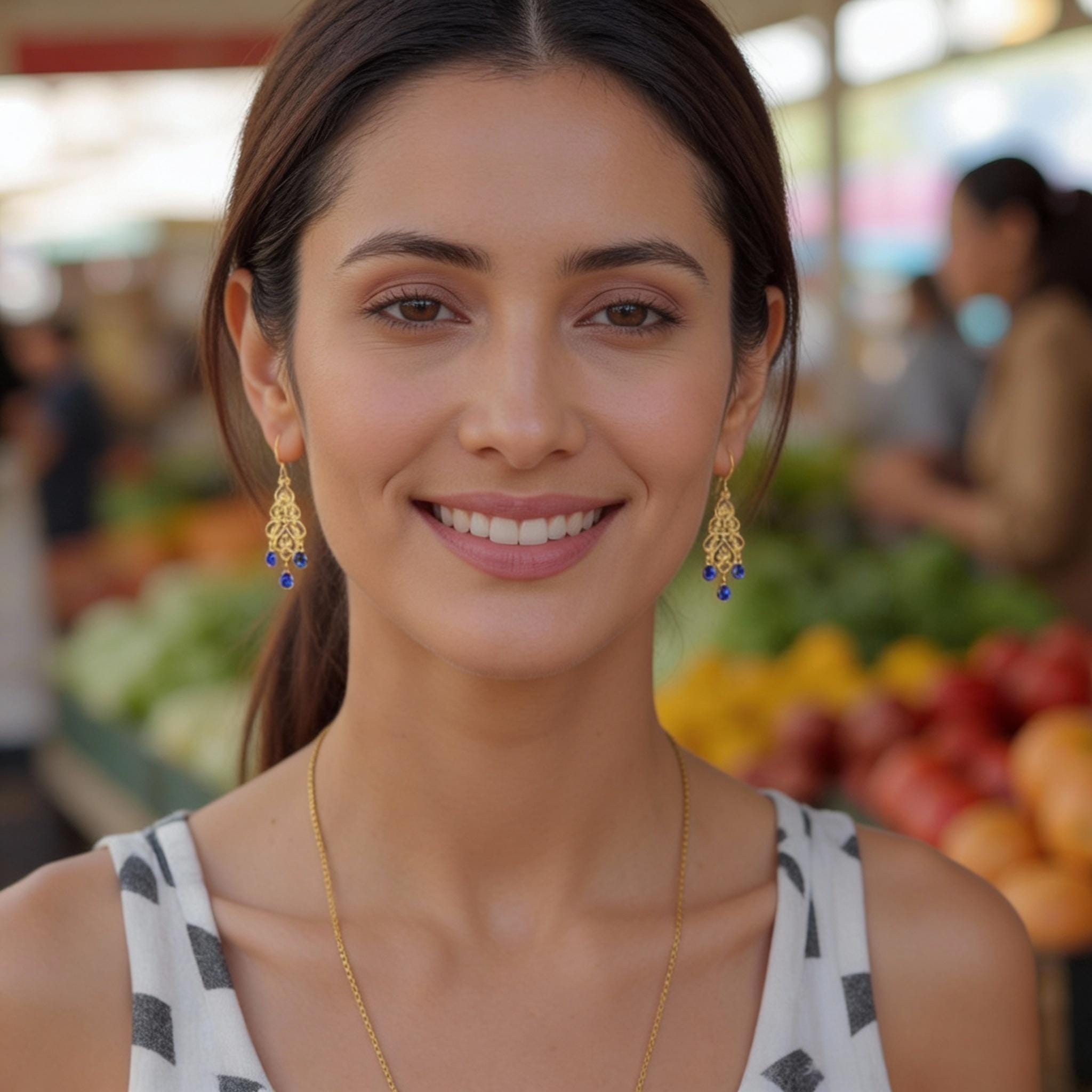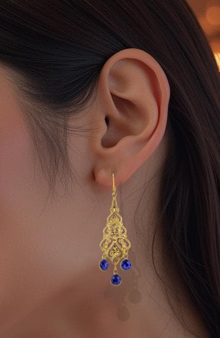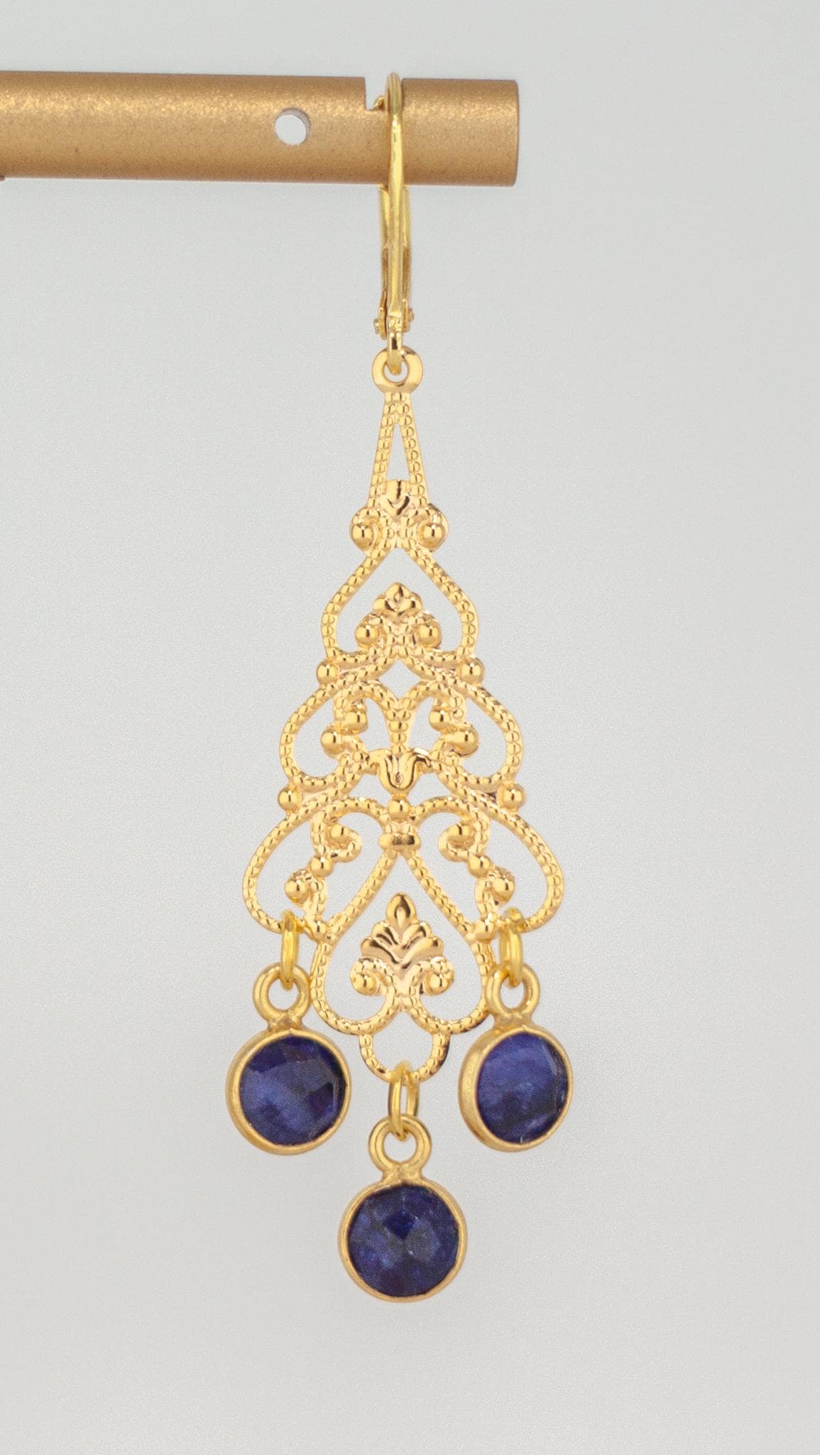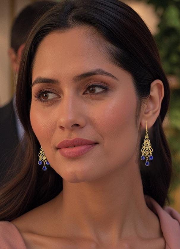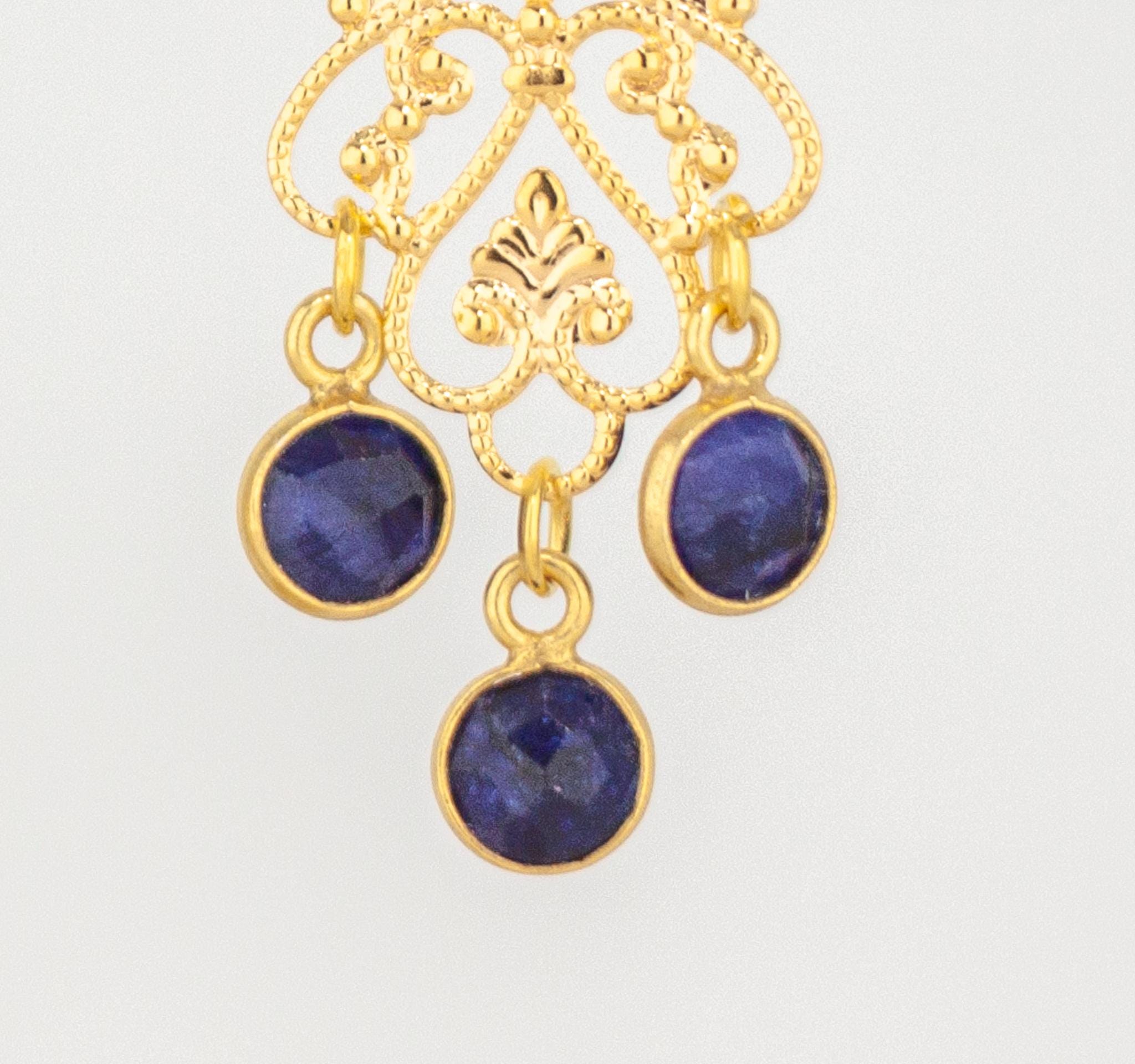 Elevate your style with these elegant Gold Filigree Dangle Earrings featuring deep royal navy blue quartz gemstones. The intricate filigree design of these boho luxe gemstone drops exudes timeless femininity, while the rich cobalt blue quartz stones add a touch of refined sophistication and charm. These long gold dangle earrings are perfect for any occasion, effortlessly transitioning from daytime elegance to evening glamour.