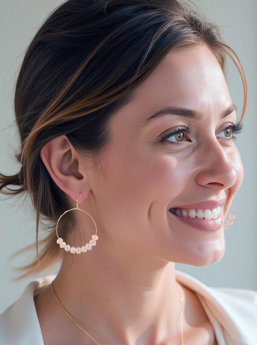 Add a bold and feminine touch to your jewelry collection with these Beaded Gold Hoop Earrings. Featuring delicate shimmery, light reflecting glass bead accents in a soft rose pink hue. These large hoops radiate pretty boho chic and girly energy. Perfect for the woman who loves to mix effortless elegance with sleek modern fashion. Crafted with lightweight gold filled hoops, these dangling earrings are secure comfortable. The glass shine gracefully on these gold statement earrings catching the light with every move and adding a gentle sparkle to your style. Whether you're dressing up a flowing dress for a music festival or adding flair to your everyday look, these big boho-inspired pink earrings make a playful yet polished statement.