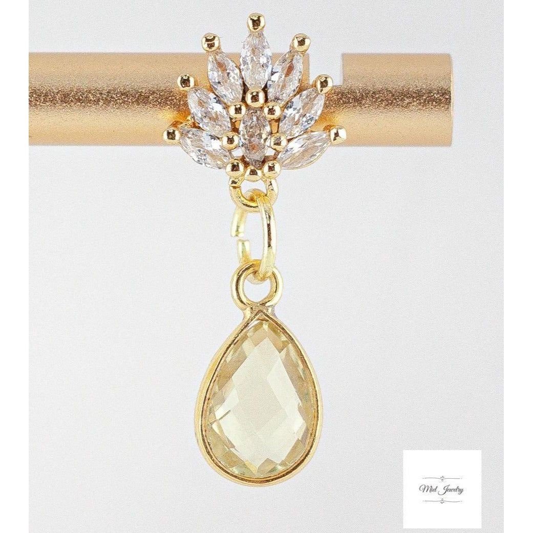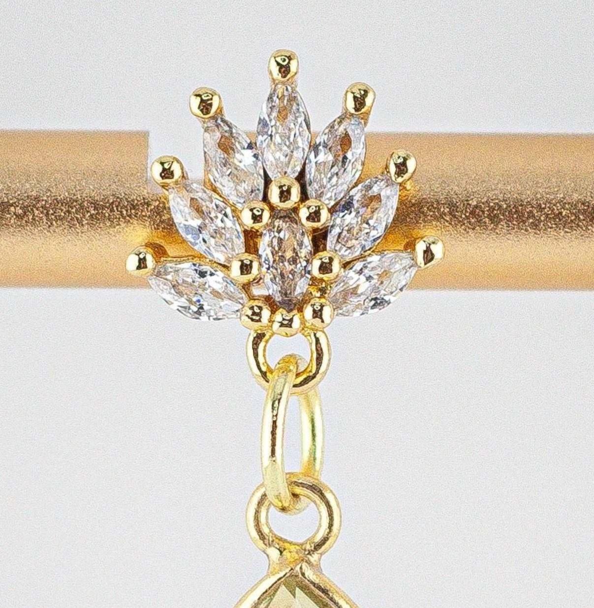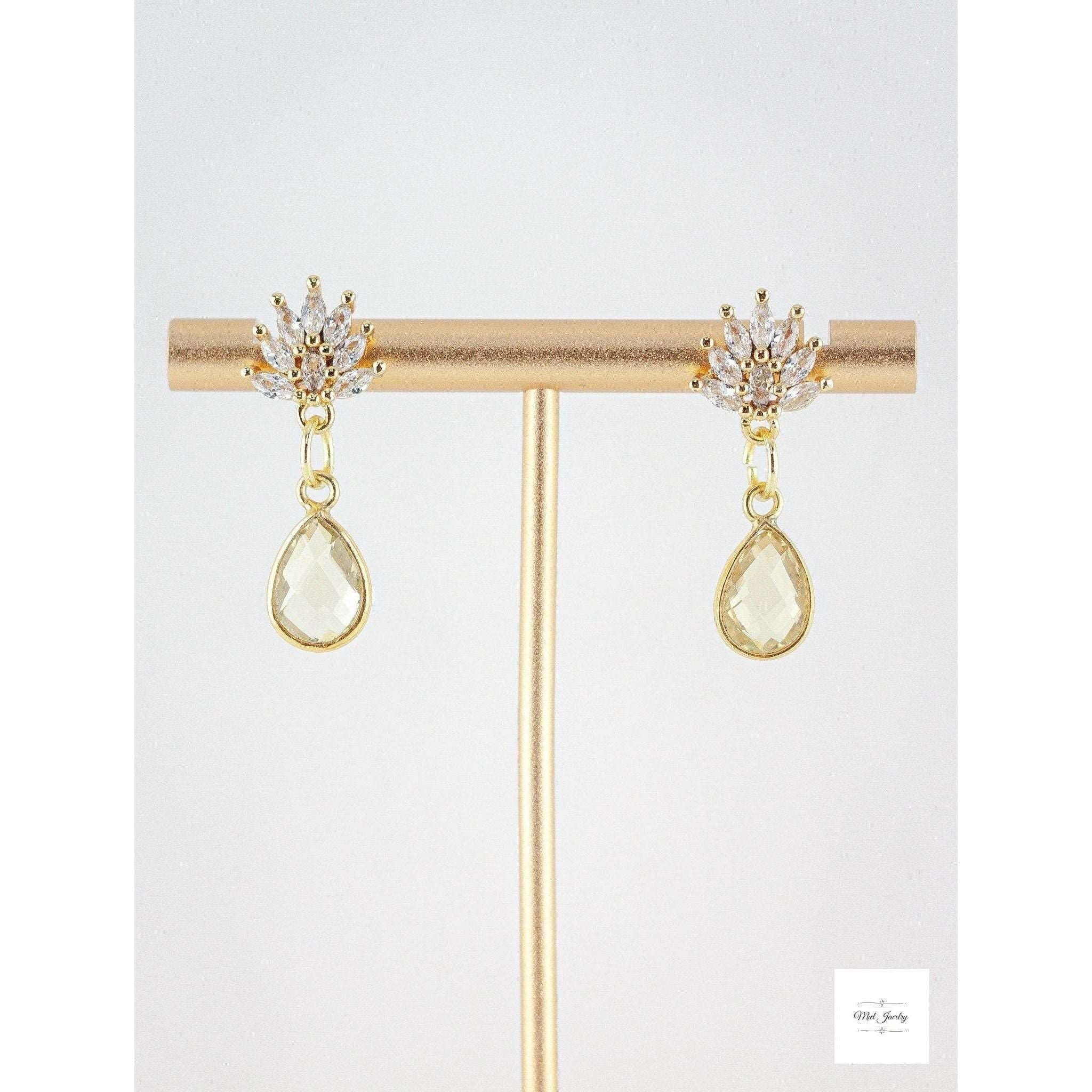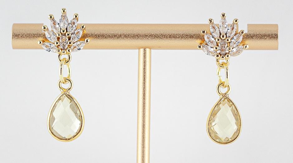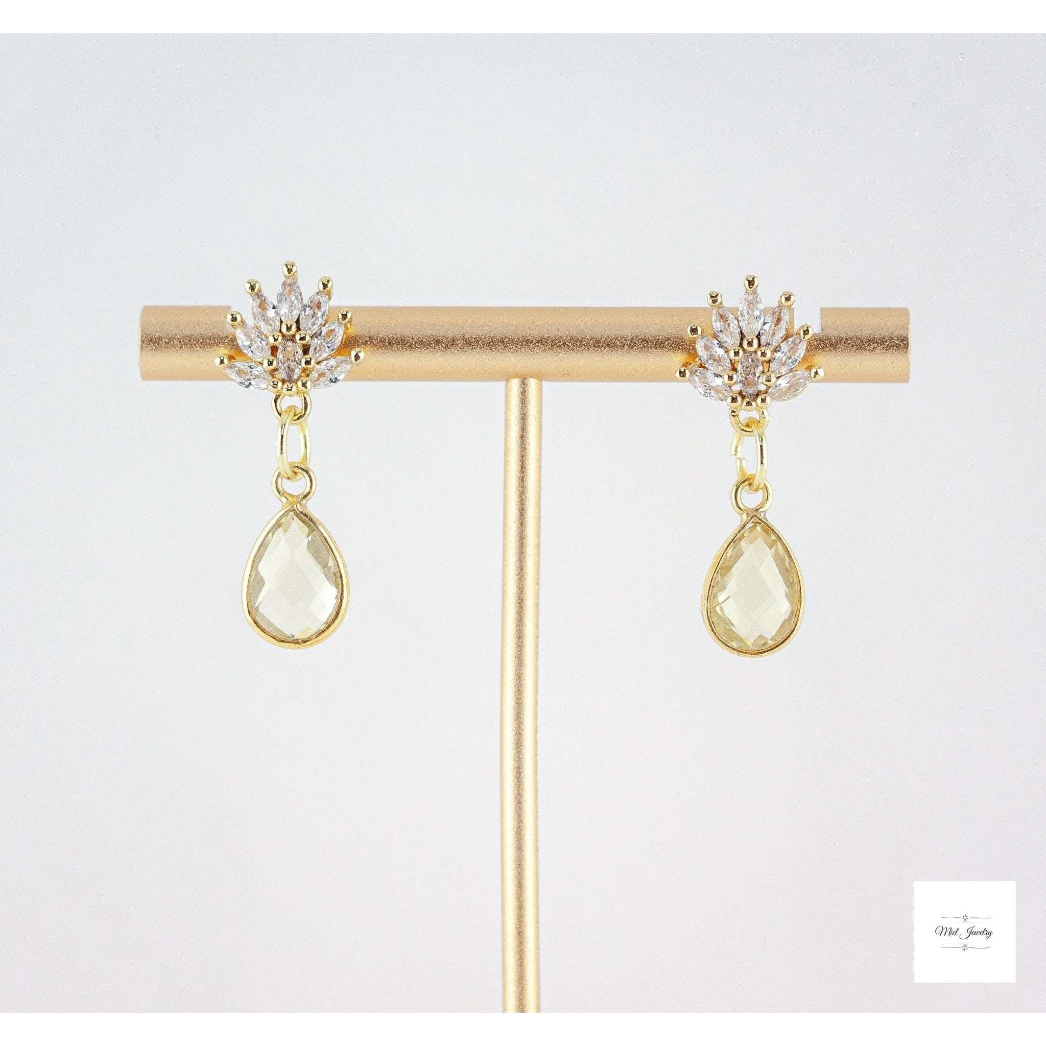 Add a touch of sunshine and sweetness to your look with these stunning Lemon Quartz Earrings. The sparkling quartz gemstones have a pale lemon yellow color that sparkles and captivates with light catching cubic zirconia accents. Sparkling art deco inspired posts enhance the timeless charm of these delicate dainty gold drop earrings, making them a must-have addition to your quartz jewelry collection. Whether you are a vintage or boho style bride or love understated glamour, these cute and girly gold earrings are perfect for any occasion and effortlessly elevate your everyday outfits. Experience the enchanting beauty and simple sparkly design of these pretty yellow earrings.