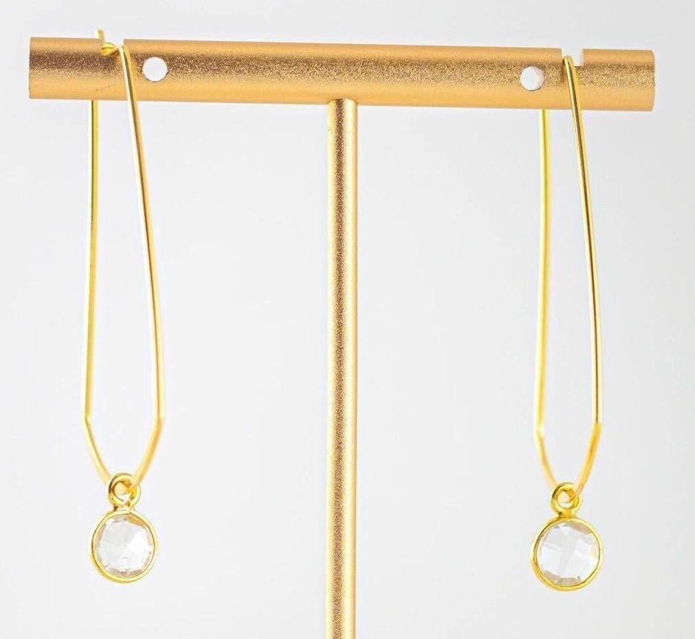 Fall in love with these very dainty yet simply stunning geometric Gold Statement Hoop Earrings with Quartz Gemstone Drops! These beautiful, minimalist, sparkling quartz earrings are a must-have for any jewelry collection, made with dazzling clear quartz and vermeil bezels. These stunning long gold hoop earrings feature dazzling quartz stones elegantly set in vermeil bezels. The gold-plated bow-shaped ear wires add a unique and sophisticated touch to every outfit, making them perfect for any occasion. Embrace their delicate and timeless design, ensuring they become a cherished staple in your everyday jewelry collection for years. These sparkly crystal earrings mix classic girly subtle sparkle and timeless feminine charm with minimal modern chic drop earring. Make these chic and delicate hoop earrings yours today.