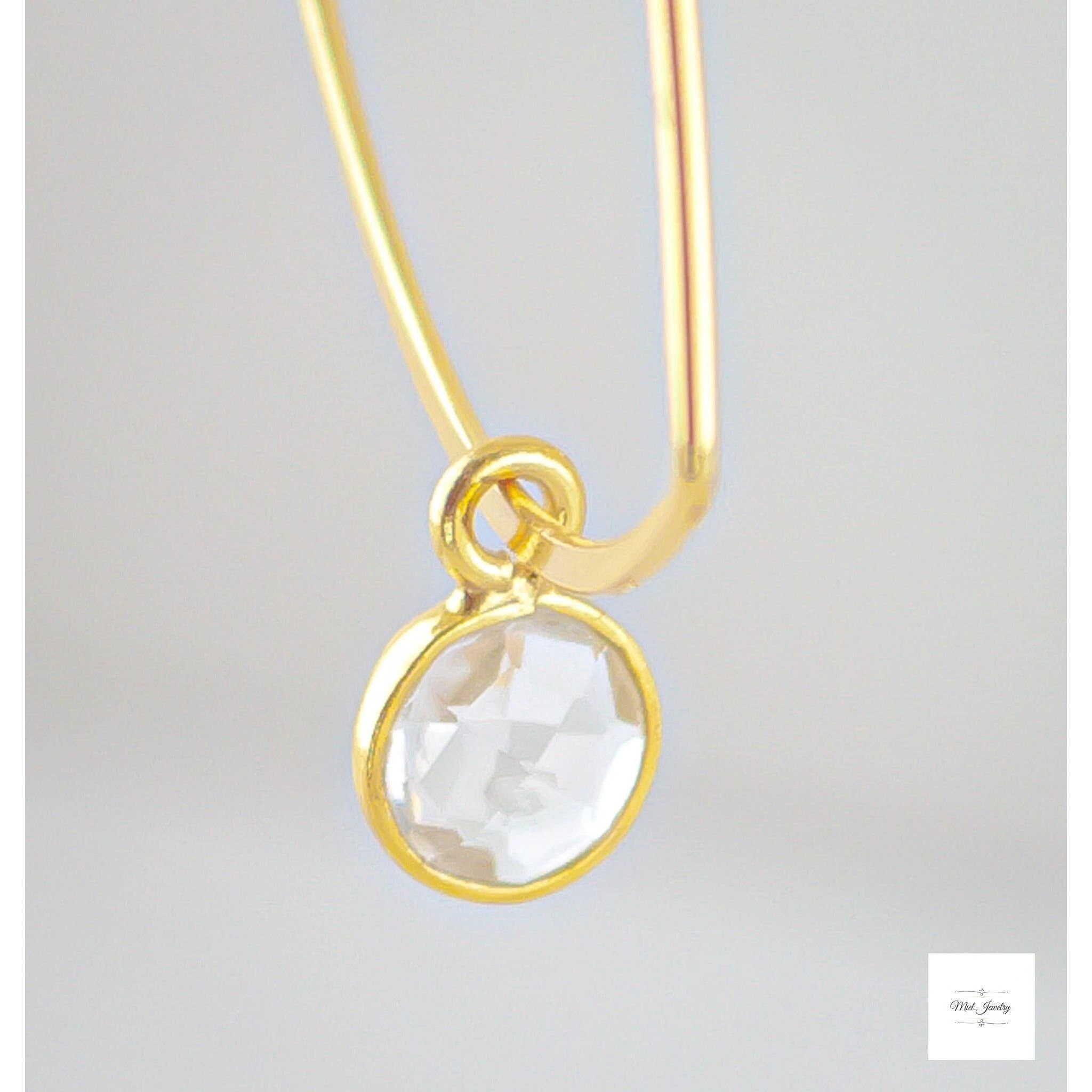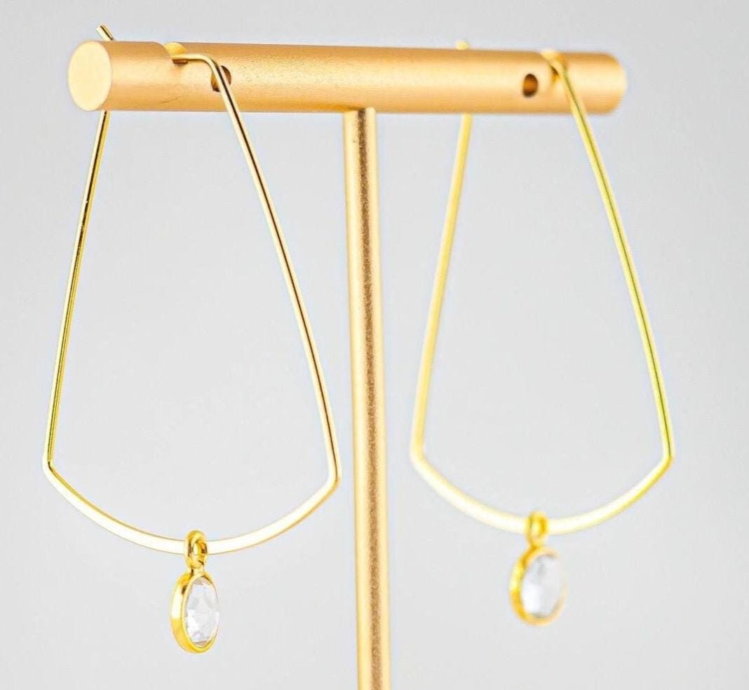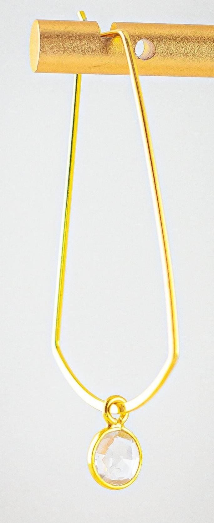 Fall in love with these very dainty yet simply stunning geometric Gold Statement Hoop Earrings with Quartz Gemstone Drops! These beautiful, minimalist, sparkling quartz earrings are a must-have for any jewelry collection, made with dazzling clear quartz and vermeil bezels. These stunning long gold hoop earrings feature dazzling quartz stones elegantly set in vermeil bezels. The gold-plated bow-shaped ear wires add a unique and sophisticated touch to every outfit, making them perfect for any occasion. Embrace their delicate and timeless design, ensuring they become a cherished staple in your everyday jewelry collection for years. These sparkly crystal earrings mix classic girly subtle sparkle and timeless feminine charm with minimal modern chic drop earring. Make these chic and delicate hoop earrings yours today.