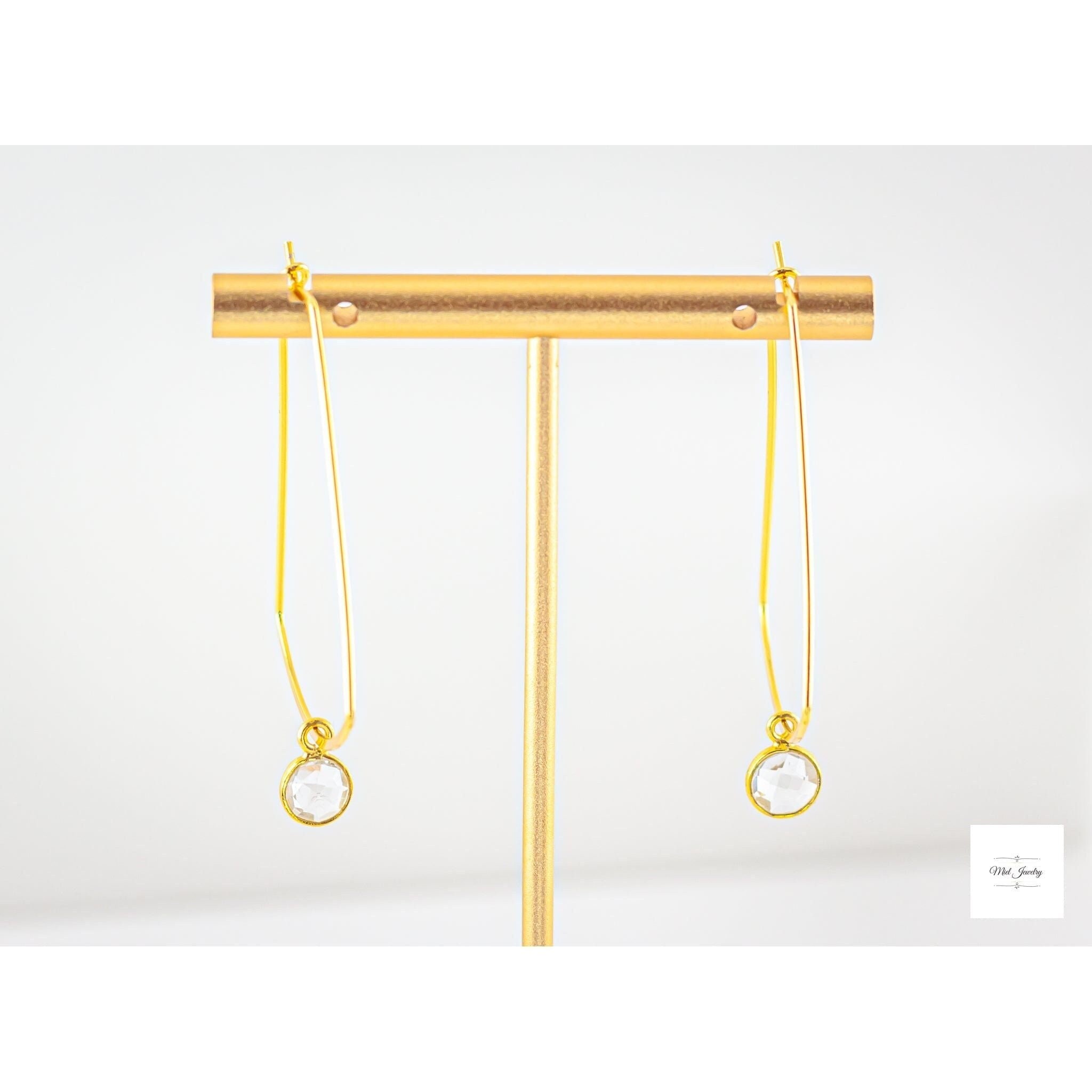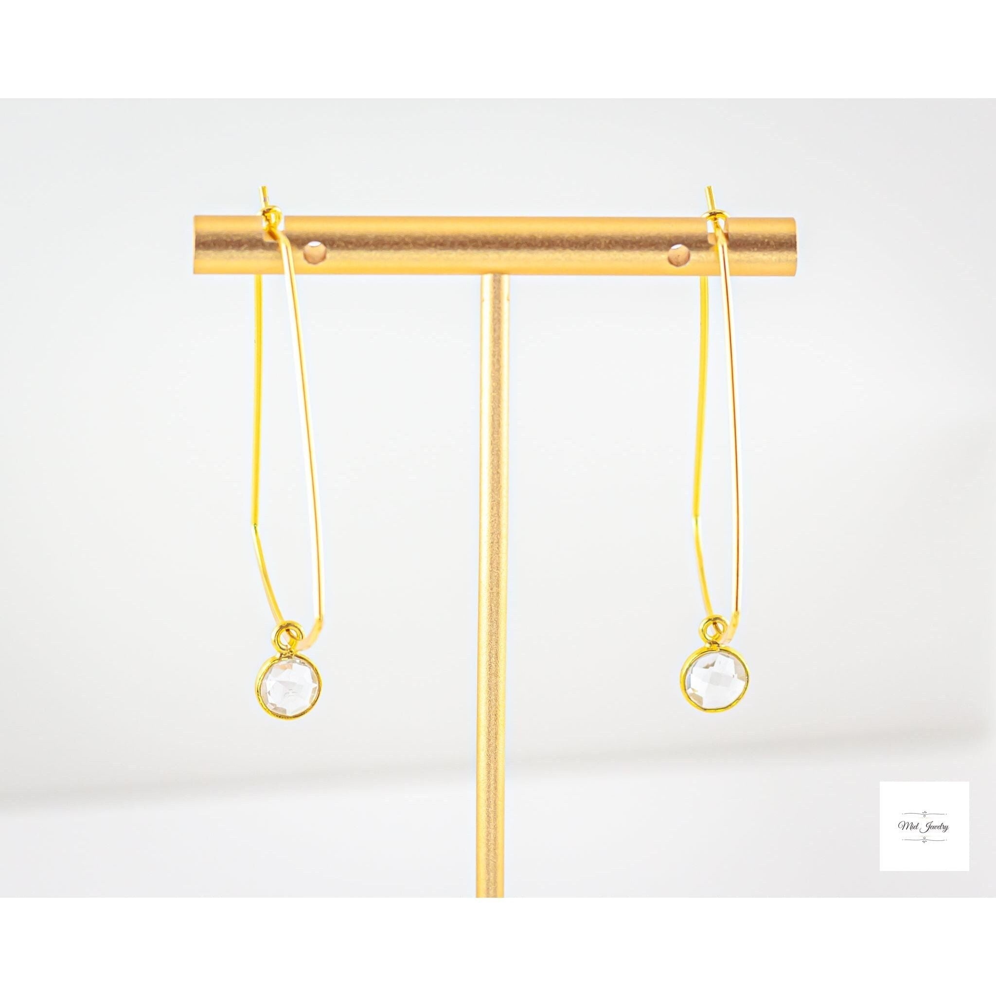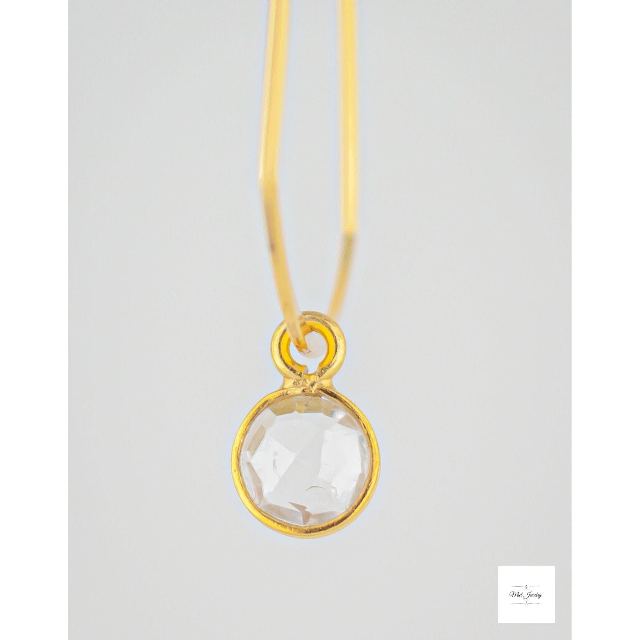 Fall in love with these very dainty yet simply stunning geometric Gold Statement Hoop Earrings with Quartz Gemstone Drops! These beautiful, minimalist, sparkling quartz earrings are a must-have for any jewelry collection, made with dazzling clear quartz and vermeil bezels. These stunning long gold hoop earrings feature dazzling quartz stones elegantly set in vermeil bezels. The gold-plated bow-shaped ear wires add a unique and sophisticated touch to every outfit, making them perfect for any occasion. Embrace their delicate and timeless design, ensuring they become a cherished staple in your everyday jewelry collection for years. These sparkly crystal earrings mix classic girly subtle sparkle and timeless feminine charm with minimal modern chic drop earring. Make these chic and delicate hoop earrings yours today.