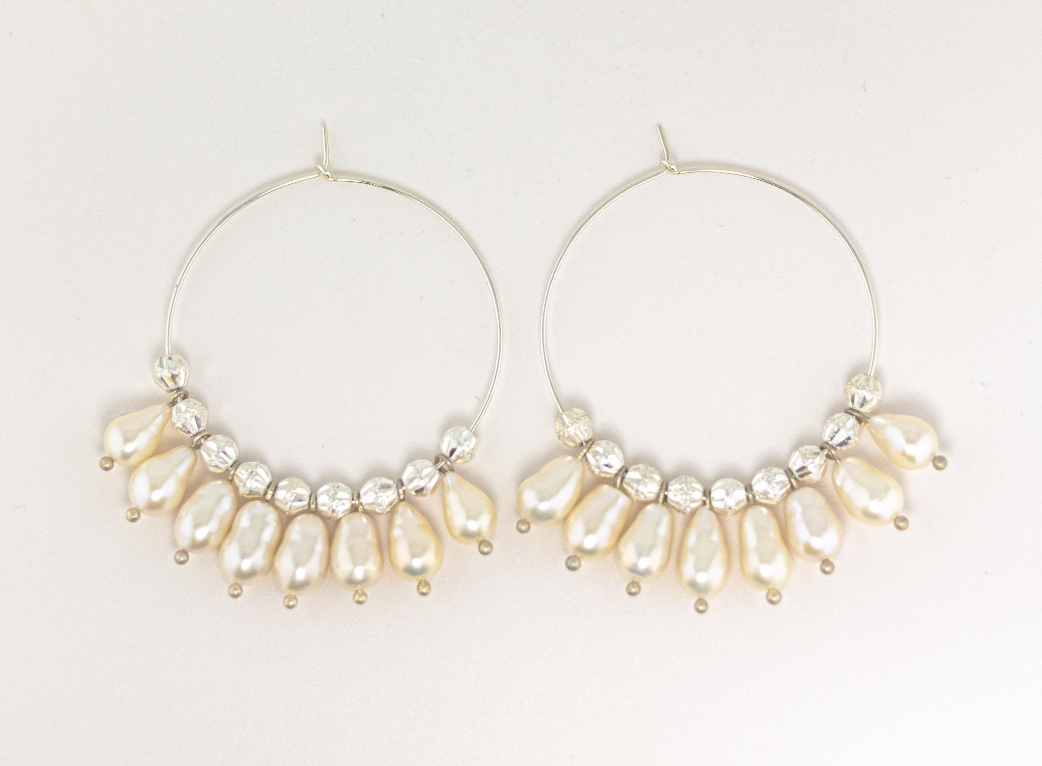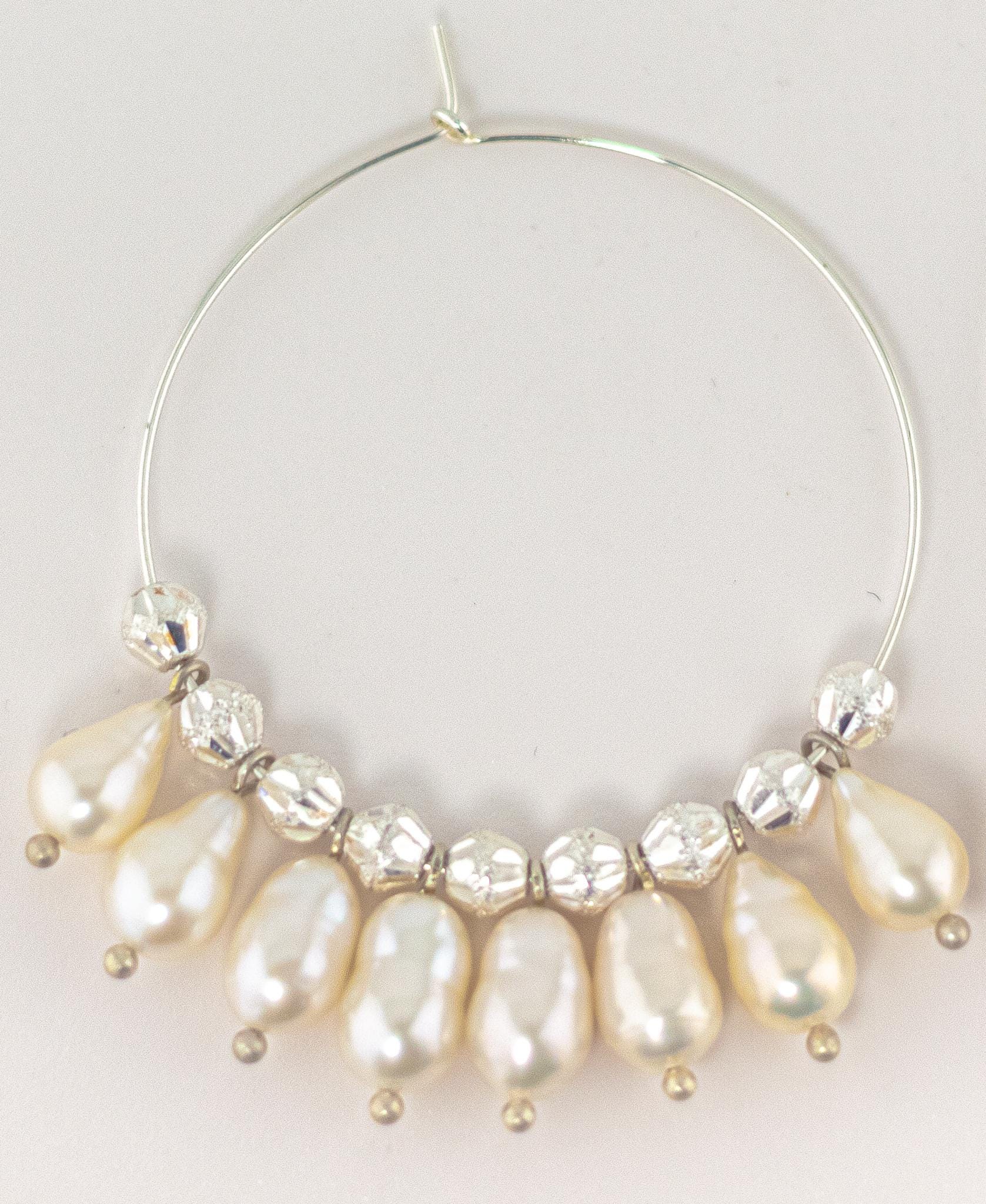 Experience elegance and glamour with these stunning baroque pearl hoop earrings! These beautiful sterling silver statement earrings feature bright and shimmering ultra baroque pearls in shades of white, cream, pink, green, and lavender, perfectly complemented by textured silver beads with both matte and shiny accents.