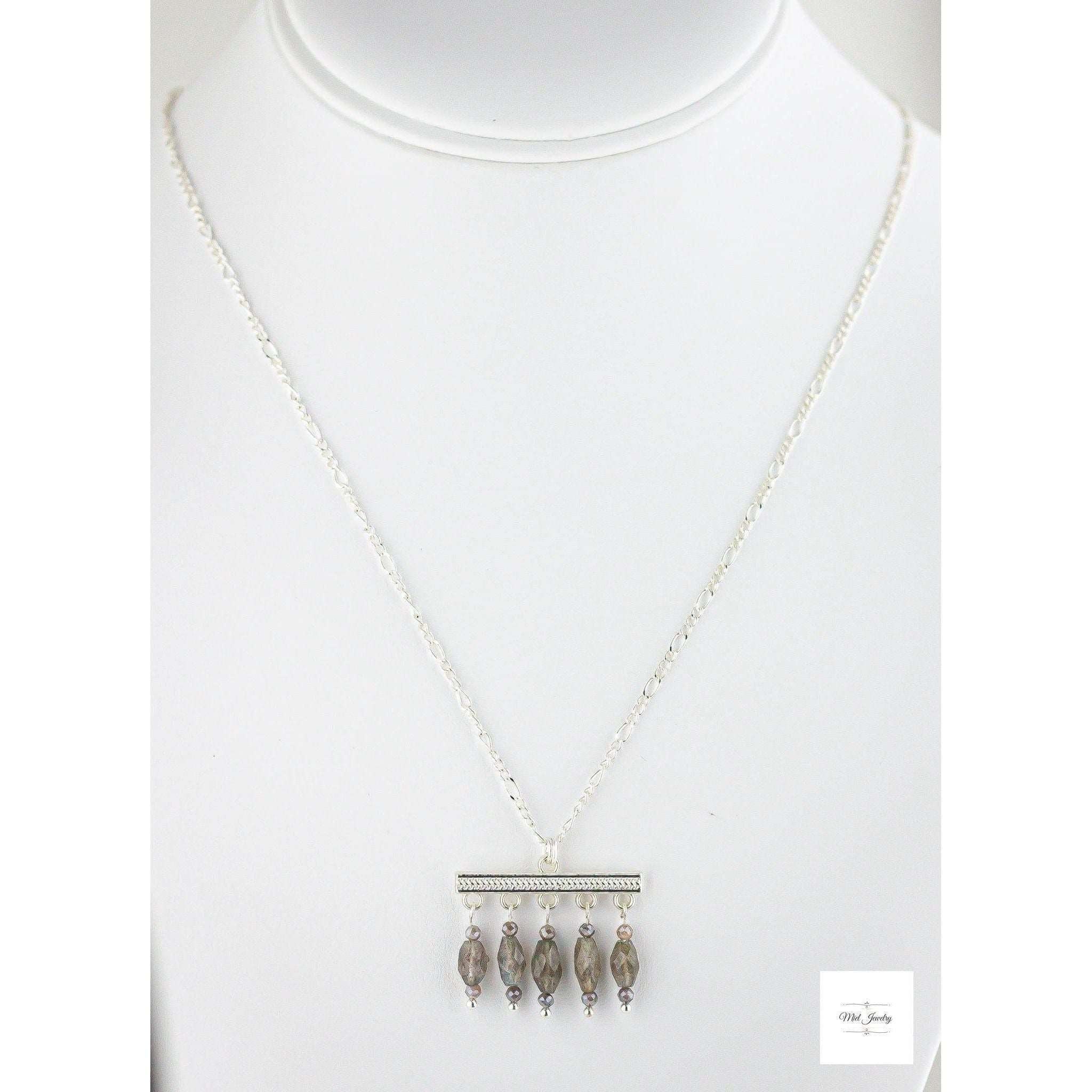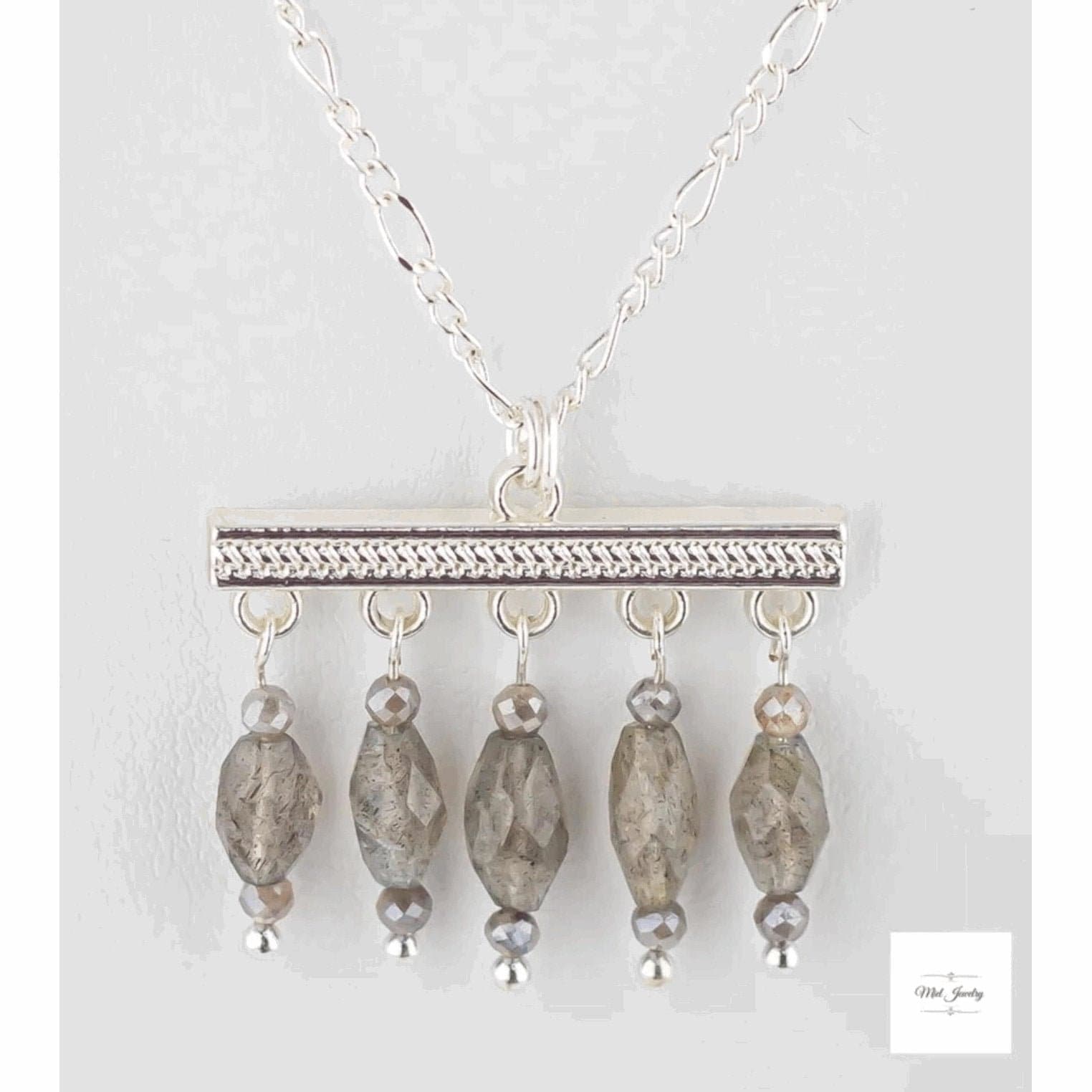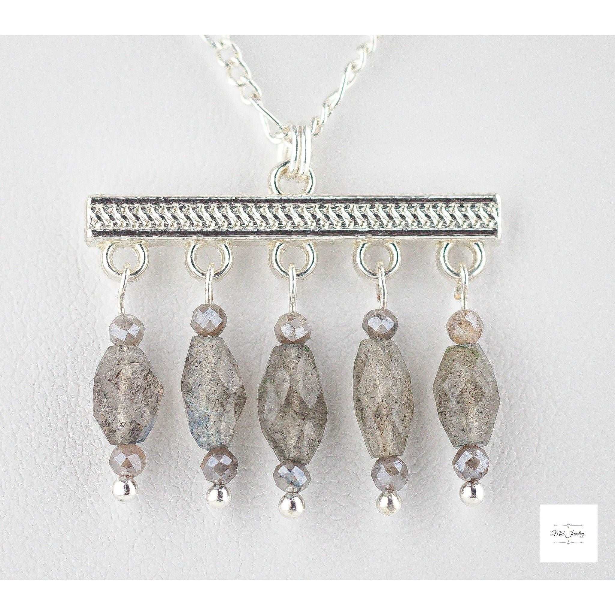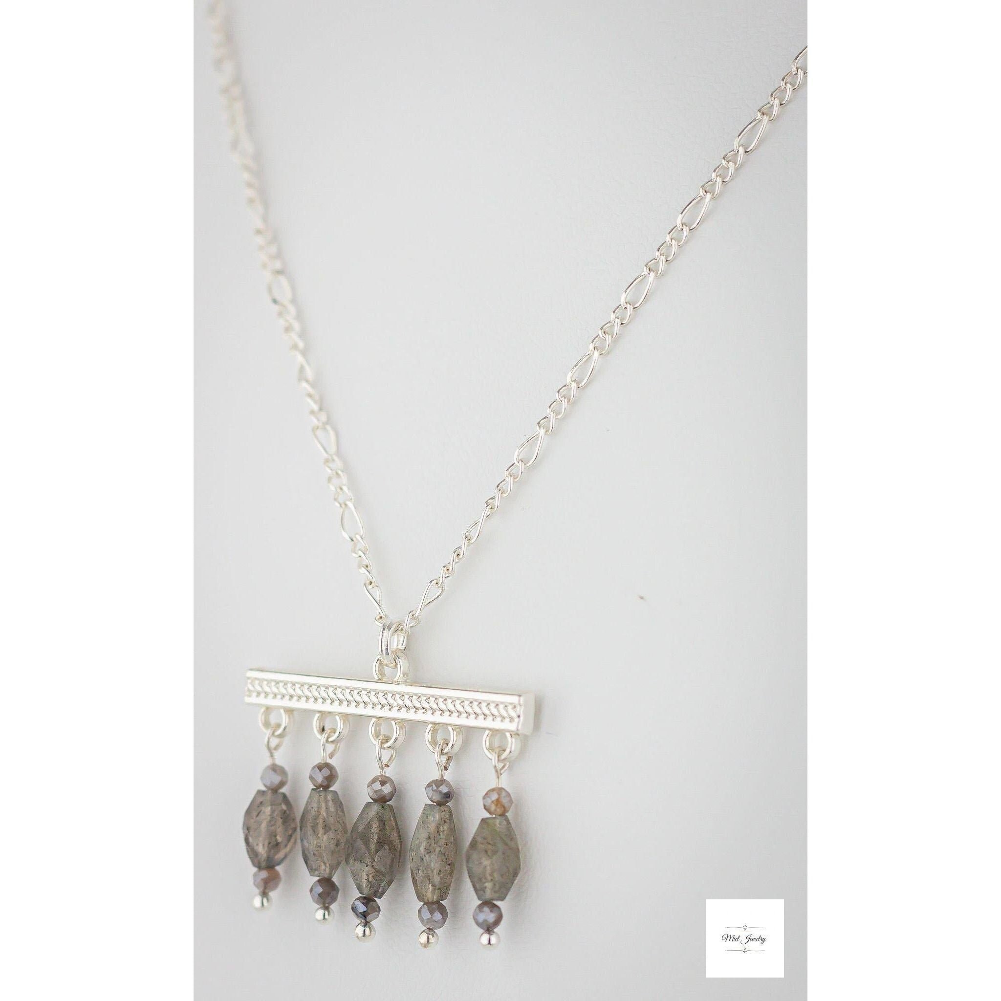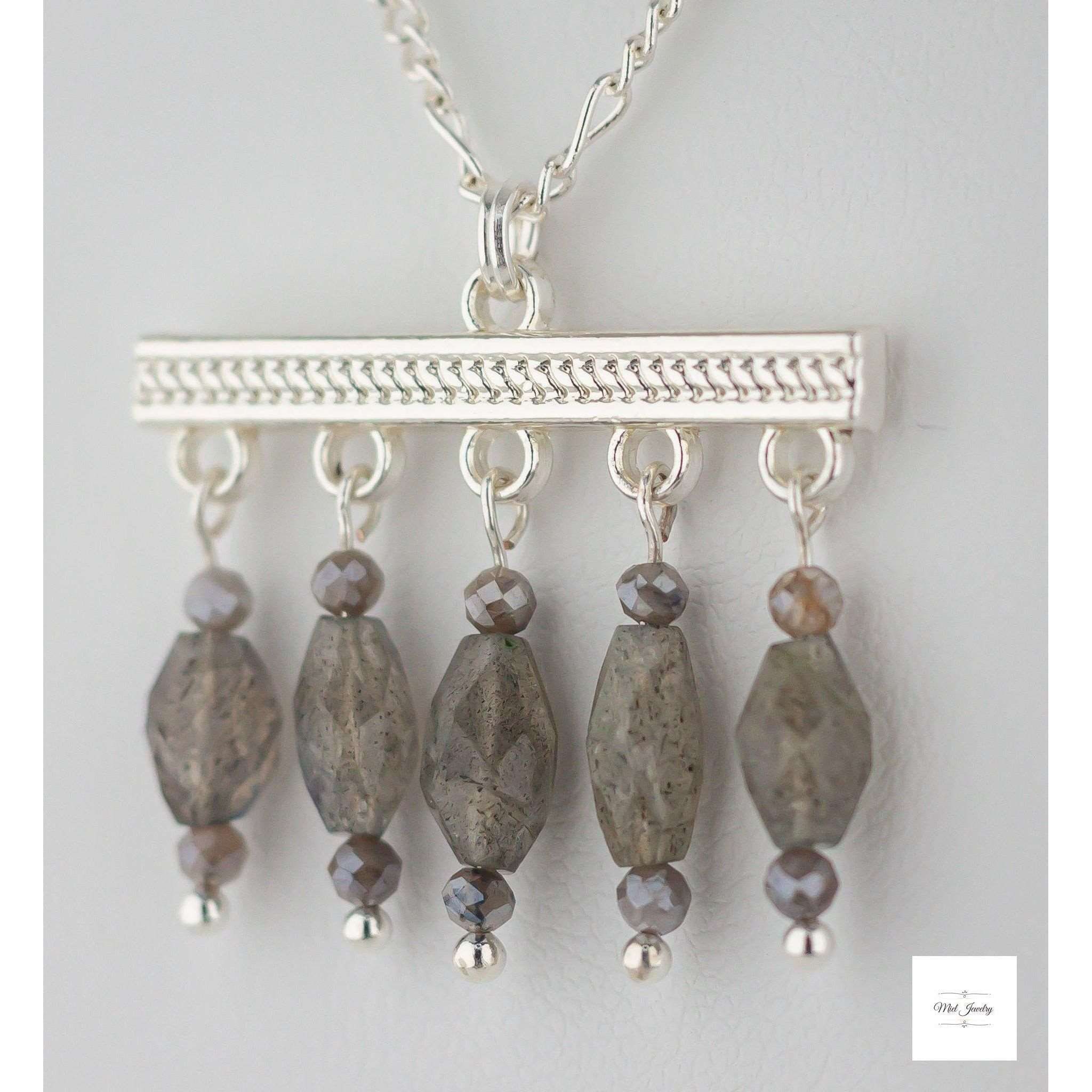 Elevate your bohemian style with our enchanting Boho Chic Labradorite Necklace, a stunning piece that combines the mystical allure of genuine labradorite stones with sleek silver-plated accents. This exquisite necklace features a harmonious blend of grey labradorite beads and mystic labradorite gemstone beads, each one unique with its captivating play of colors and ethereal sheen. The natural variations in the labradorite stones ensure that every necklace is one-of-a-kind, making it a truly special addition to your jewelry collection.