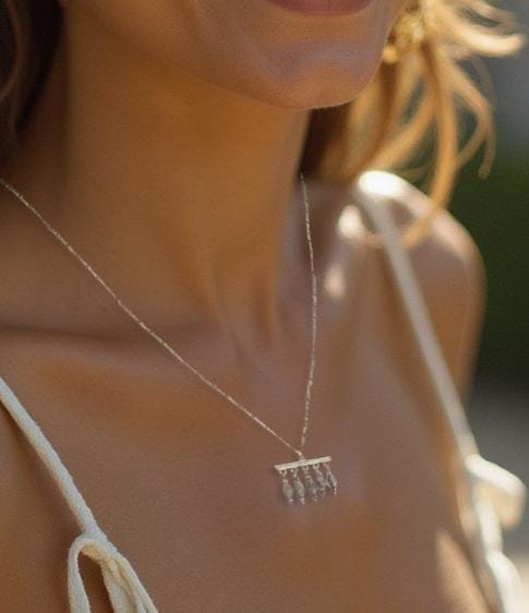 At the heart of this bohemian-inspired necklace is a stylish silver-plated brass bar connector, adding a modern touch to the organic beauty of the labradorite beads. This grey labradorite necklace is completed with a durable and elegant silver-plated brass Figaro chain and clasp, providing both security and sophistication. This versatile piece effortlessly transitions from casual daywear to evening elegance, making it the perfect accessory for free-spirited fashion enthusiasts and gemstone lovers alike.