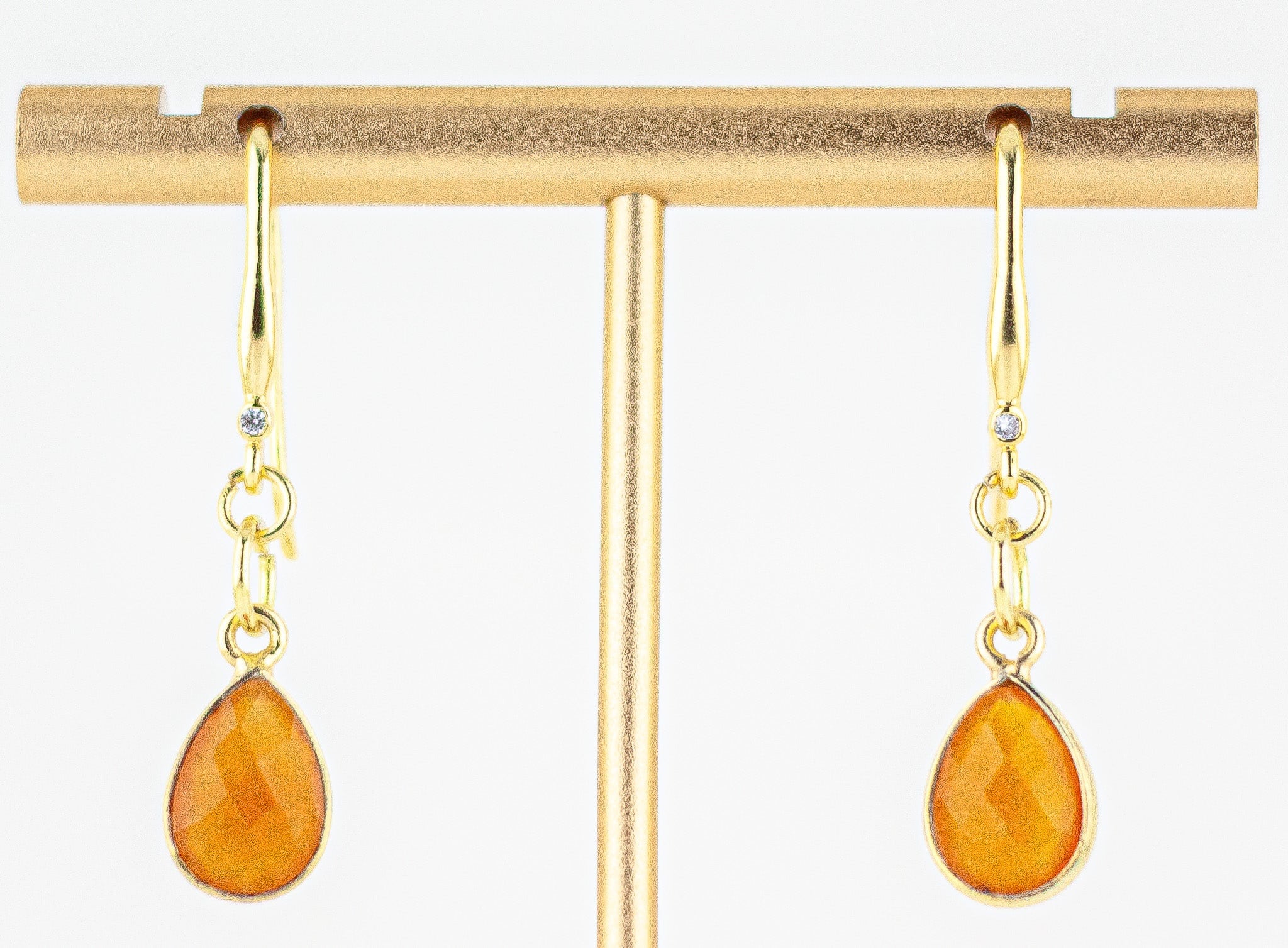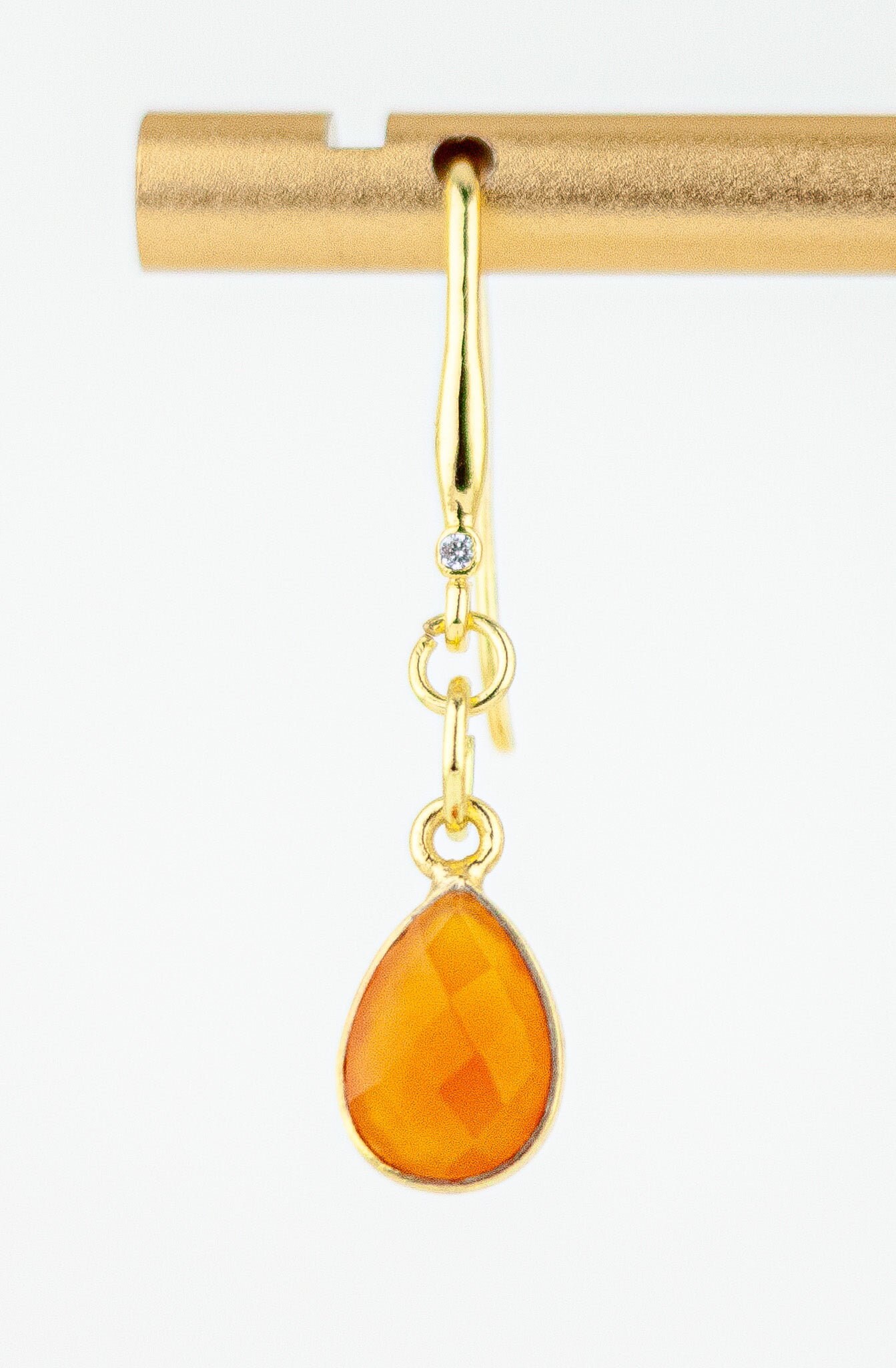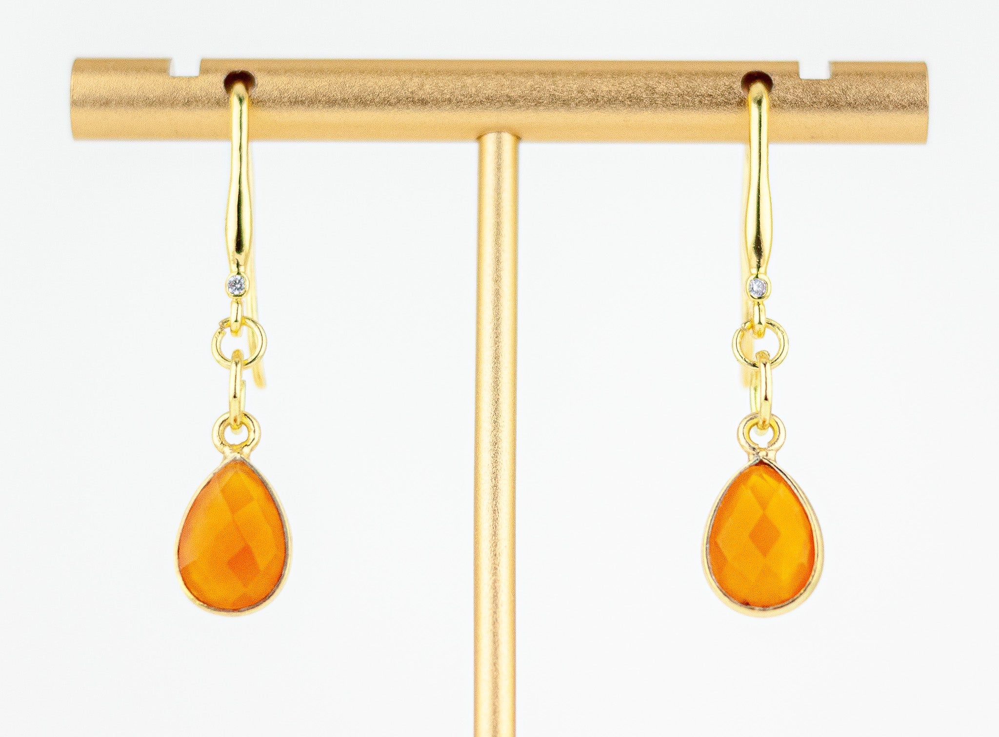 Elevate your jewelry collection with these bright and beautiful boho luxe Orange Carnelian Drop Earrings. Featuring vibrant carnelian gemstones that hang gracefully from glittering cubic zirconia studded gold ear wires, these chic vintage style gold drop earrings exude a delicate and elegant charm.