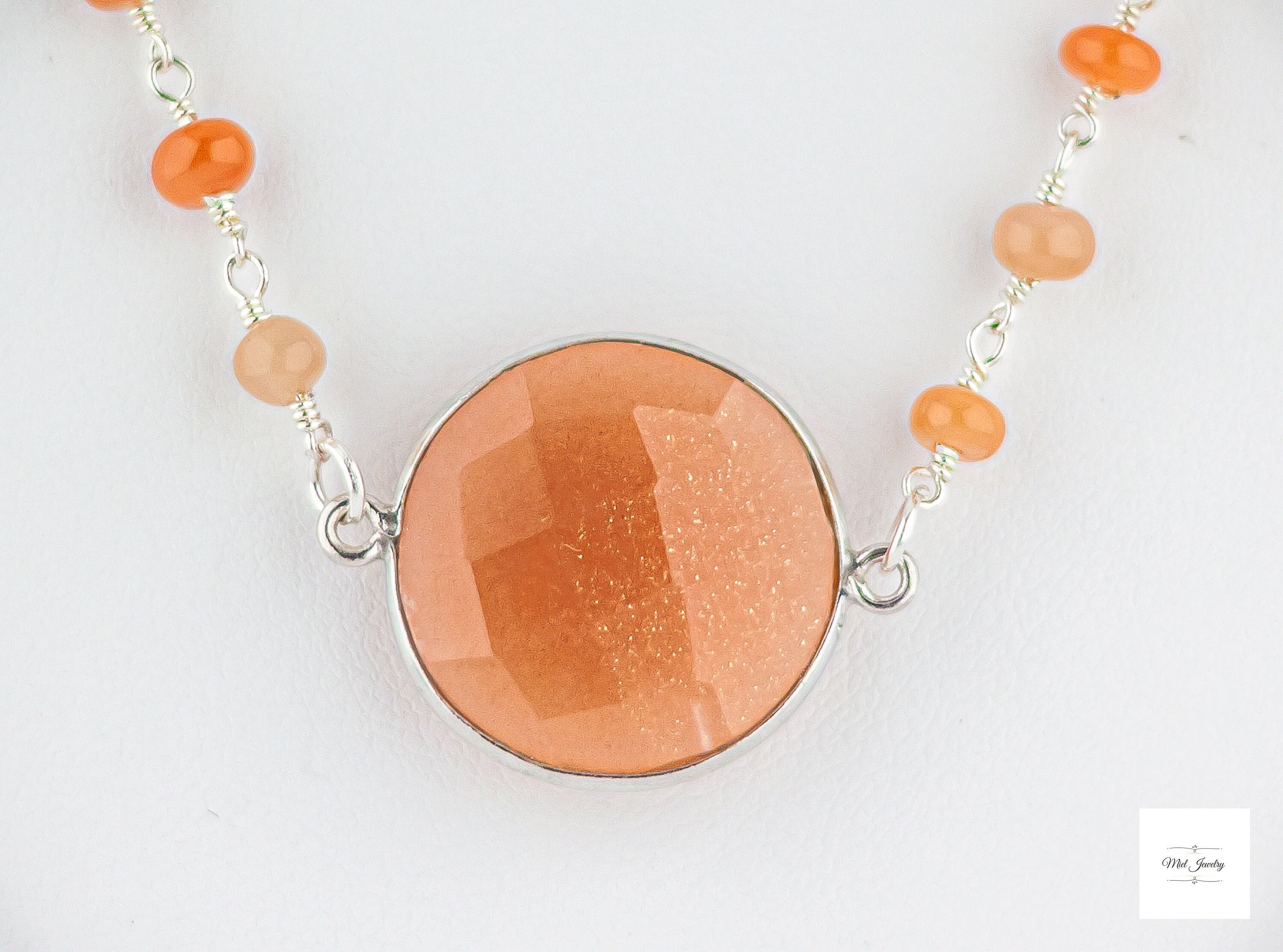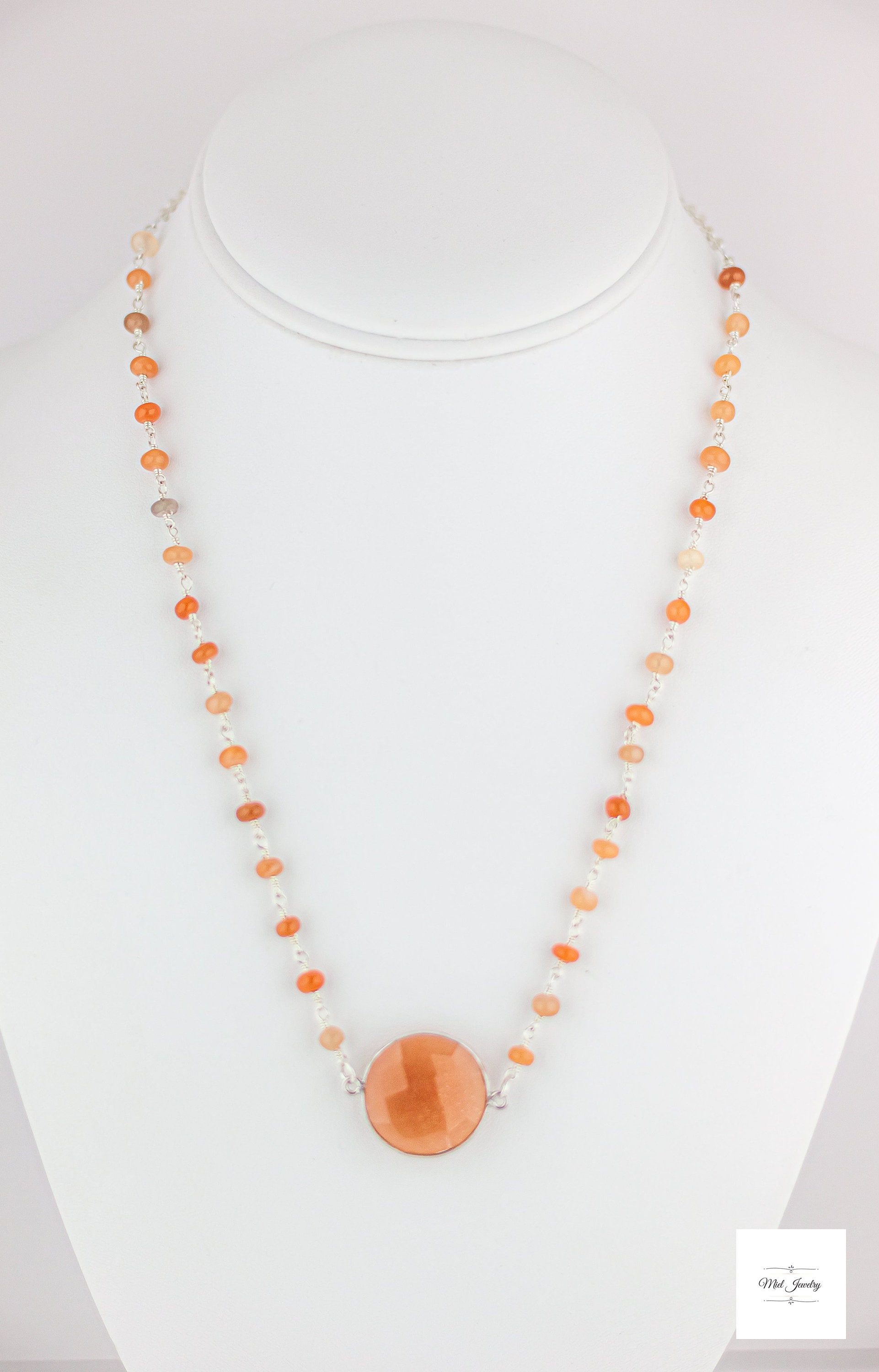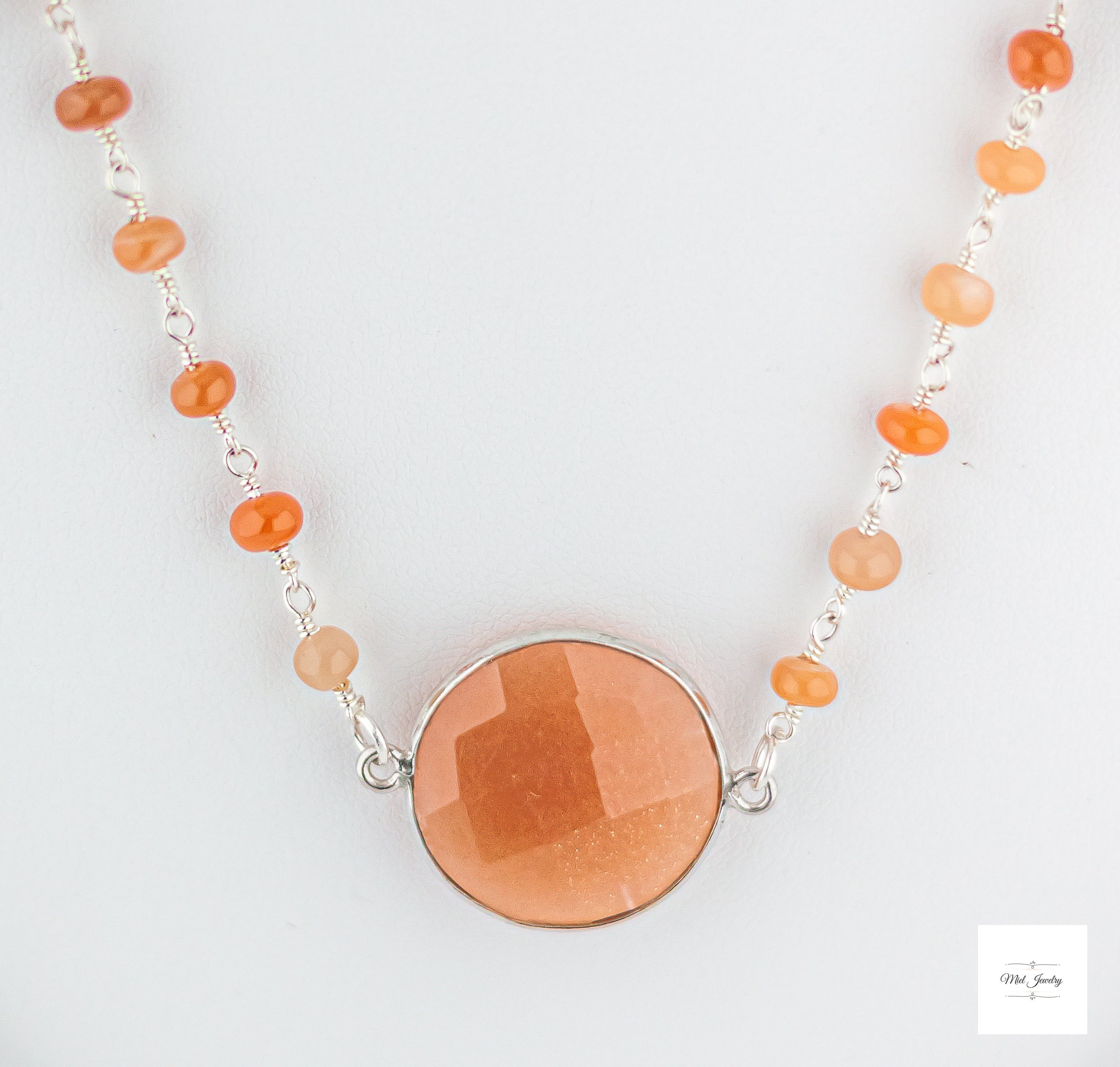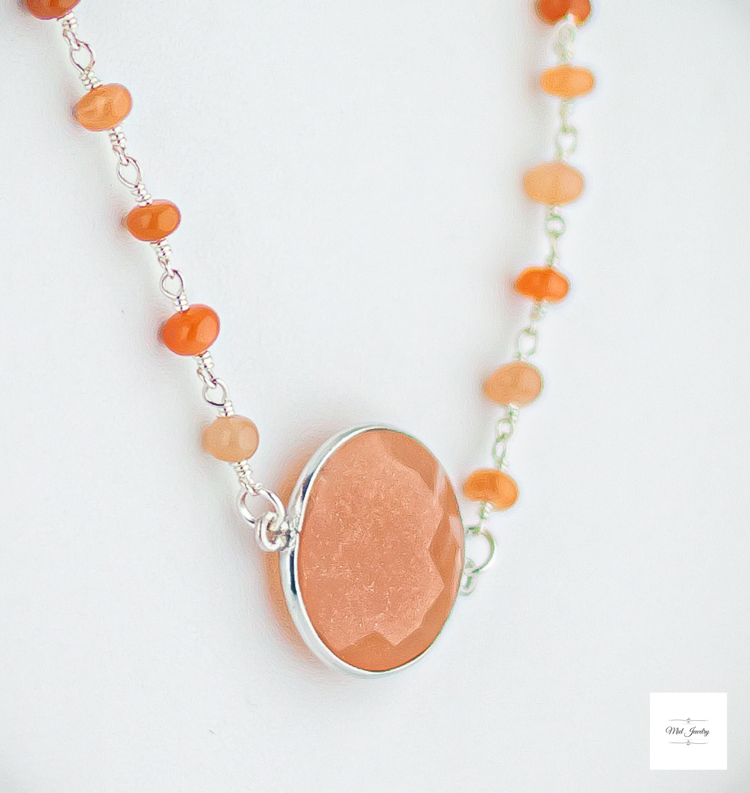 Behold this striking boho luxe Peach Moonstone Necklace! This captivating pink necklace features a stunning moonstone pendant, sterling silver accents and smooth shimmery Peach moonstone beads. This radiant beaded choker necklace showcases a large, sparkling coral-colored Peach moonstone pendant set in a sterling silver bezel. Unique, bold, modern and captivating this gorgeous silver statement necklace will get you noticed. Perfect for elegant bohemian dresses, wedding guest outfit, parties and special occasions. Embody playful earthy glamour and timeless feminine elegance in this stunning boho luxe pendant necklace.