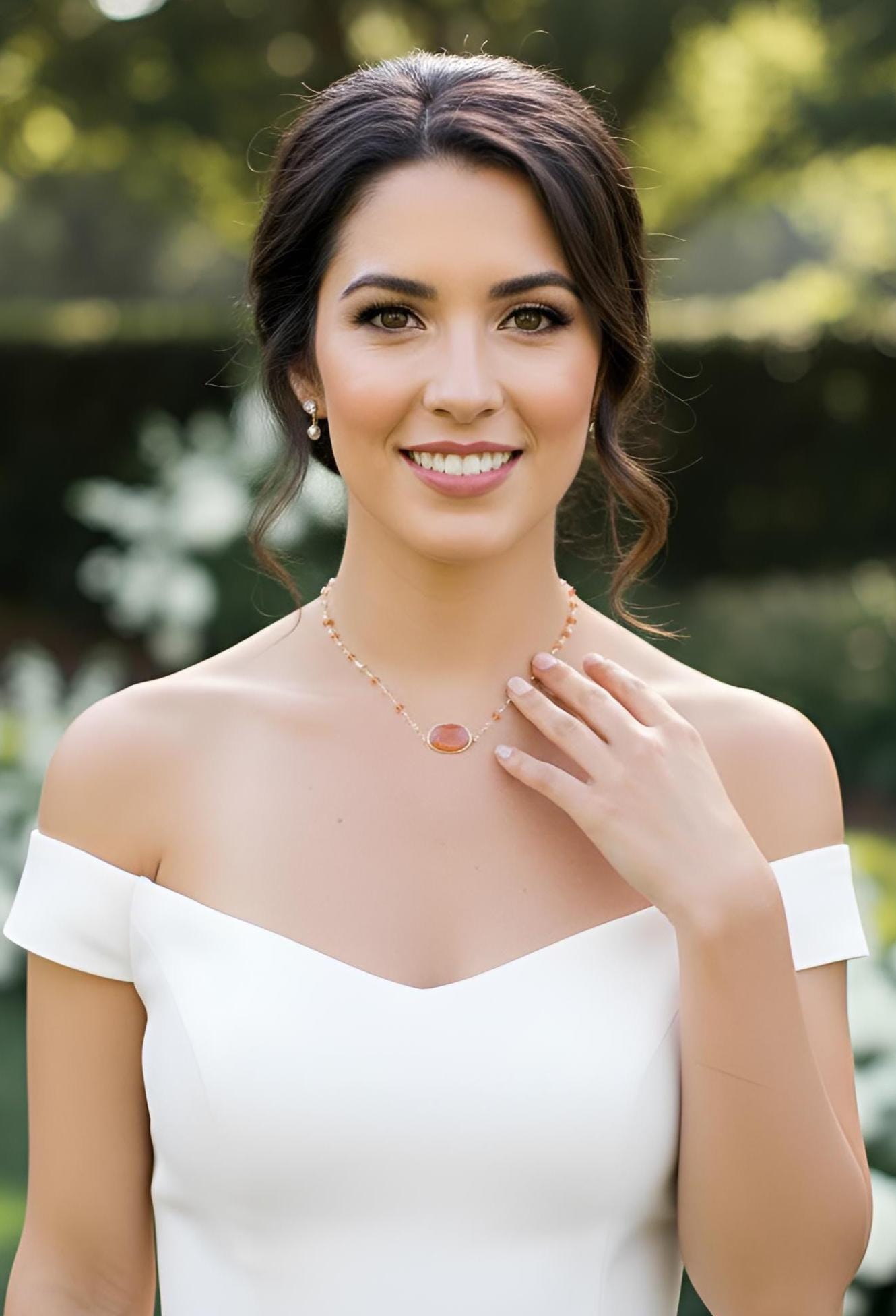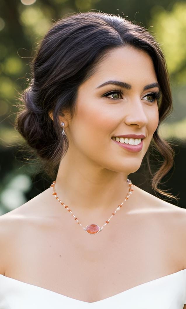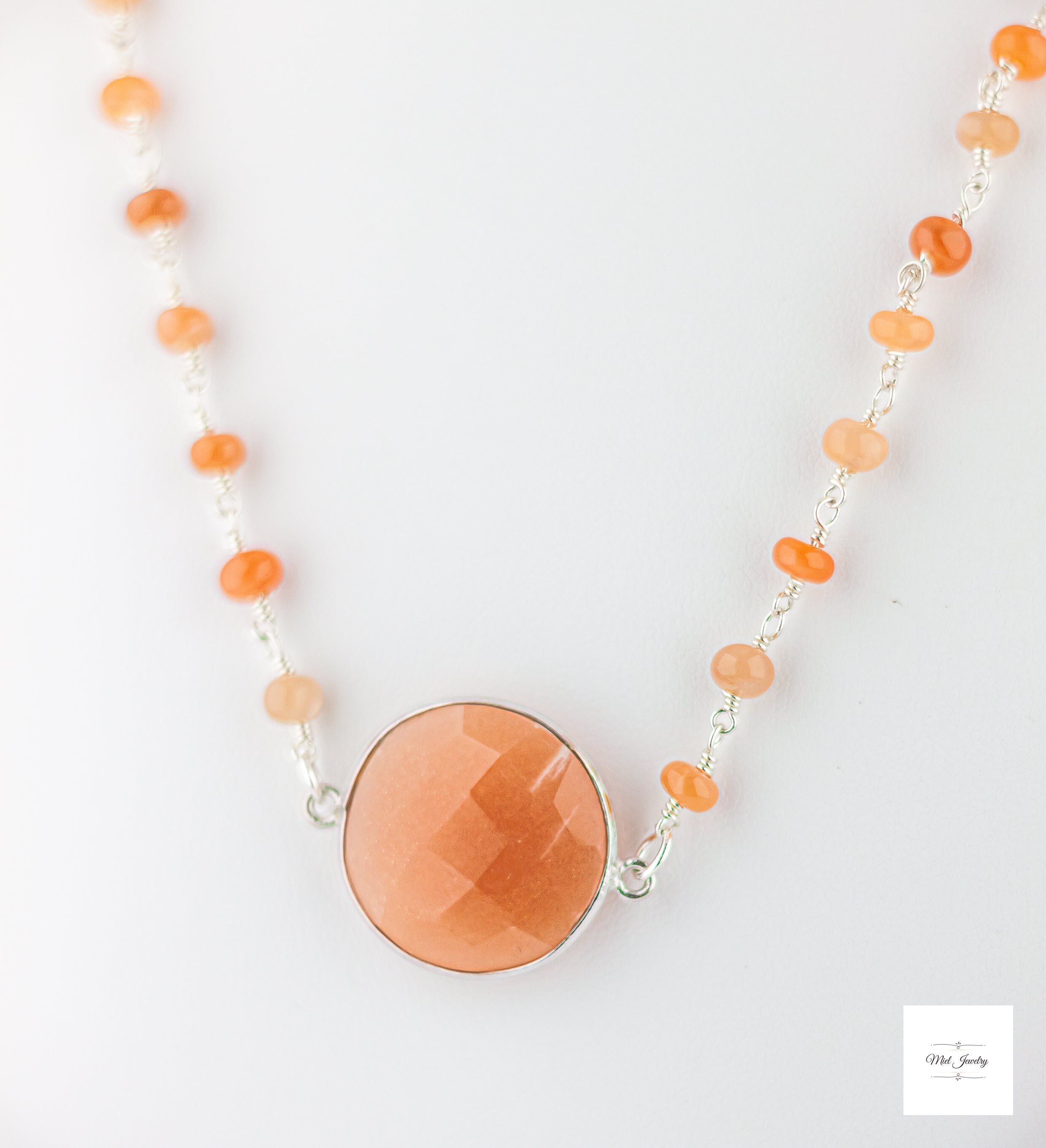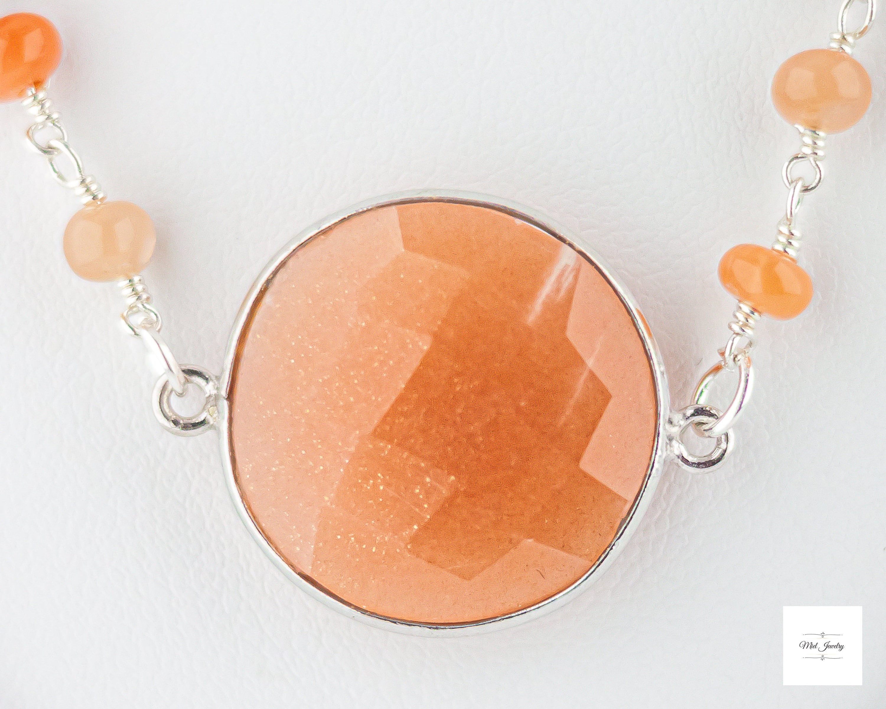 Behold this striking boho luxe Peach Moonstone Necklace! This captivating pink necklace features a stunning moonstone pendant, sterling silver accents and smooth shimmery Peach moonstone beads. This radiant beaded choker necklace showcases a large, sparkling coral-colored Peach moonstone pendant set in a sterling silver bezel. Unique, bold, modern and captivating this gorgeous silver statement necklace will get you noticed. Perfect for elegant bohemian dresses, wedding guest outfit, parties and special occasions. Embody playful earthy glamour and timeless feminine elegance in this stunning boho luxe pendant necklace.