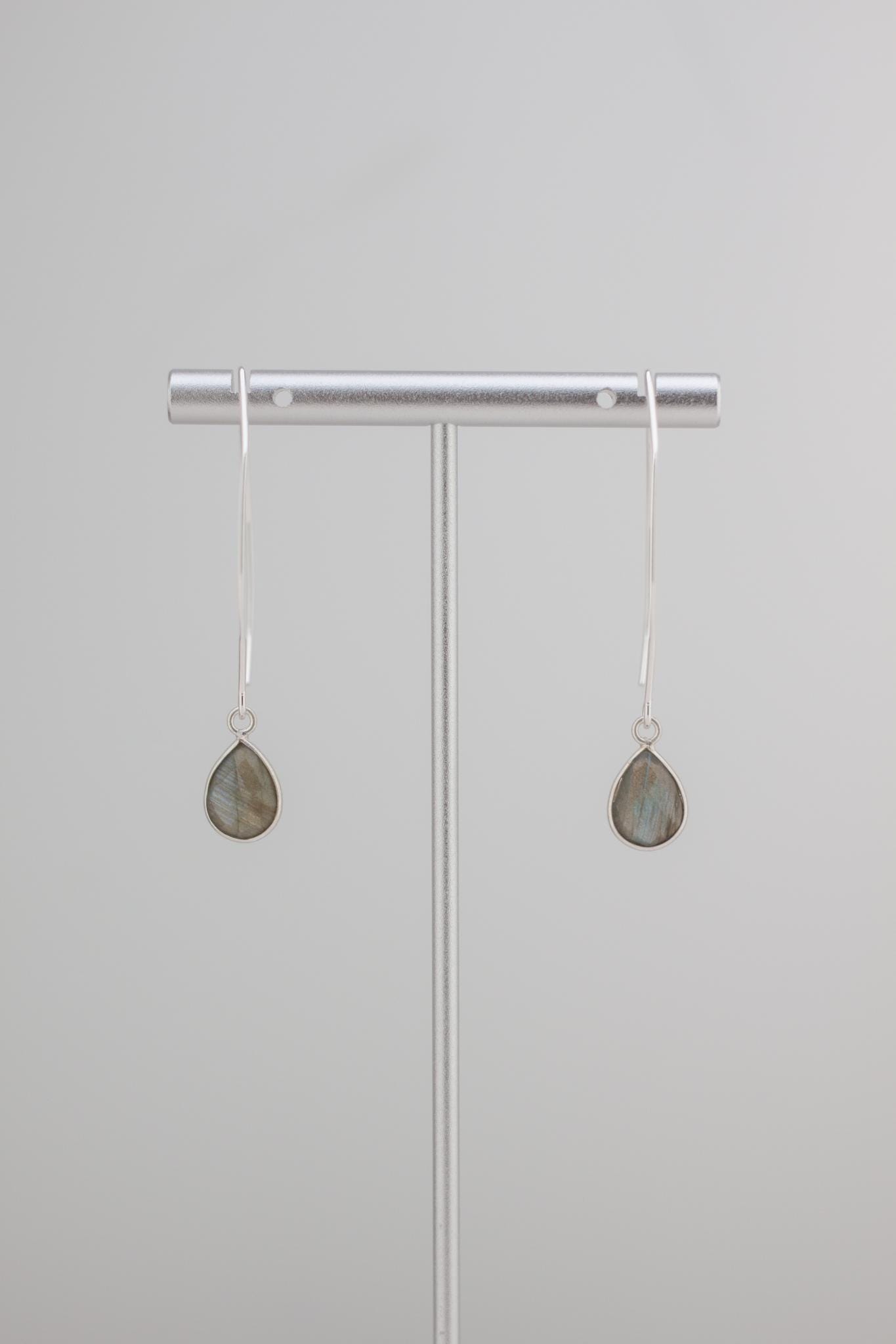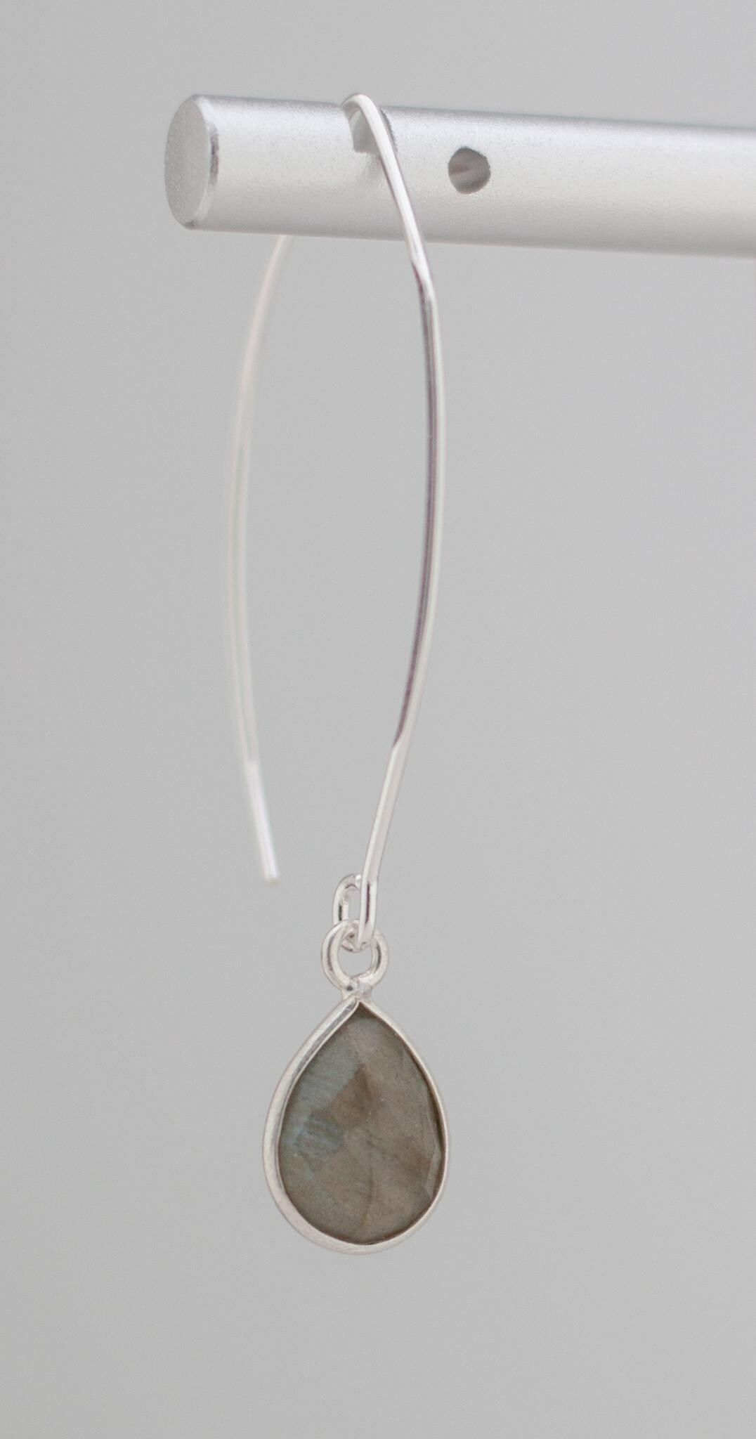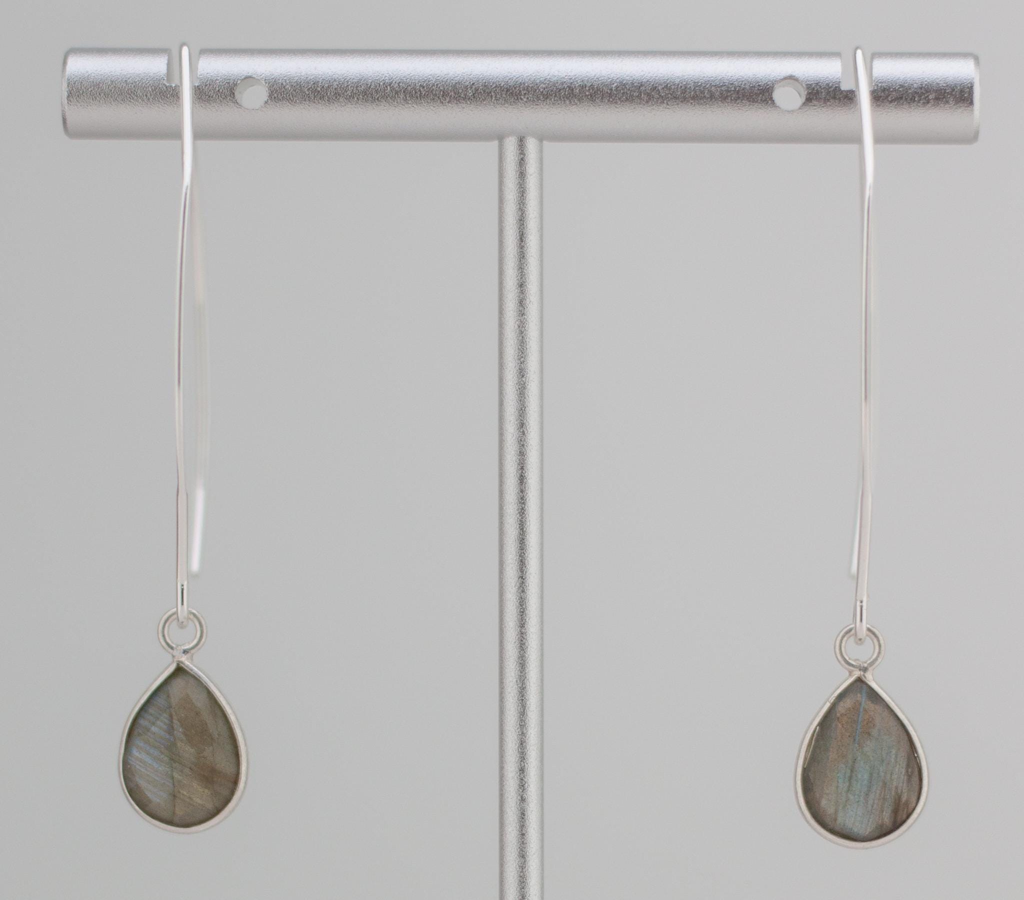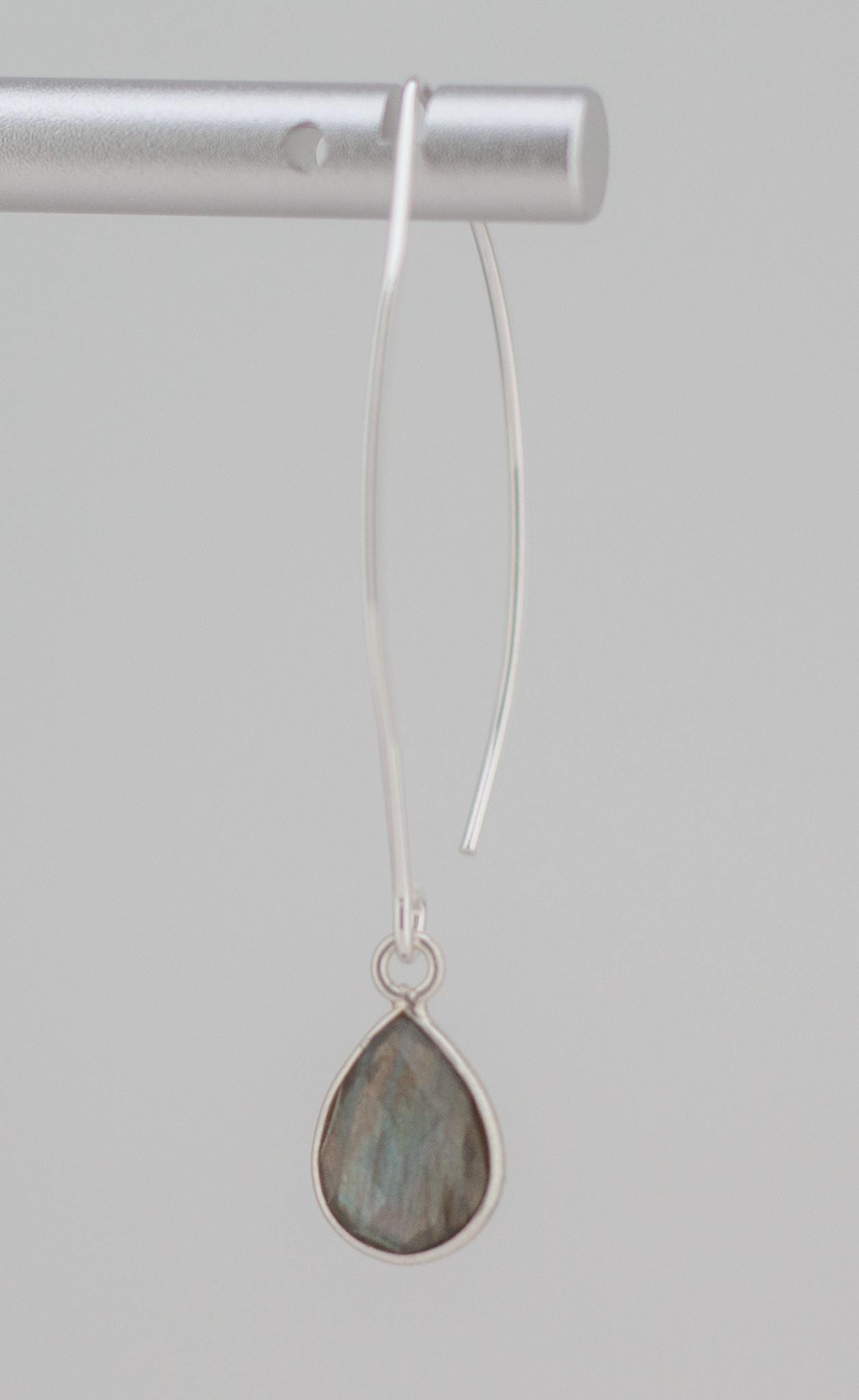 Discover the beauty of labradorite with these minimalist fishhook style silver drop earrings. Made with shimmering labradorite and sterling silver bezels, they will elevate your everyday look and add a touch of simple elegance to any outfit. With sparkling teardrop shaped grey gemstones and dainty silver ear wires, these exquisite long earrings are a the perfect addition to you boho chic labradorite jewelry collection that will never go out of style.