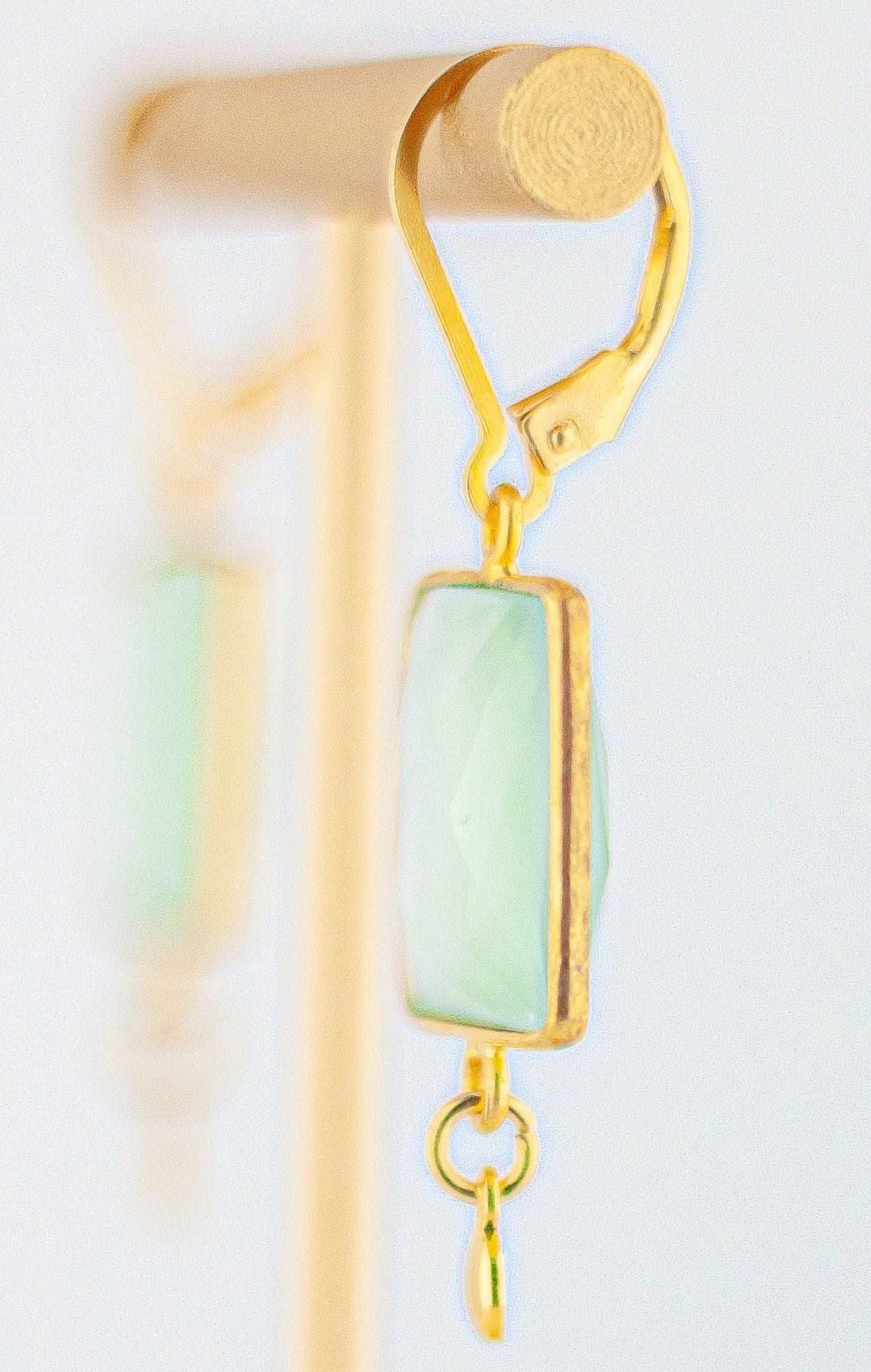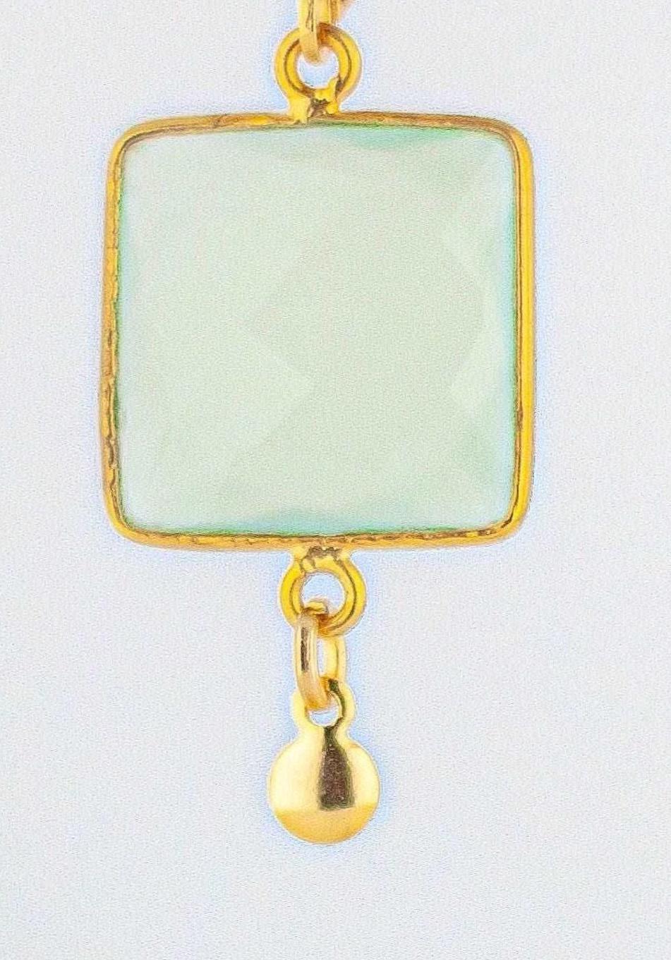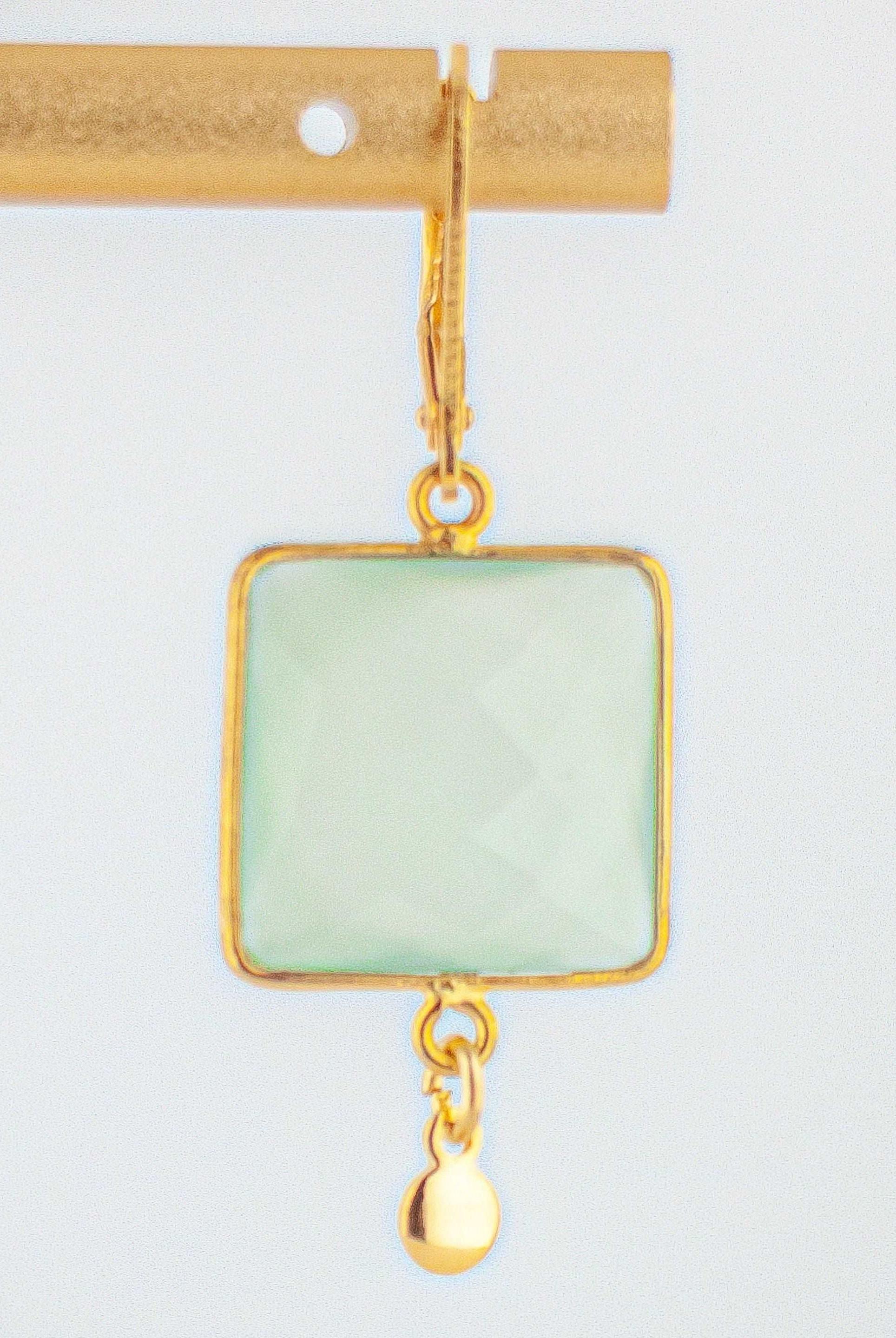 Elevate your jewelry collection with these stunning light green chalcedony earrings. Featuring natural chalcedony stones cut into a modern square shape, each gem is framed with bright gold accents that enhance the stone’s soft green hue. The combination of geometric design, vintage retro inspiration, and contemporary elegance creates a pair of dainty gold earrings that feels both timeless and unique.