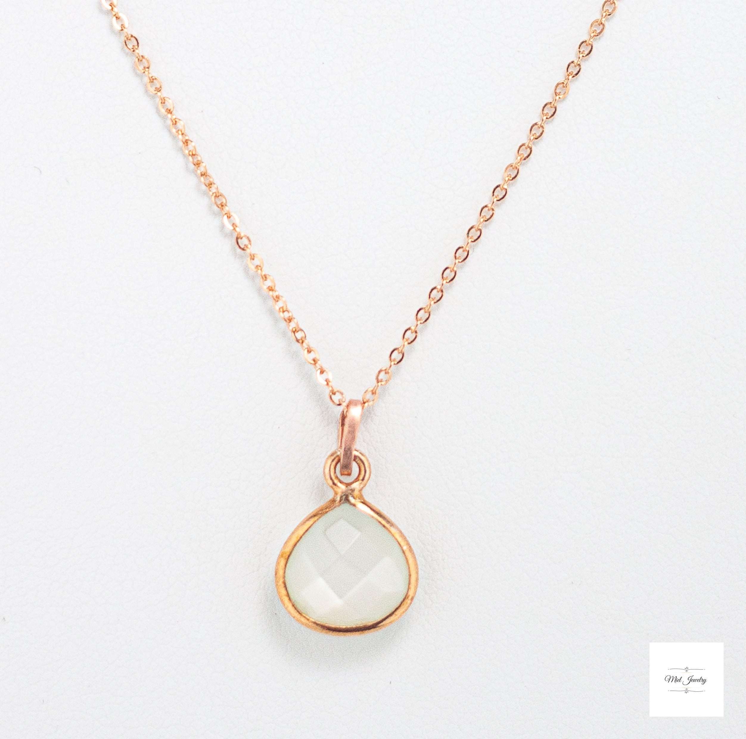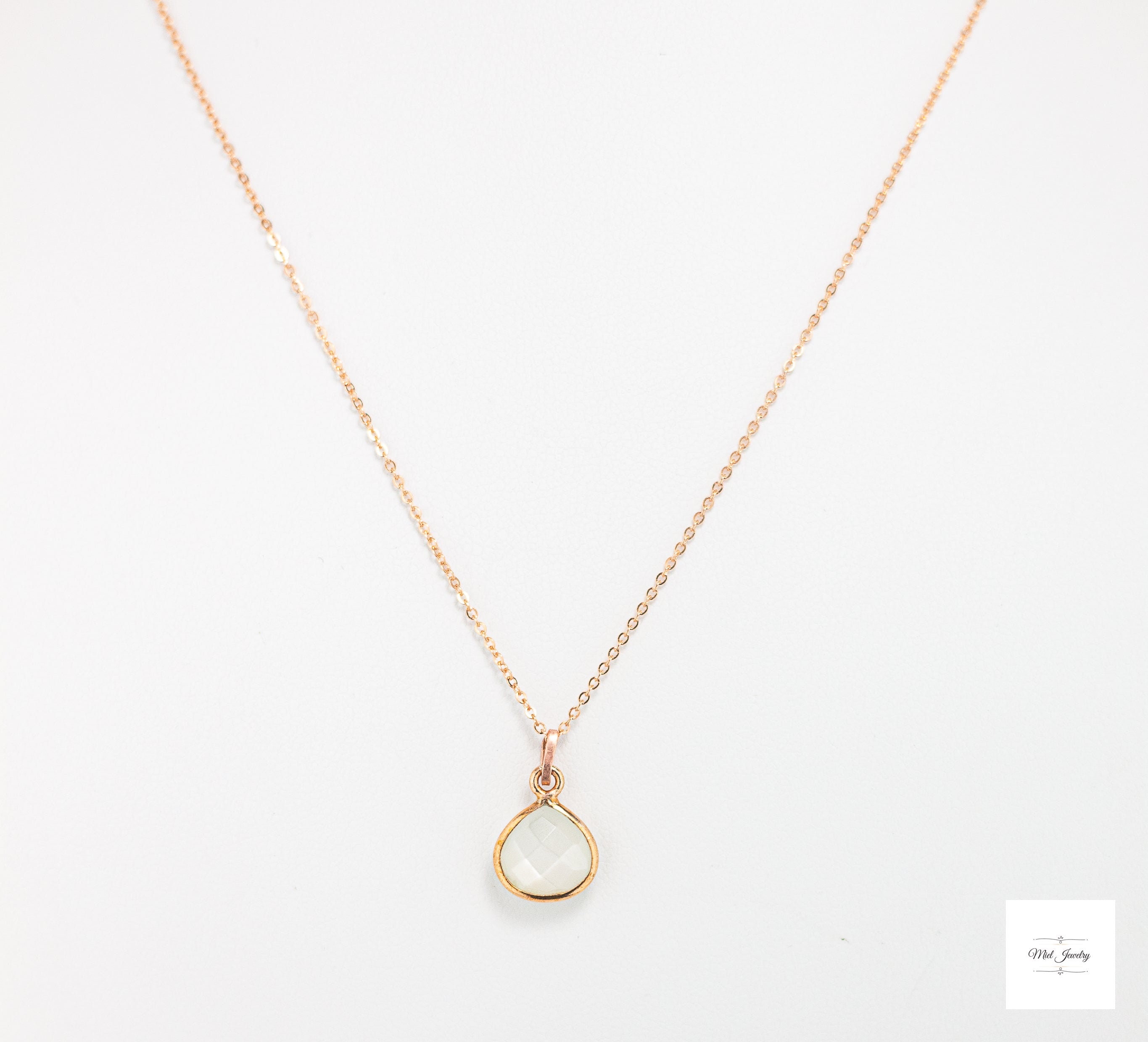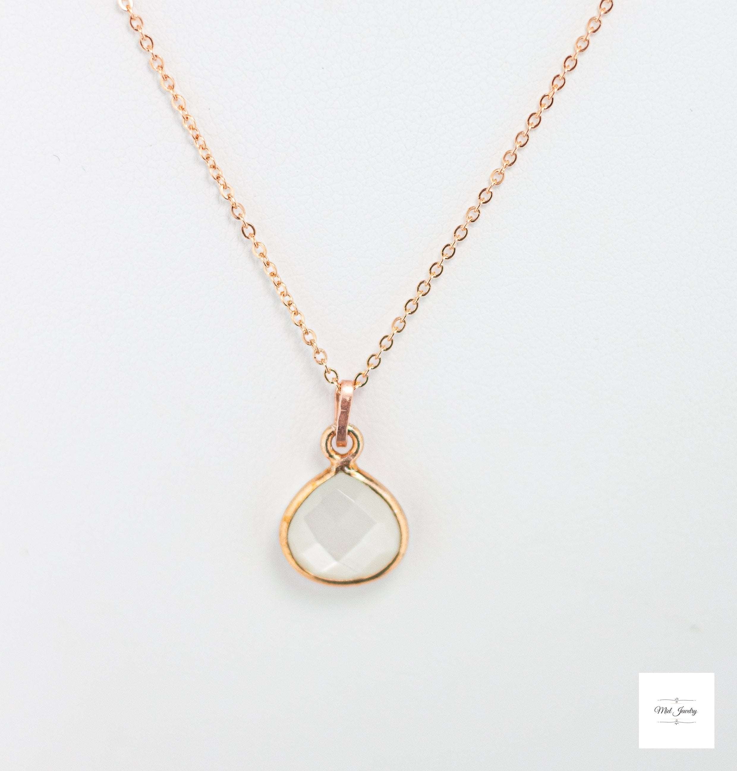 Indulge in the enchanting delicate beauty of this Dainty Moonstone Charm Necklace. Featuring a mesmerizing pear-shaped white moonstone that hangs gracefully from a dainty rose gold chain, this rose gold necklace is adorned with a hand-textured rose gold bail for a touch of unique carefree elegance. Perfect for layering, this sweet and charming pink necklace adds a subtle yet captivating shimmer to any outfit. It's a timeless addition to your rose gold jewelry collection or a sentimental gift for a loved one. This pretty, minimalist white and pink gemstone necklace will be treasured for years to come. Elevate your boho chic style with this stunning moonstone necklace and embrace its enchanting mystical beauty. Perfect for bridesmaids, wedding guests, birthday and a meaningful gift. Don't miss out on this must-have pink and white accessory that combines elegance and charm, sure to be treasured addition to your moonstone jewelry collection for years to come!