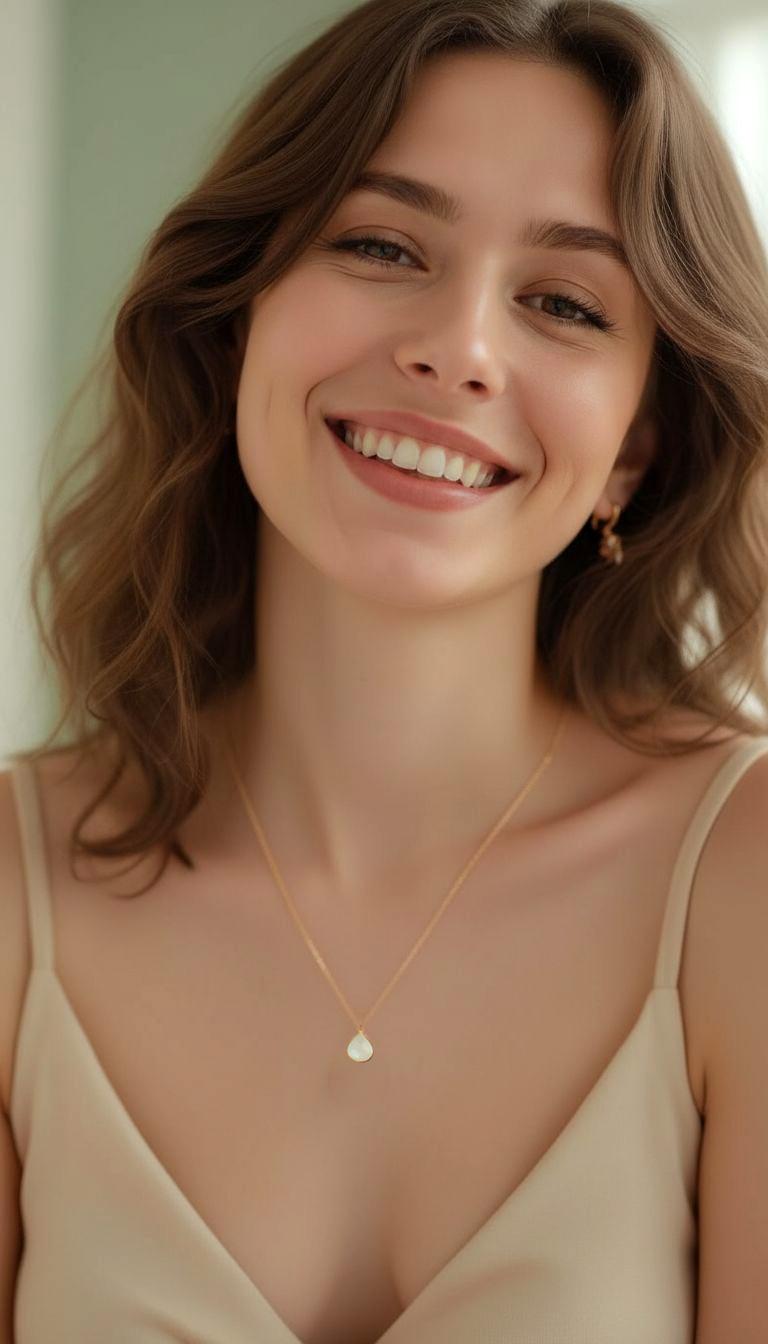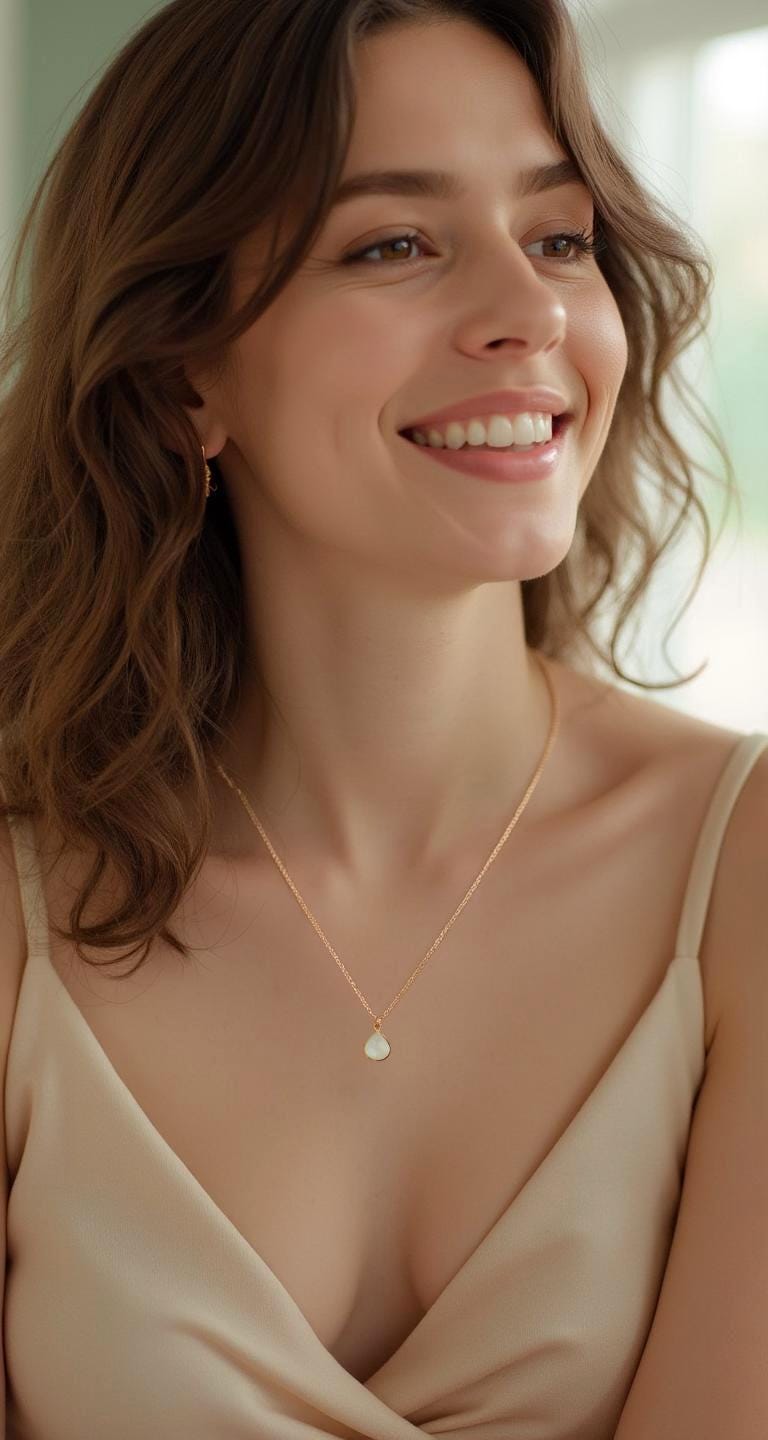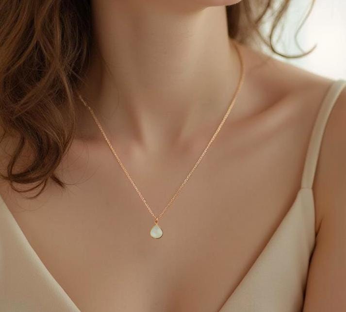Indulge in the enchanting delicate beauty of this Dainty Moonstone Charm Necklace. Featuring a mesmerizing pear-shaped white moonstone that hangs gracefully from a dainty rose gold chain, this sweet and simple pink necklace is adorned with a hand-textured rose gold bail for a touch of unique carefree elegance. Perfect for layering, this feminine and charming gemstone necklace adds a subtle yet captivating shimmer to any outfit. It's a timeless addition to your rose gold jewelry collection or a sentimental gift for a loved one. Elevate your boho chic style with this stunning minimalist moonstone necklace and embrace its enchanting mystical beauty. Perfect for bridesmaids, wedding guests, birthday and a meaningful gift. Don't miss out on this must-have understated white accessory that combines elegance and charm, sure to be treasured addition to your moonstone jewelry collection for years to come!