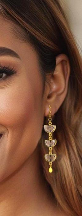 Indulge yourself in the luxurious and captivating beauty of these boho luxe smokey quartz earrings. These stunning long dangling gold statement earrings featuring elegant shimmering smokey quartz stones and dazzling light-catching gold leafed accents. These gorgeous glamorous quartz earrings dangle and catch the light beautifully, illuminating the mesmerizing beauty of sparkling amber brown and golden hues. You will turn heads and start conversations with these stunning sophistocated brown drop earrings. Elevate any evening dress or statement outfit or treat a loved one to an unforgettable gift with these irresistible earrings that are at once both timeless and modern. They will be an unforgettable addition to your quartz jewelry collection.