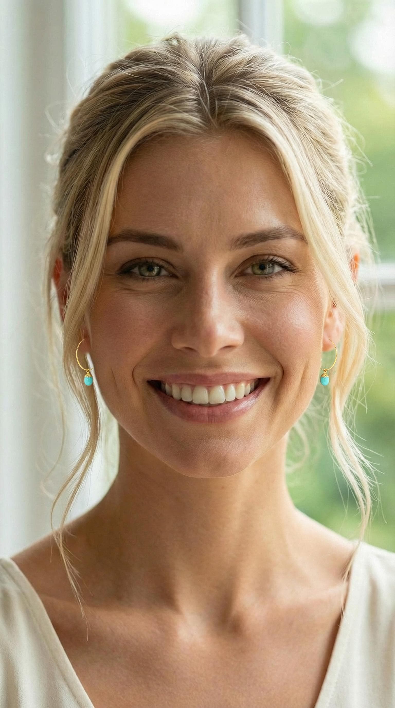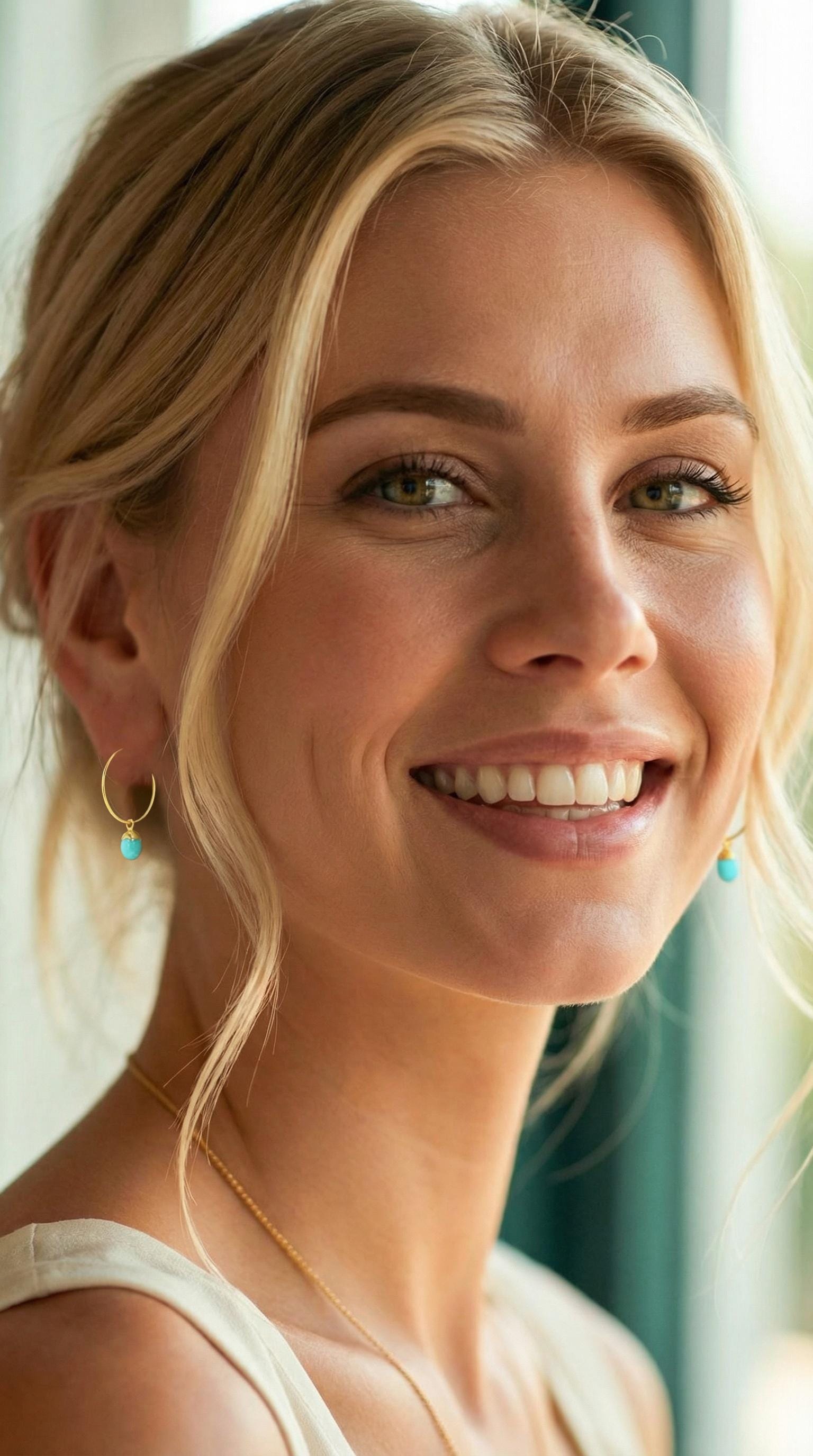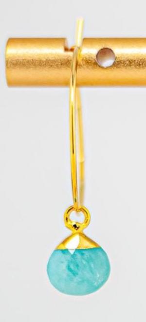 Experience effortless elegance and enhance your boho luxe style with these Dainty Gold Hoop Earrings featuring natural Amazonite gemstones and shimmering gold leaf accents. Adorned by natures beauty - these little Amazonite stones boast natural patterns in dominant shades of teal green and subtle shades of mint, and very subtle hues of pale yellow, aquamarine seafoam green, white, beige and cream. These delicate gold drops beautifully perfectly sized for everyday wear are crafted from lightweight but durable gold stainless steel, ensuring durability and longevity. Perfect for any occasion, these unique green earrings blend sophistication with bohemian charm, making them an essential addition to your jewelry collection. Elevate your understated boho chic style with these elegant and versatile small hoop earrings.