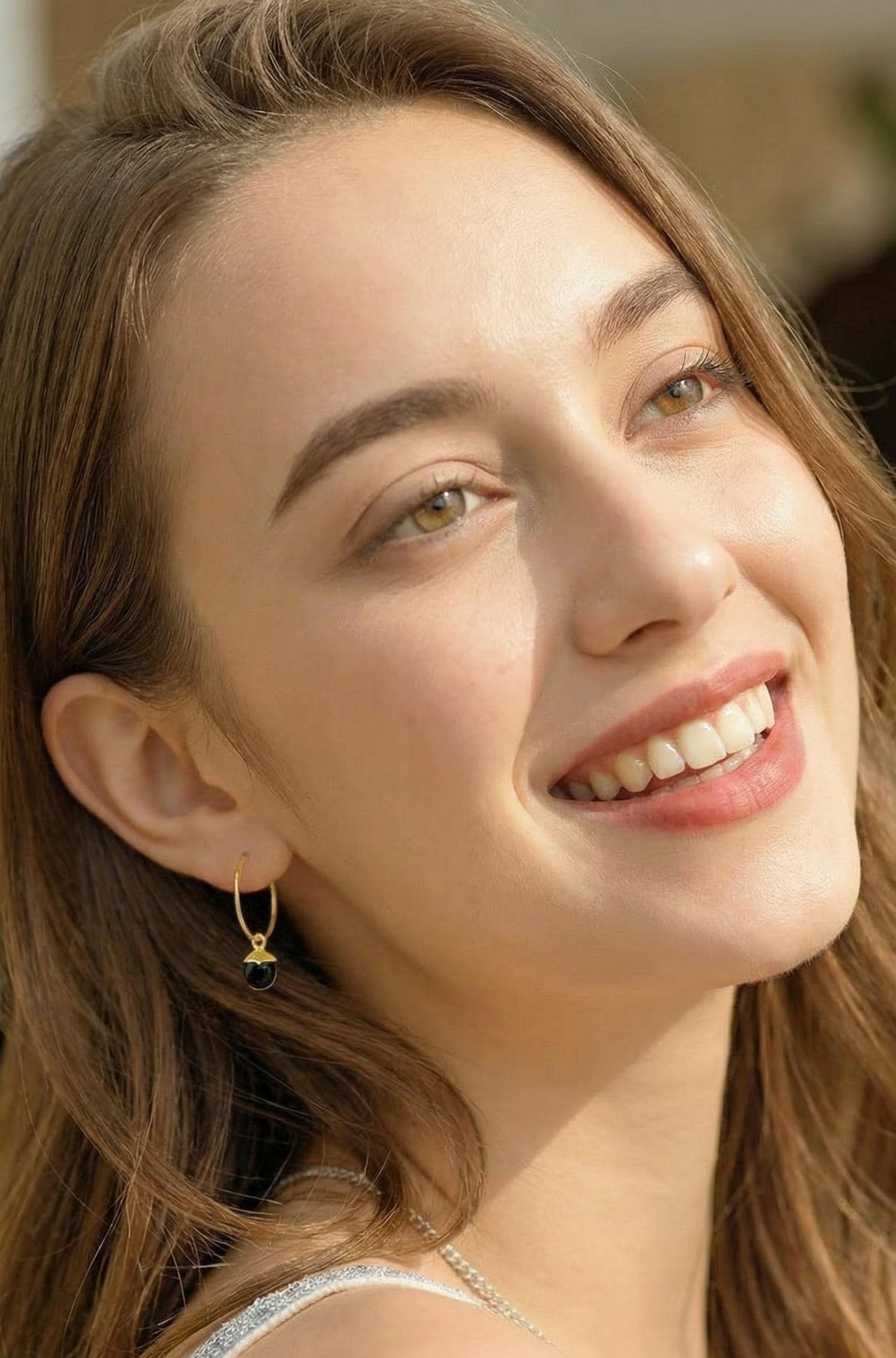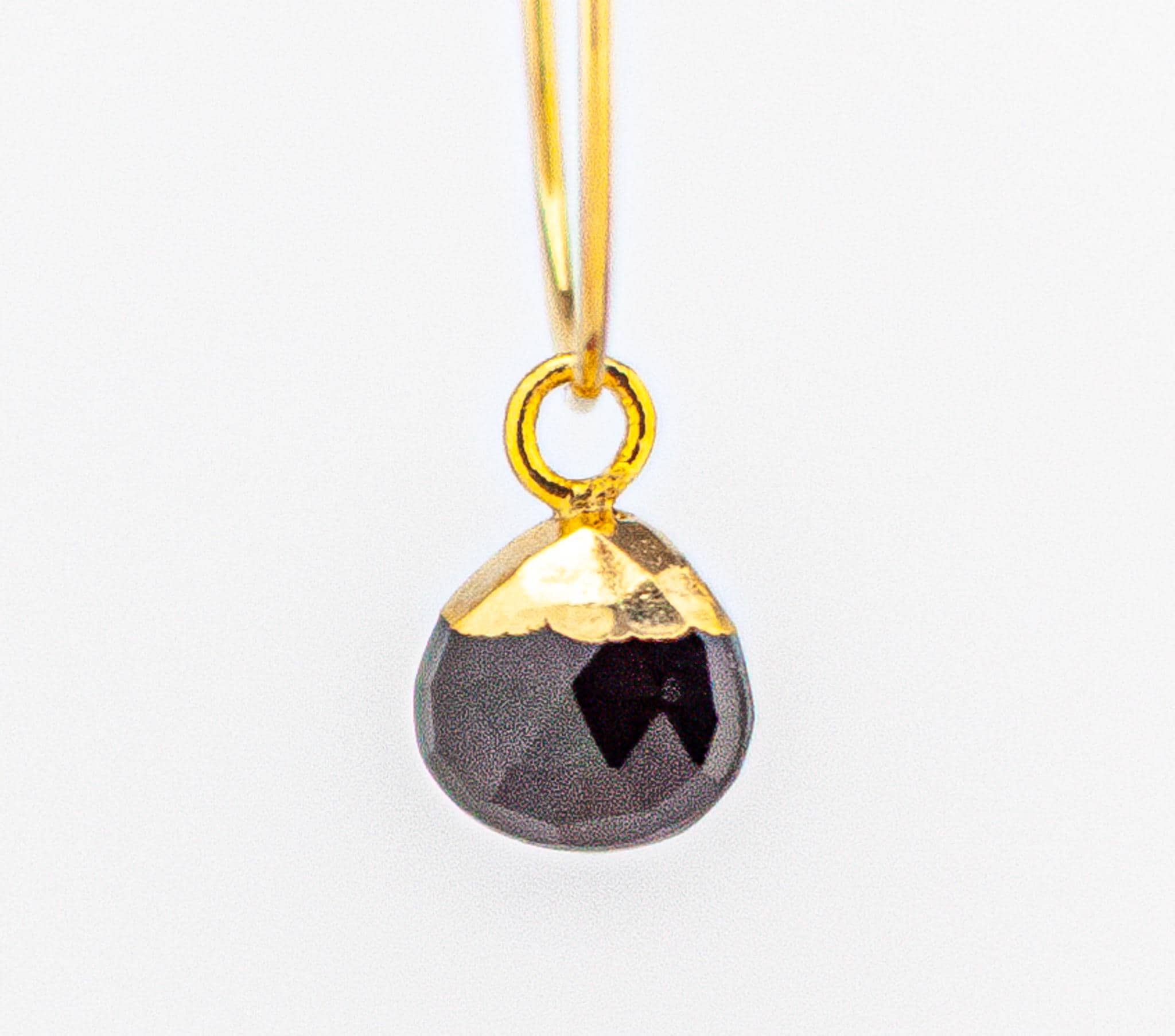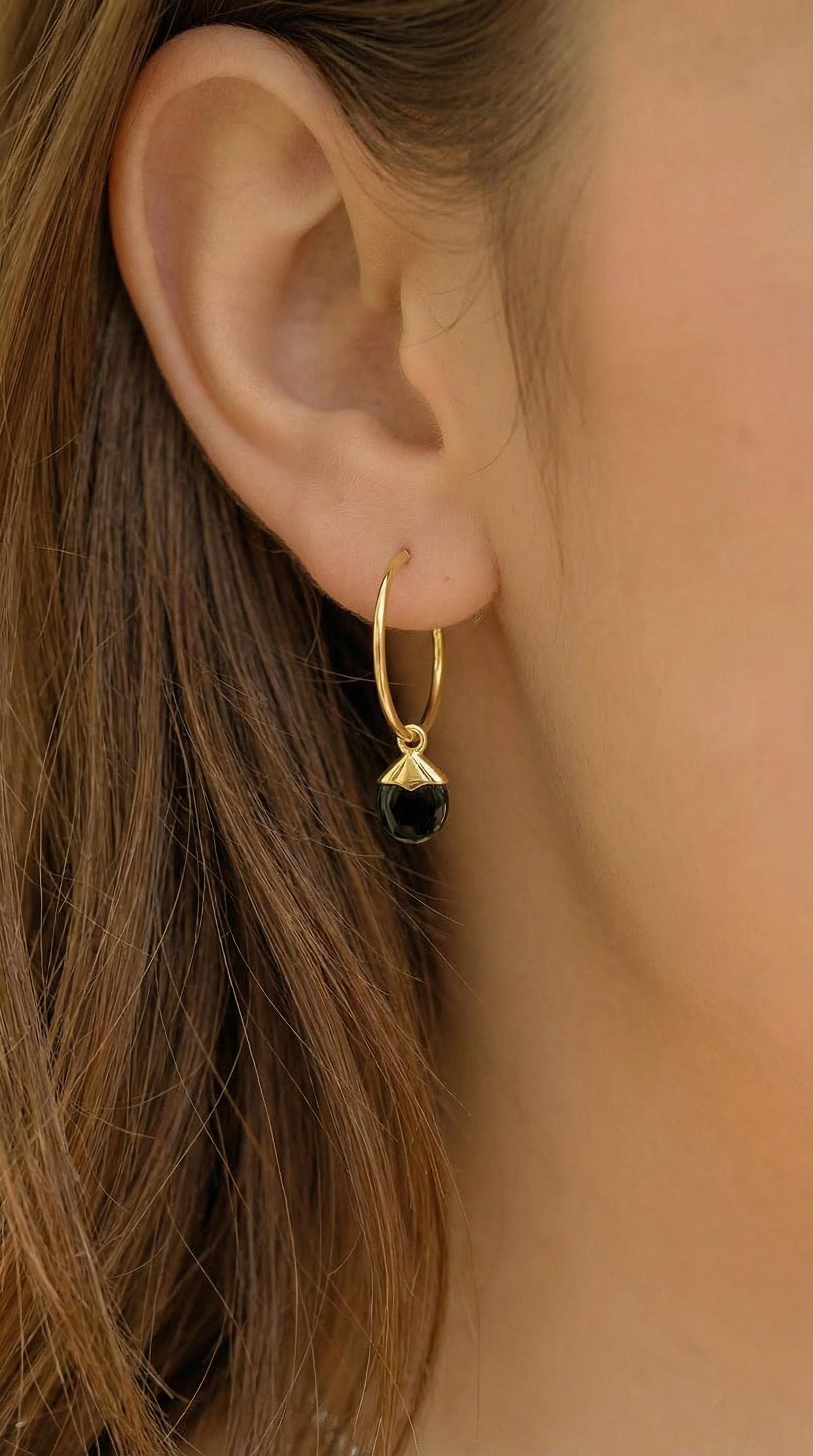 Add a touch of elegance and boho chic style to your look with these Dainty Black Onyx Hoop Earrings featuring gold leaf accents. These small gold stainless steel hoop earrings are adorned with sleek black onyx gemstones, creating a shimmering contrast that is perfect for any occasion. The gold leaf accent adds a luxurious touch, making these stunning onyx earrings a versatile modern, minimalist black accessory that elevates casual and formal outfits. Crafted with high-quality gold stainless steel and black onyx stones, these delicate hoops ensure durability and comfort, making them ideal for everyday wear.