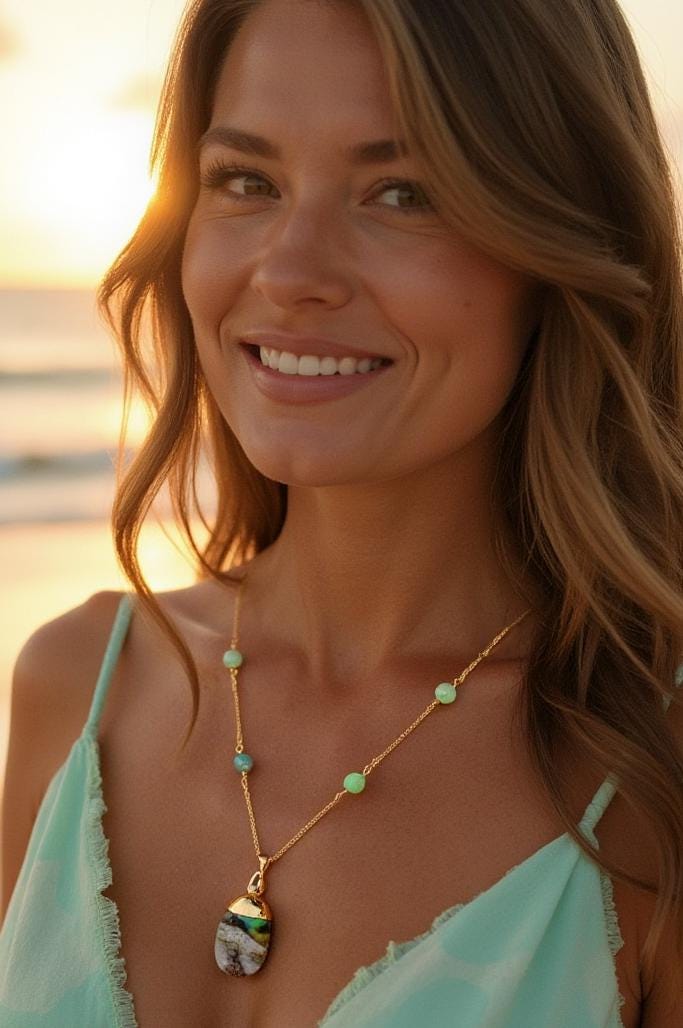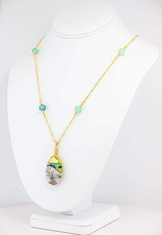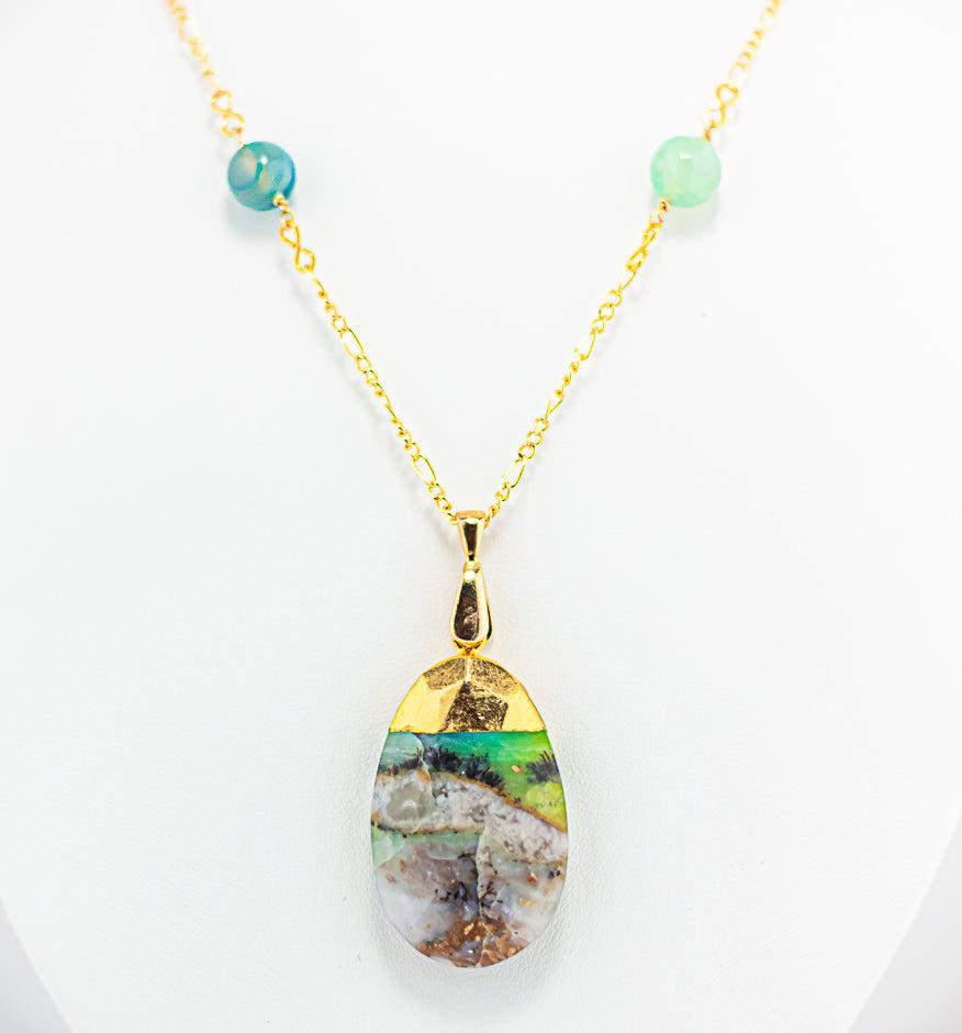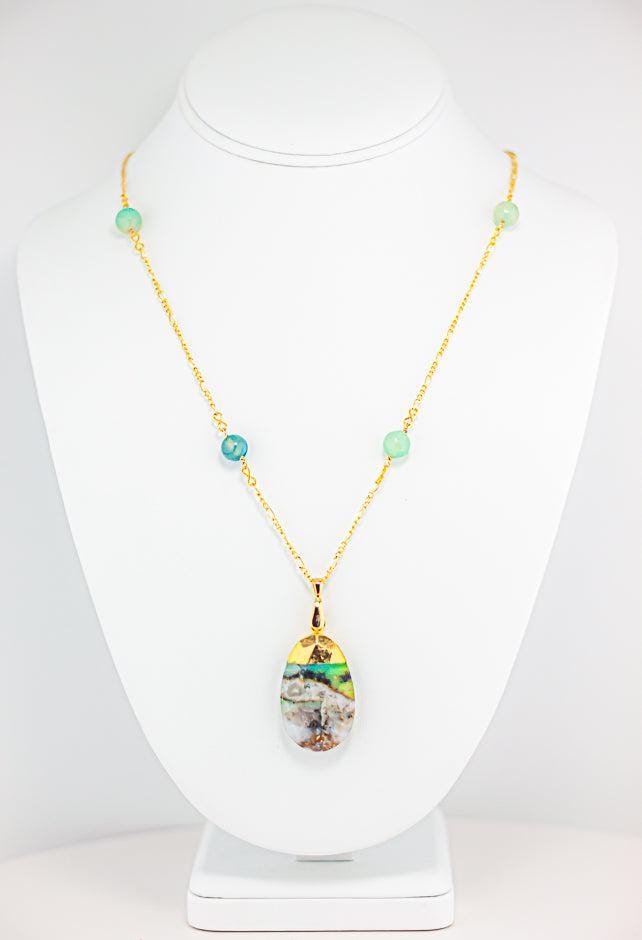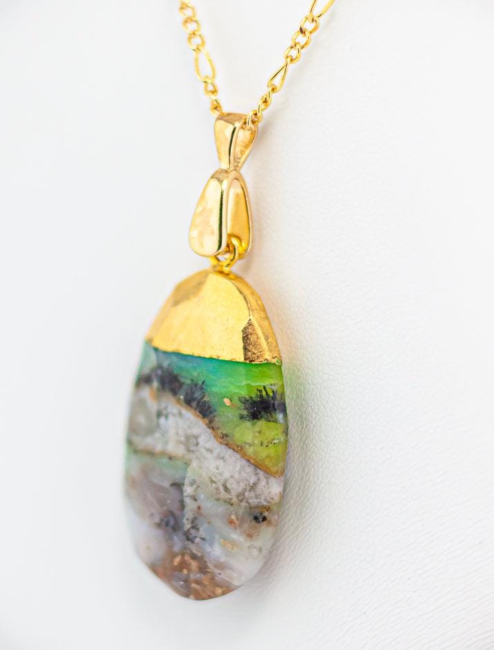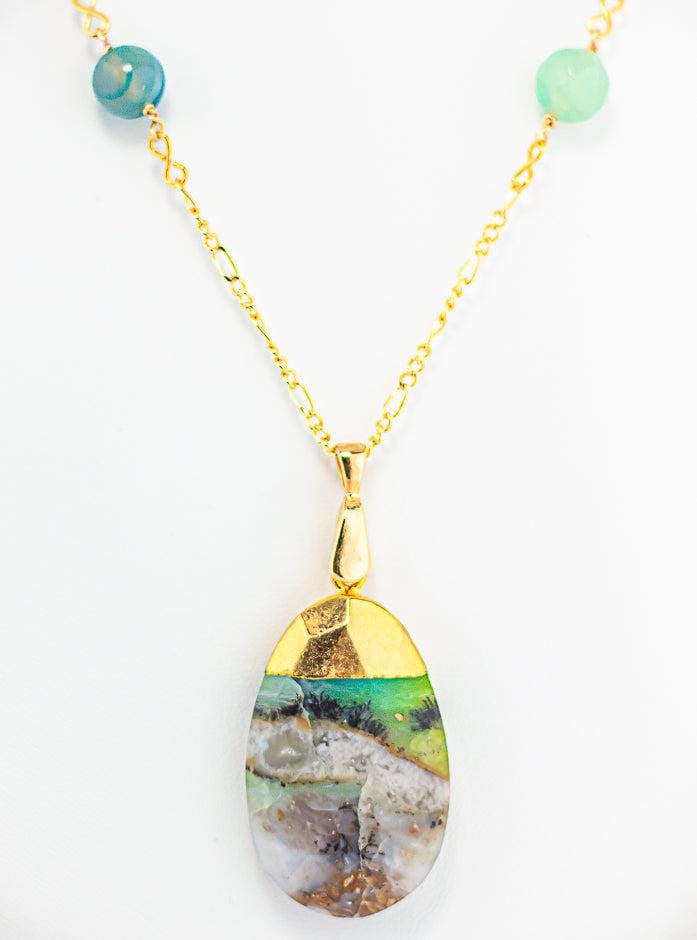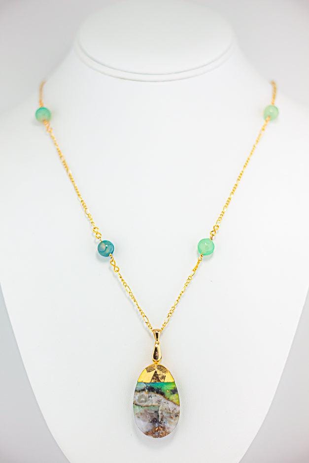 Elevate your style with this stunning Boho Chic Peruvian Opal Statement Necklace featuring shimmery blue and seafoam green agate gemstone beads and an elegant gold leaf accent. The delicate gold chain perfectly complements the captivating natural patterns of the multicolor gemstone, which display of natures artistry displaying an array of blue, green, grey, black, brown, beige, white, yellow, and mauve hues. The matte finish of the natural opal stones is beautifully contrasted by the gold leaf detail and the bright gold chain, creating a unique and eye-catching gold necklace. This bold and beautiful opal pendant necklace is perfect for adding a touch of boho luxe elegance and bold earthy style to both casual and formal outfits. This unique and beautiful beaded gold statement necklace is perfect for any occasion, combining the beauty of bold feminine elegance with a sleek refined modern twist.