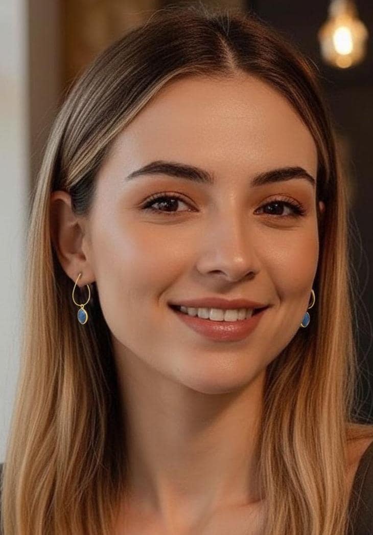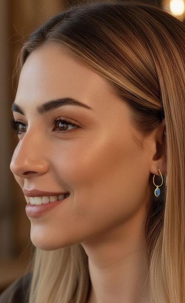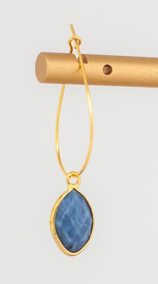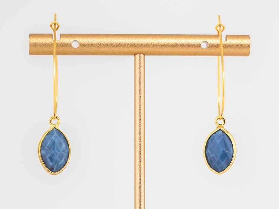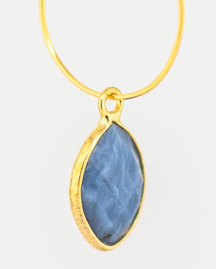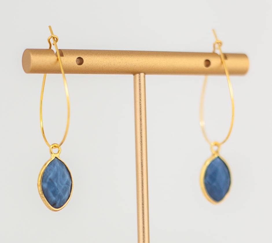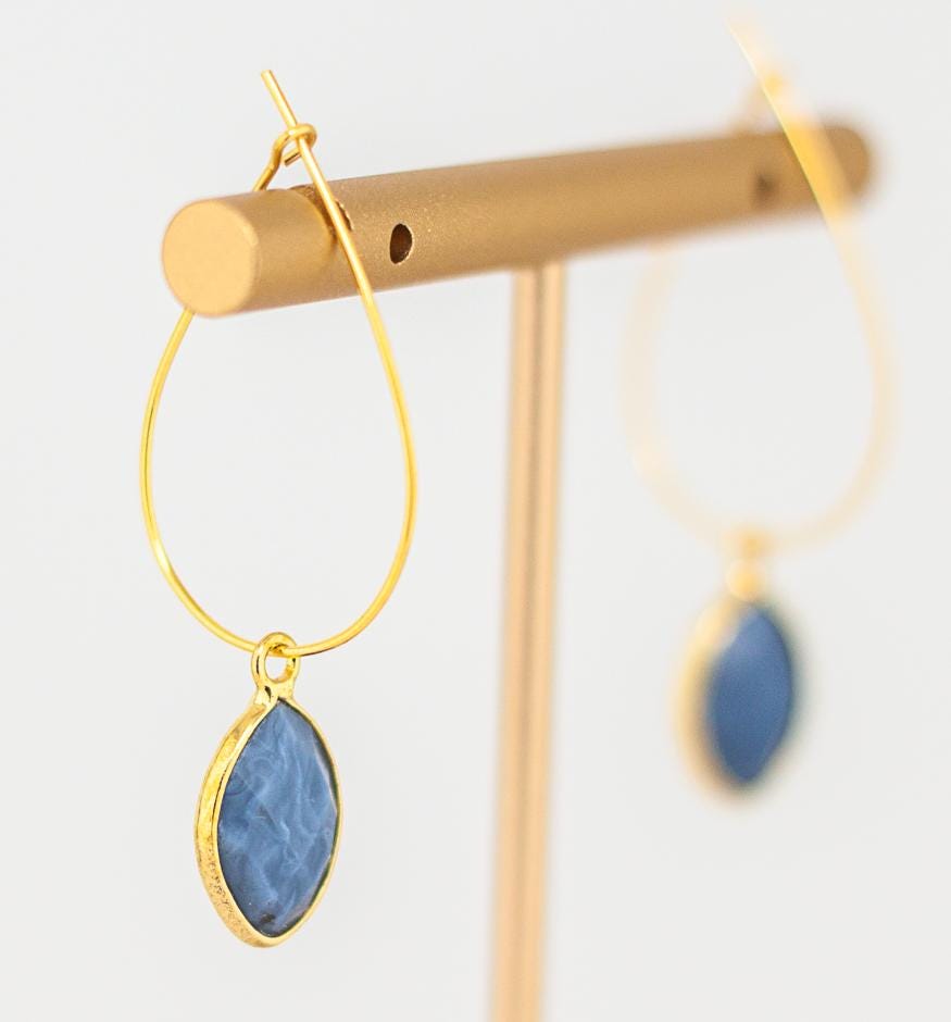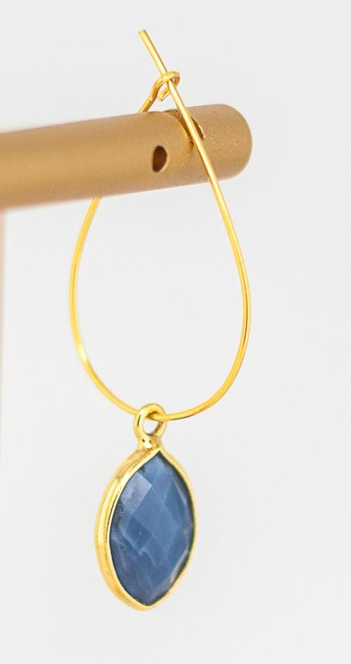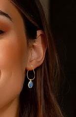 Indulge in the unique charm of these Dainty Dusty Blue Opal Gold Hoop Earrings, a perfect blend of boho chic style and timeless elegance. These very dainty blue opal earrings feature small, pear-shaped gold stainless steel hoops adorned with delicate Peruvian Opal charms. The opal stones come in a stunning dusty blue hue, adding a unique pop of color to your look. Their versatility and effortless elegance make them perfect dainty hoop earrings for everyday wear or a special occasion. Make a statement with these unique and eye-catching blue earrings that will turn heads wherever you go.
