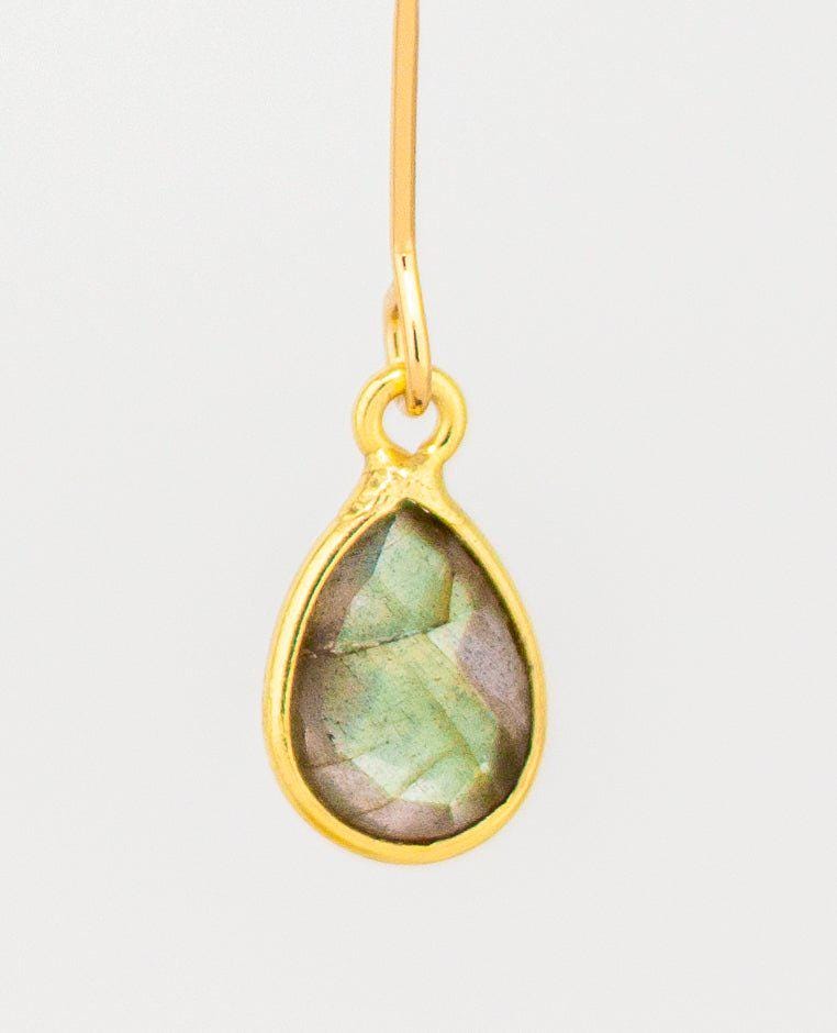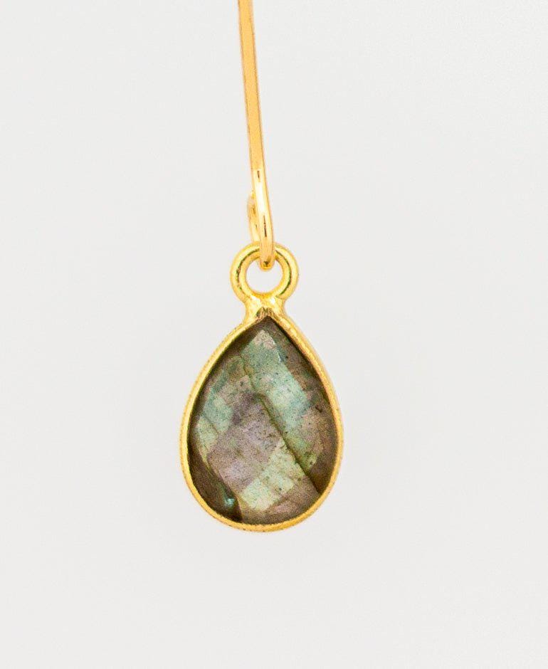 • These teardrop-shaped labradorite stones have shimmering hues of grey, amber, green, gold,