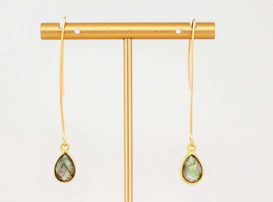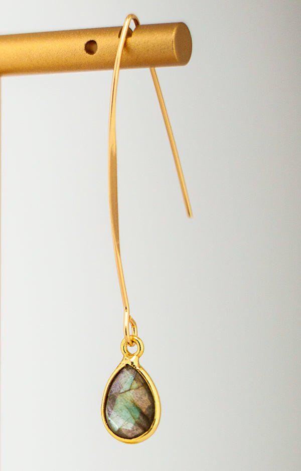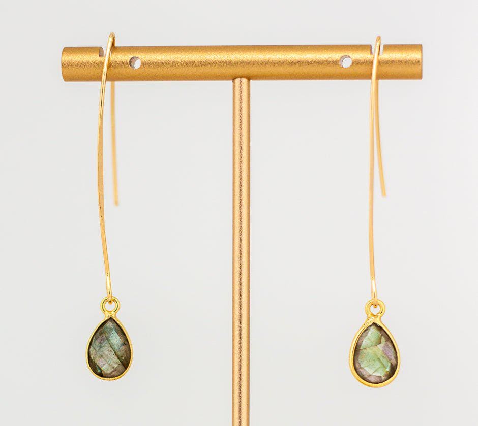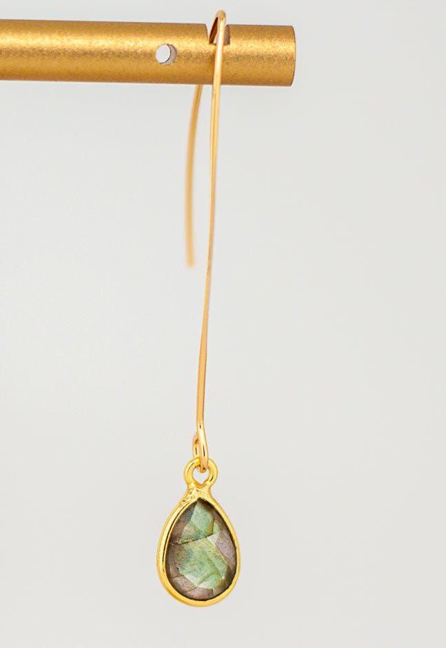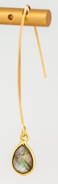 Enhance your everyday outfits with these stunning Labradorite Earrings featuring dainty gold fishhook style ear wires. These long gold drop earrings showcase shimmering labradorite gemstones that catch the light beautifully, adding a touch of understated boho chic elegance and intrigue to any outfit. These beautiful minimalist dangles are perfect for any occasion, combining the beauty labradorite with warm gold accents for feminine elegance with a sleek refined modern twist. Crafted with delicate gold fishhook ear wires, these earrings provide a comfortable and secure fit, making them perfect for both everyday wear and special occasions. The captivating labradorite stones, known for their unique play of colors, make these earrings a standout piece in any labradorite jewelry collection.