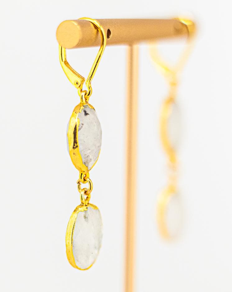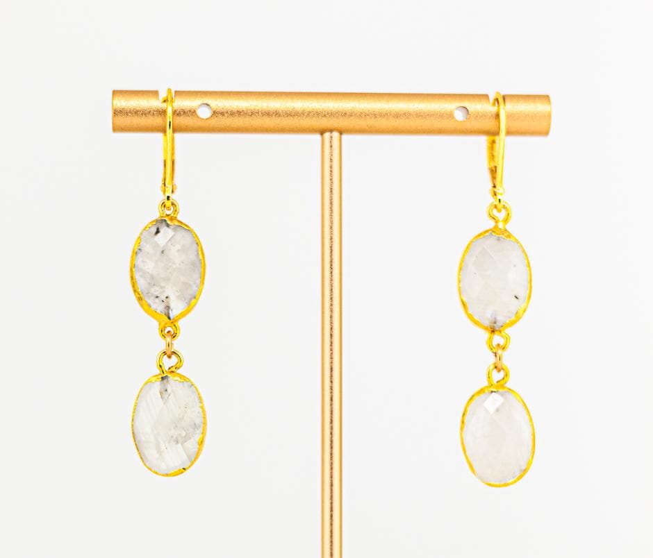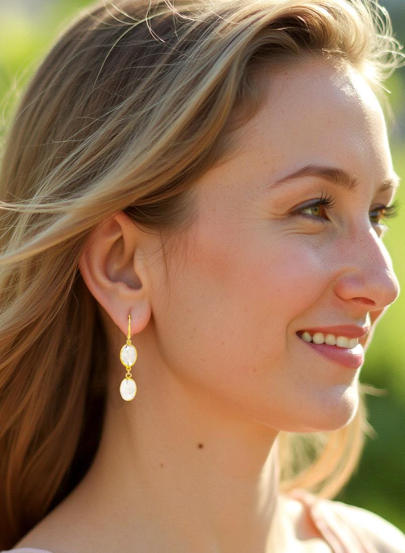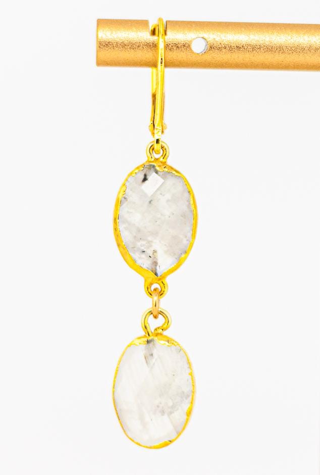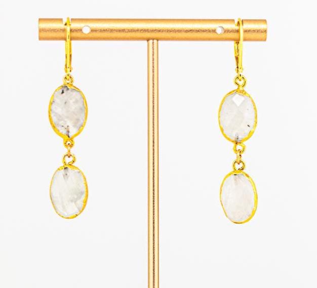 Crafted with attention to detail, these timeless gold moonstone earrings are versatile enough to enhance any outfit, whether dressing up for a special occasion or adding a sophisticated flair to your everyday look. The combination of white rainbow moonstone and warm gold accents creates a harmonious blend of nature inspired boho luxe beauty. These beautiful white and gold earrings an ideal gift for someone special or a stunning addition to your own moonstone jewelry collection. Whether you're dressing up or down, these earrings will make a statement.