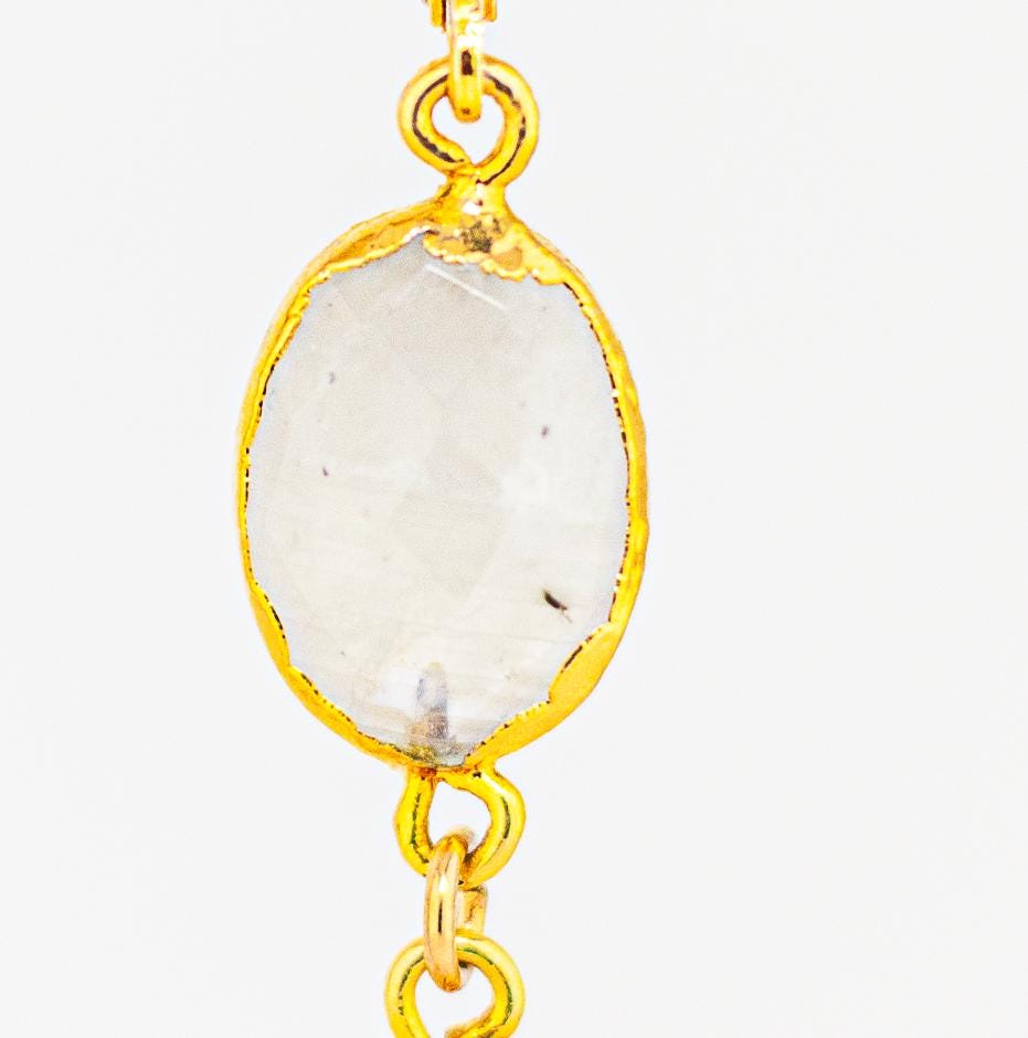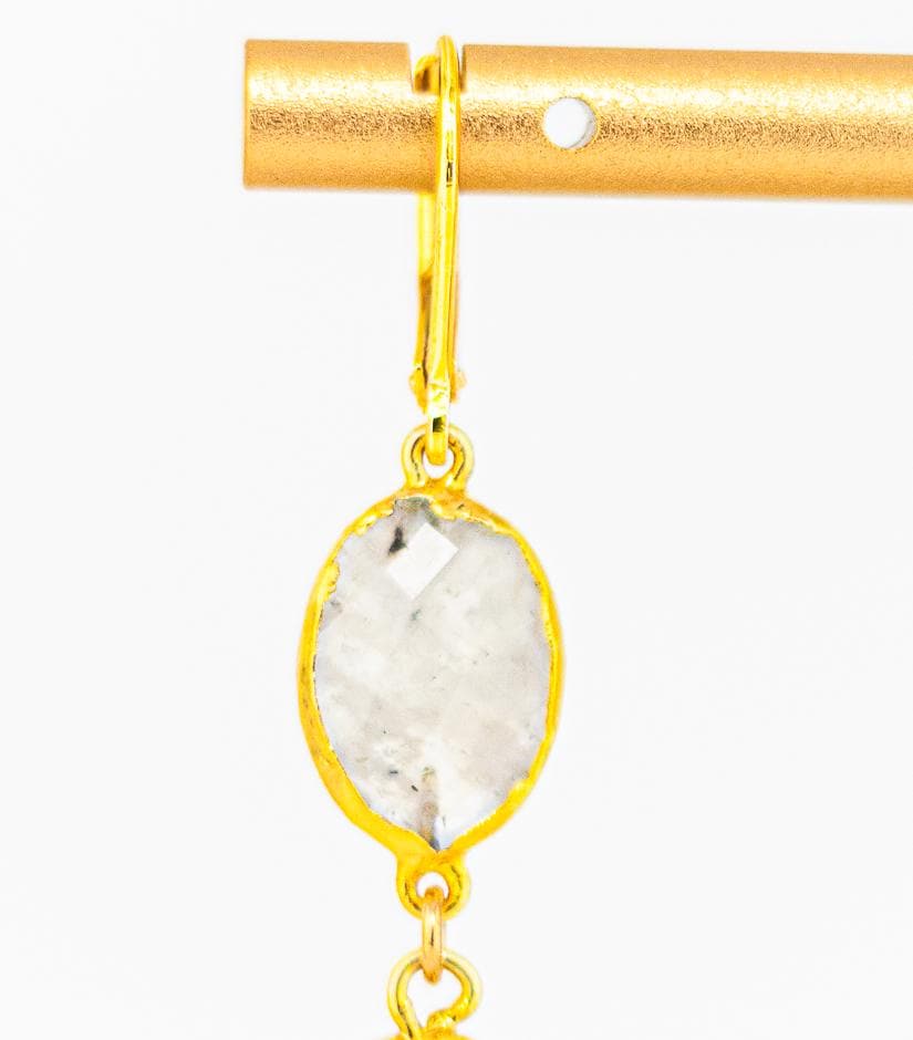 Add a touch of elegance and boho chic style to your ensemble with these stunning Rainbow Moonstone gold Drop Earrings featuring exquisite gold leaf accents. These simple yet elegant white earrings showcase oval-shaped rainbow moonstone stones that shimmer with a radiant play of colors, perfectly complemented by the delicate gold leaf detailing.