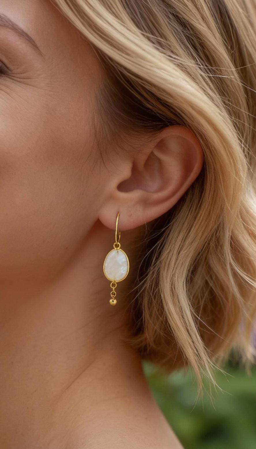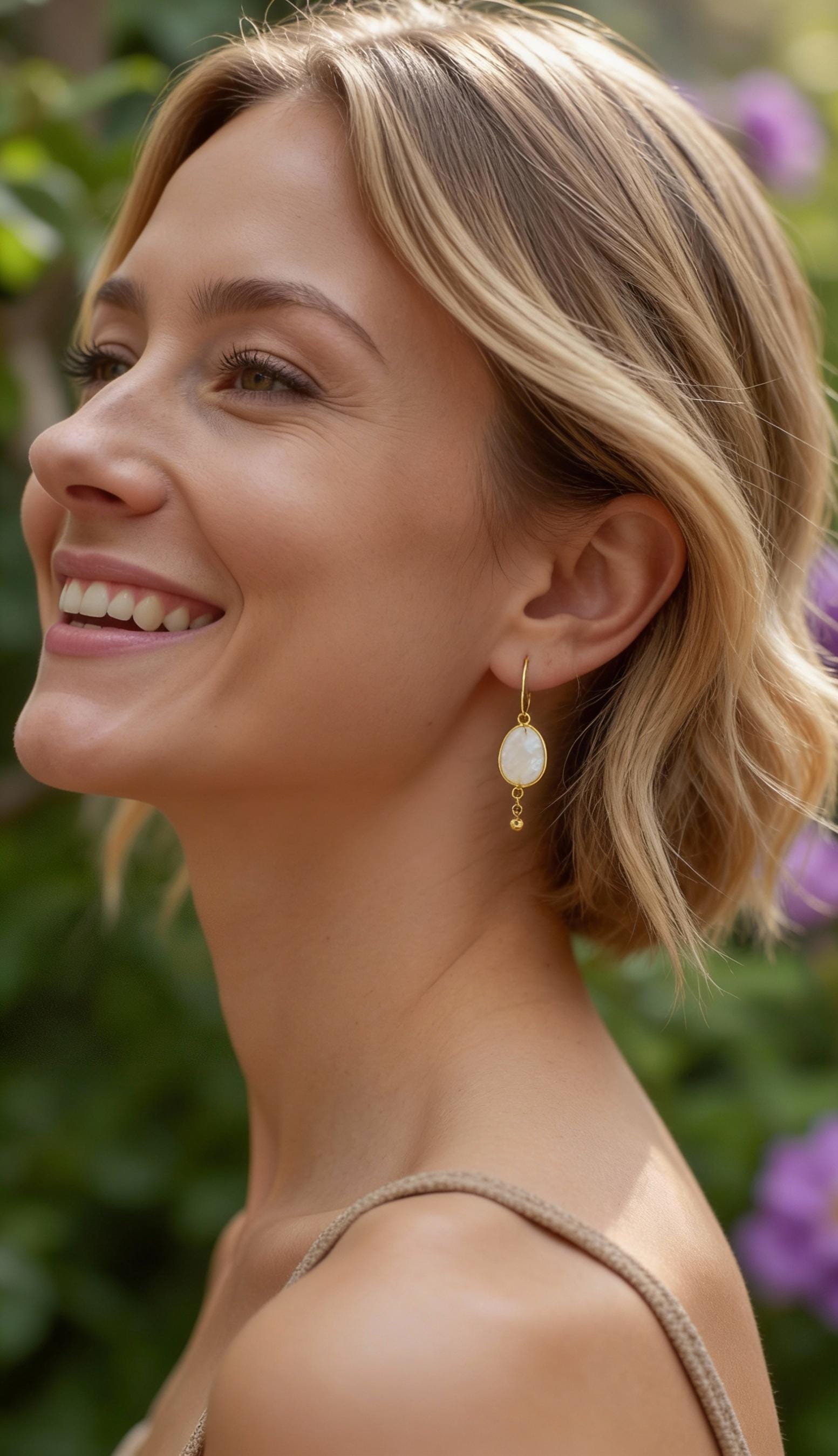 Elevate your style with these Pretty Boho luxe Rainbow Moonstone Earrings, featuring small gold stainless steel hoops and stunning rainbow moonstones. The iridescent moonstones shimmer with soft white hues, perfectly complemented by delicate gold leaf detailing. These dainty gold drop earrings offer a unique blend of elegance and bohemian flair, making them a versatile addition to any statement jewelry collection. Lightweight and hypoallergenic, these unique sophisticated gold hoops are designed for everyday comfort and earthy beauty. Whether you're a boho or vintage bride looking for free spirited bridal accessories, a wedding guest or just dressing up for a special occasion these dangling white gemstone drops are sure to turn heads.