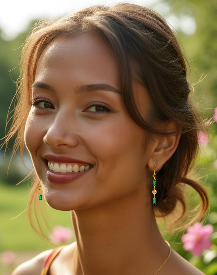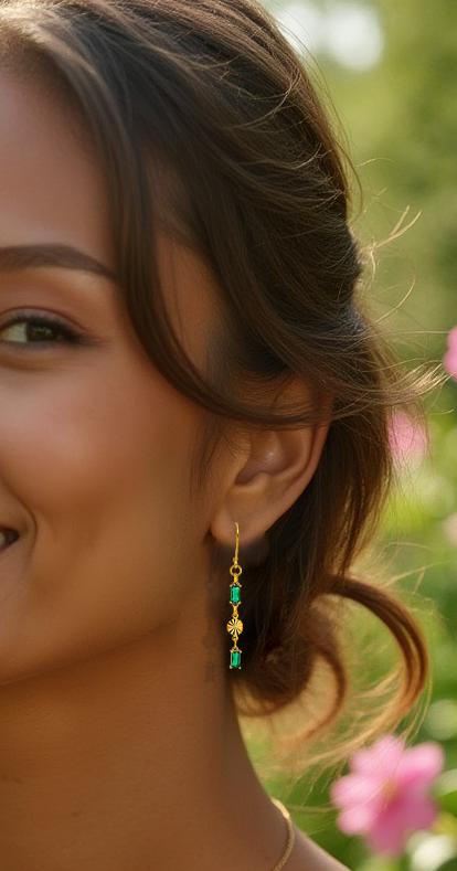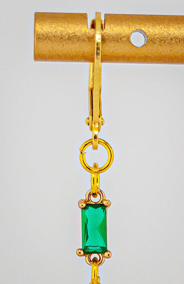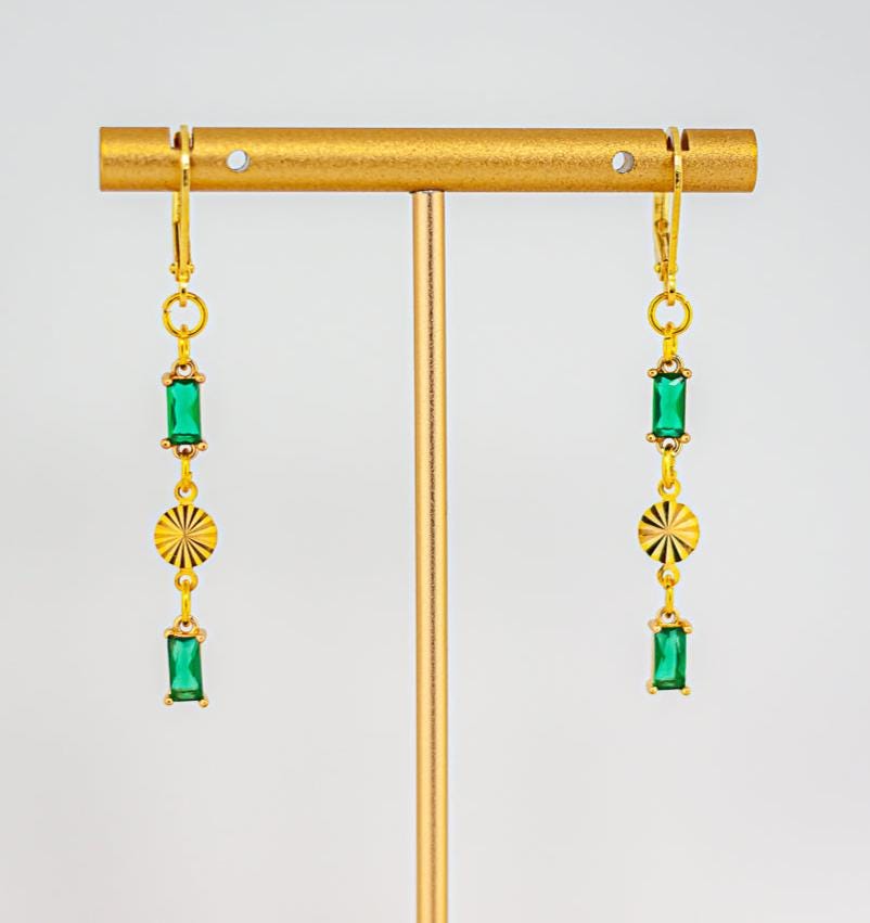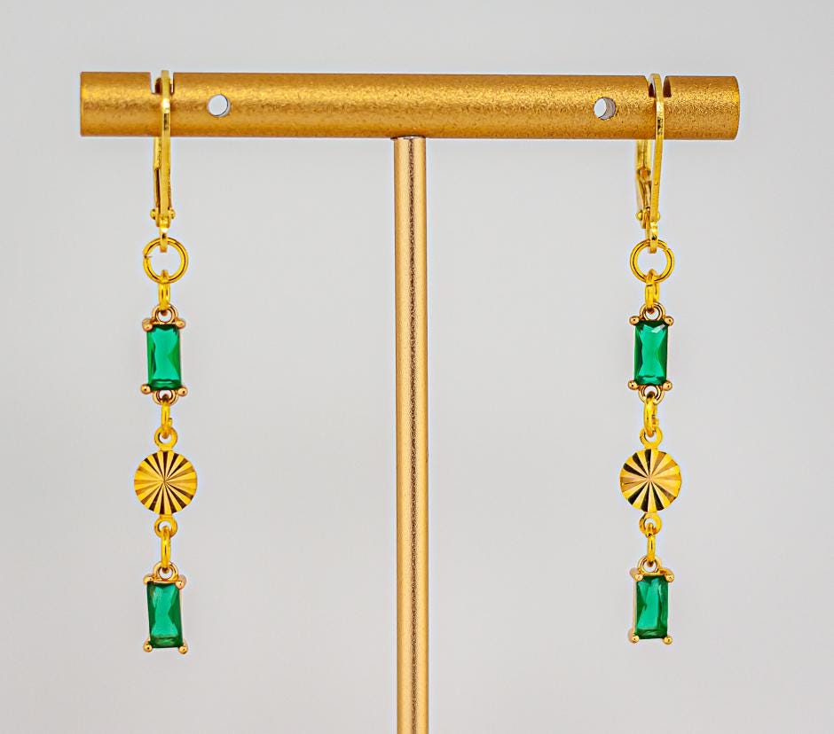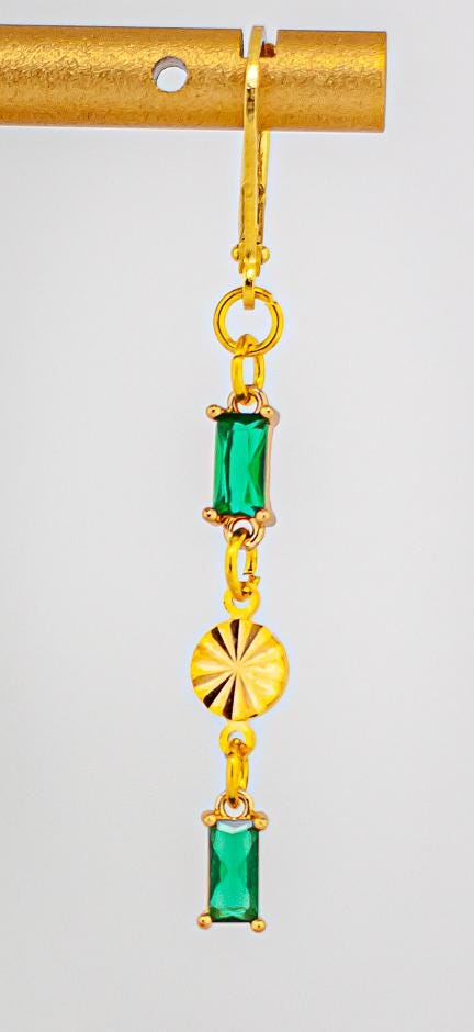 Sparkle and shine in these dainty vintage style gold dangle earrings. These pretty crystal statement earrings features Art Deco-inspired design with emerald green glass links & intricate geometric gold connectors. Ideal for bridesmaids, weddings, date nights, or everyday accessories. Lightweight and versatile glass jewelry, these long understated glamorous green earrings pair effortlessly with any outfit, mixing classic girly subtle sparkle and timeless feminine charm with minimal modern chic drop earring.