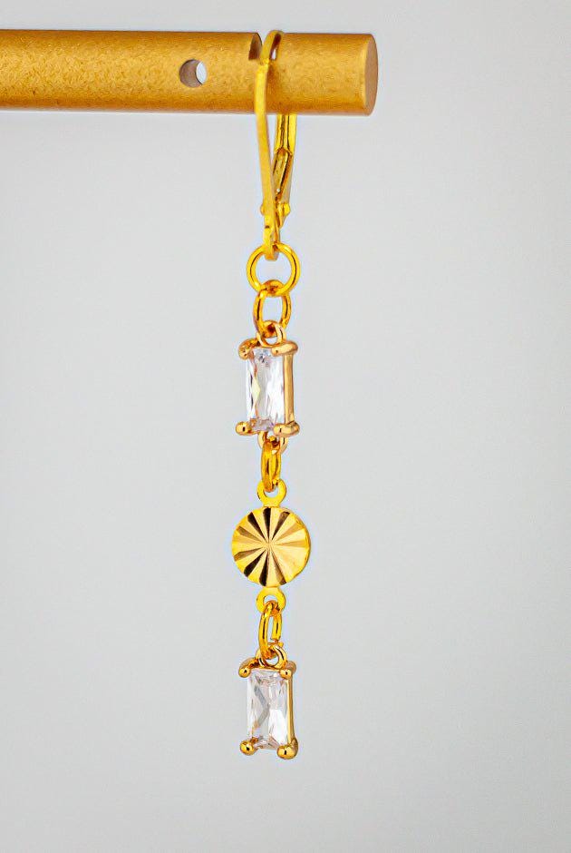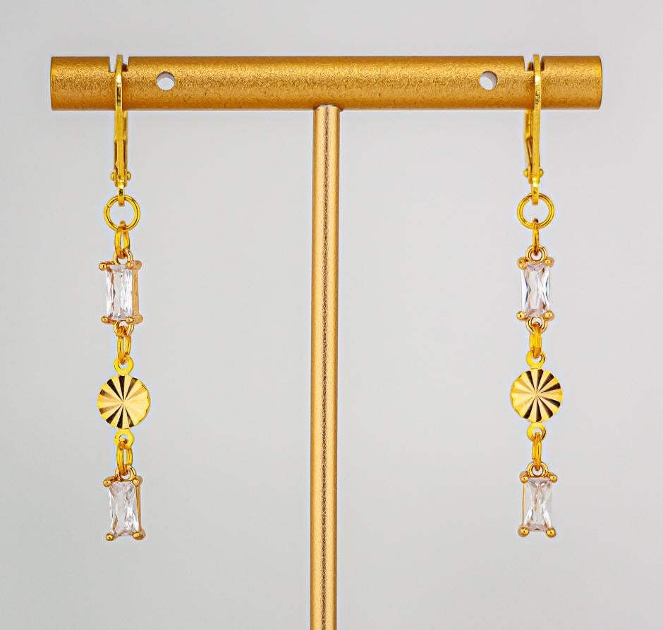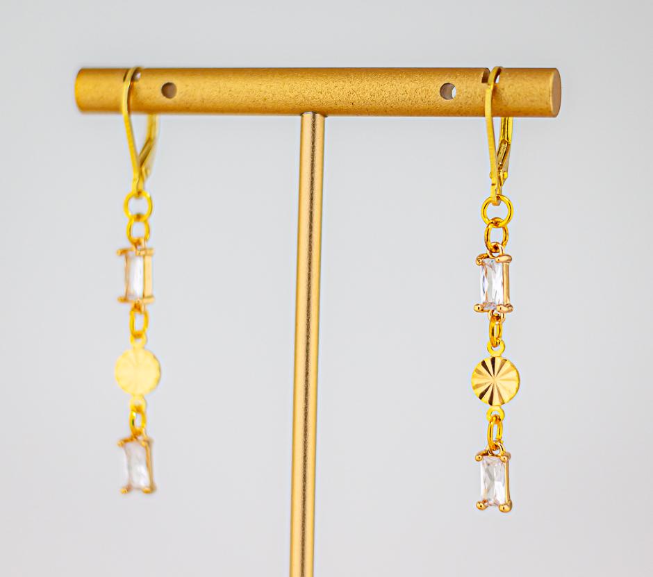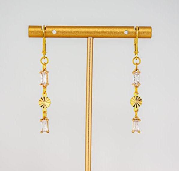 Add a touch of elegance to your look with these art deco inspired Chic Clear Drop Earrings. These vintage style dainty gold drop earrings, feature sparkling clear glass rectangle-shaped links and shimmering geometric gold connectors. They create a beautiful balance of minimalist modern sophistication and timeless feminine style. Perfect for everyday wear and special occasions, these lightweight glass earrings offer eye-catching subtle sparkle that won’t overpower your look and ideal for both everyday wear and special occasions.