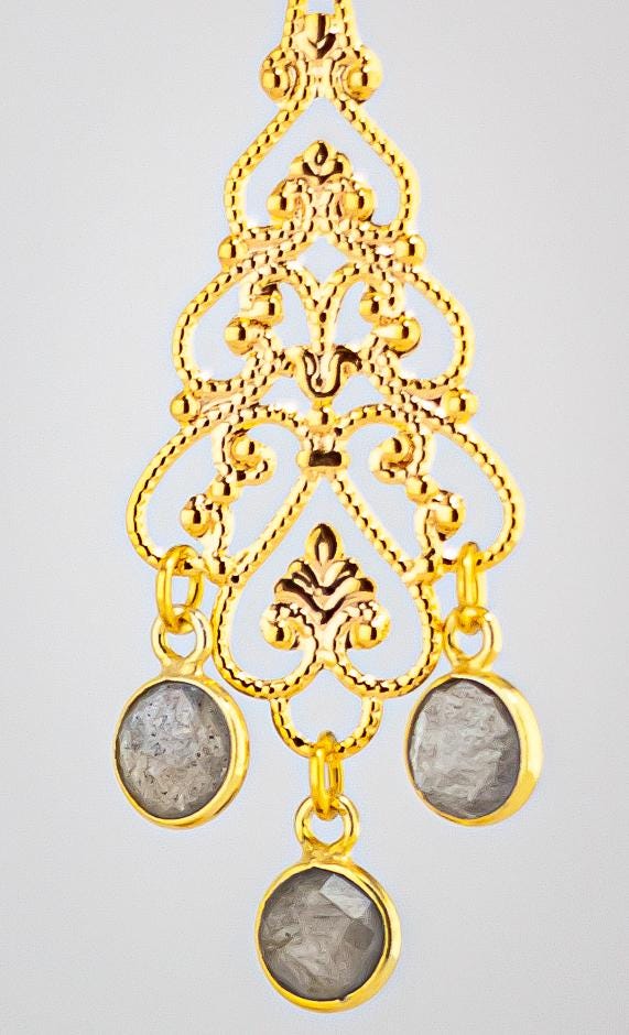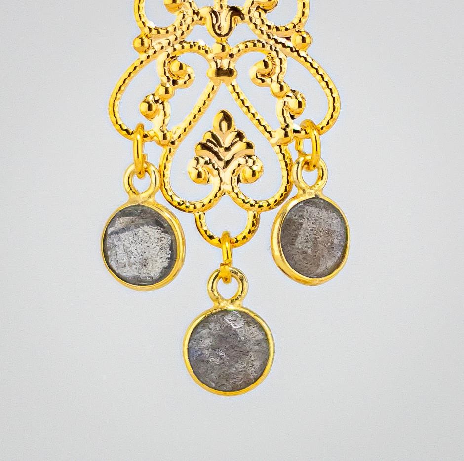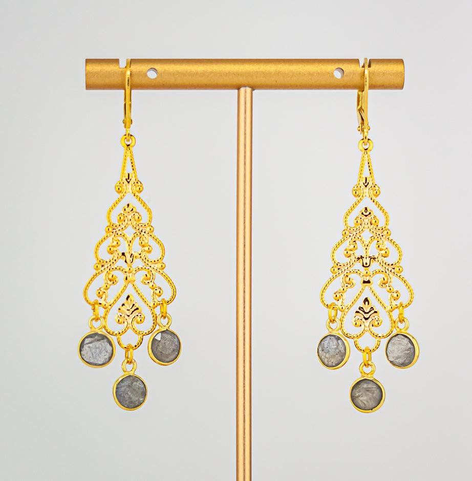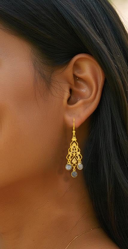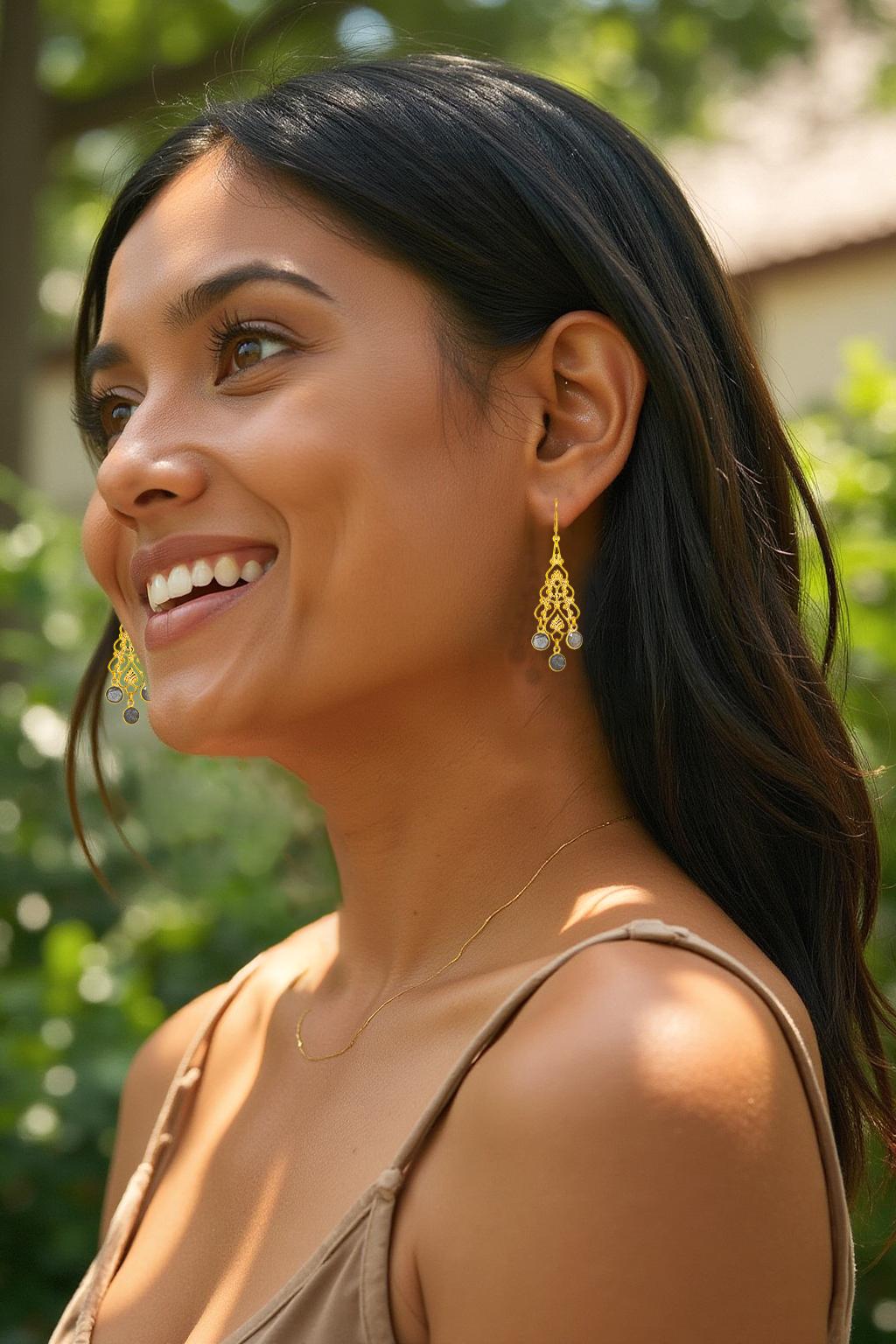 Add a touch of elegance to your jewelry collection with our chandelier style gold filigree earrings featuring shimmering labradorite gemstones. These elegant, feminine gold dangle earrings showcase intricate gold filigree paired with the captivating colors of labradorite, creating a beautiful drop design perfect for any occasion. Whether you're dressing up for a special event or adding sparkle to your everyday look, these labradorite statement earrings offer timeless beauty and sophisticated style. The warm gold accents for feminine elegance with a sleek refined modern twist. These gorgeous long lightweight earrings have a comfortable and secure closure. Add these stunning limited-edition gold dangle earrings to your collection today!