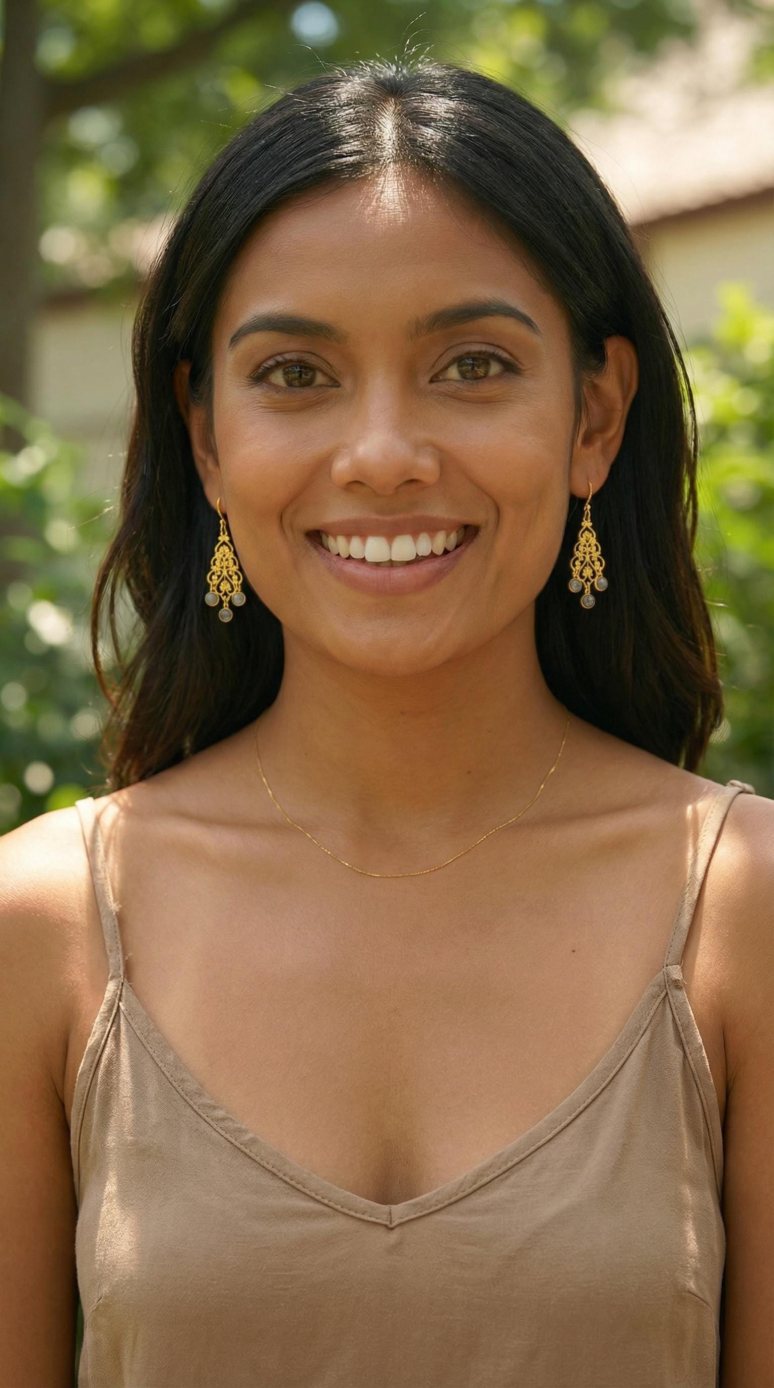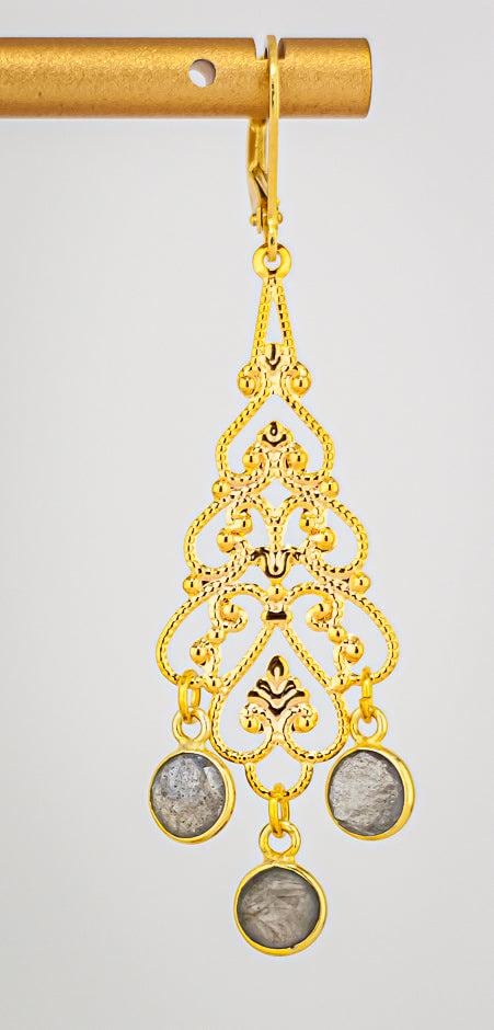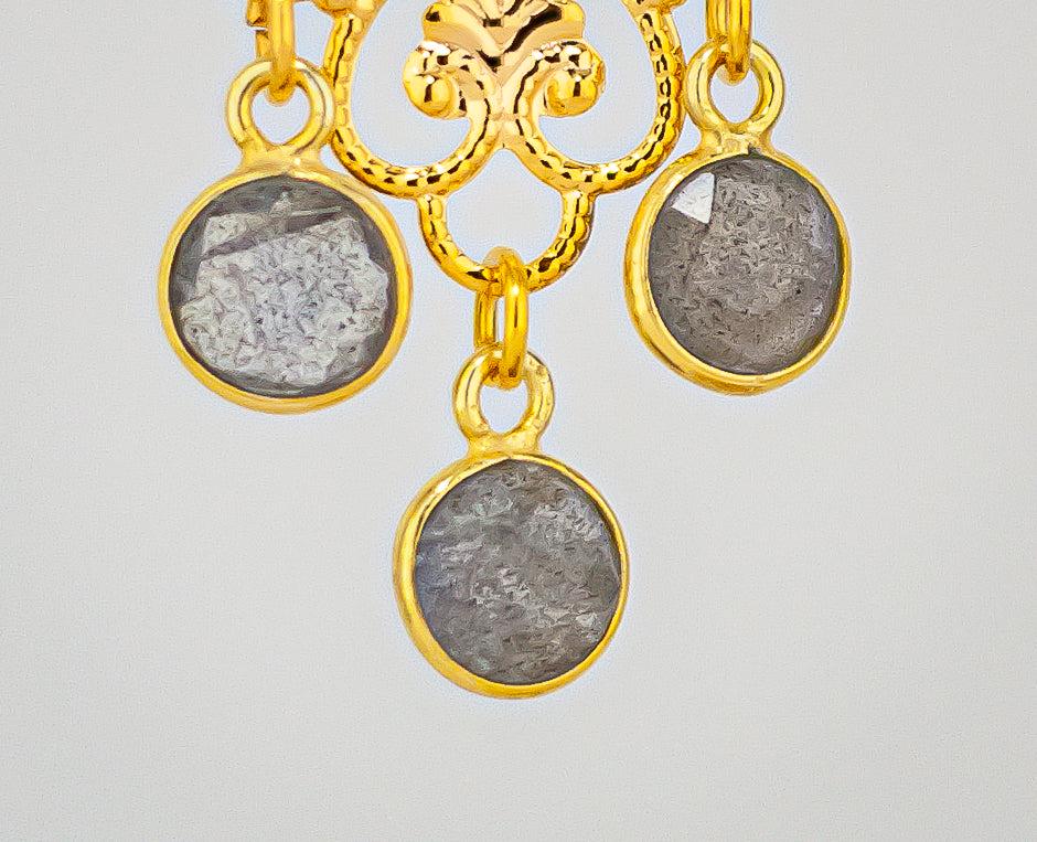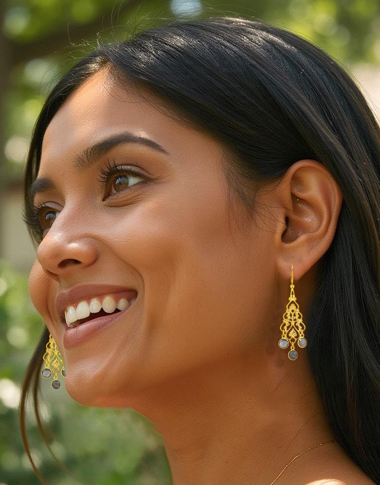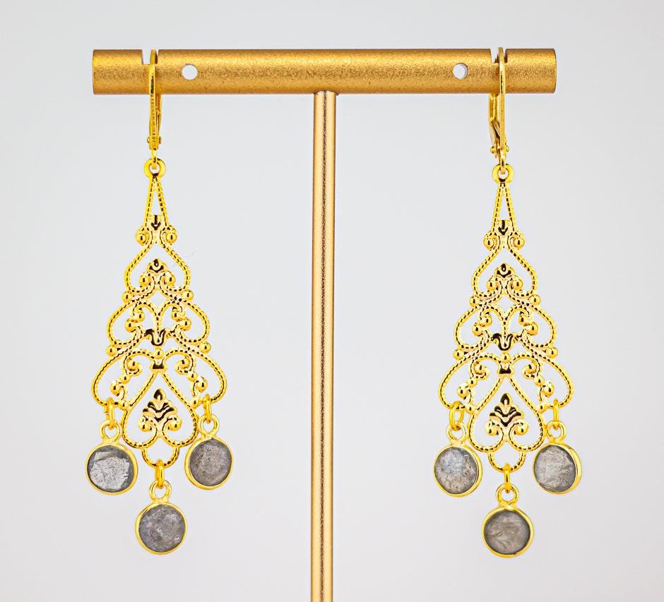 Add a touch of elegance to your jewelry collection with our chandelier style gold filigree earrings featuring shimmering labradorite gemstones. These elegant, feminine gold dangle earrings showcase intricate gold filigree paired with the captivating colors of labradorite, creating a beautiful drop design perfect for any occasion. Whether you're dressing up for a special event or adding sparkle to your everyday look, these labradorite statement earrings offer timeless beauty and sophisticated style. The warm gold accents for feminine elegance with a sleek refined modern twist. These gorgeous long lightweight earrings have a comfortable and secure closure. Add these stunning limited-edition gold dangle earrings to your collection today!