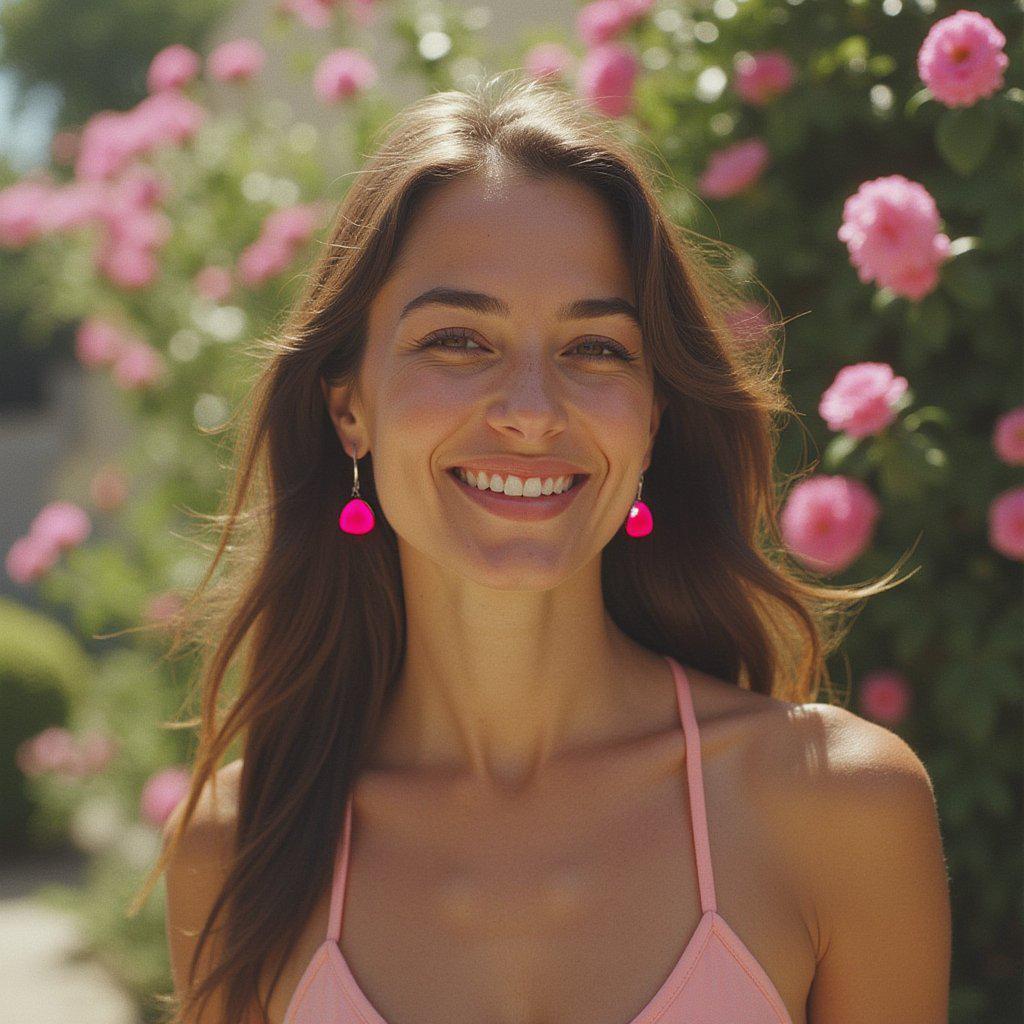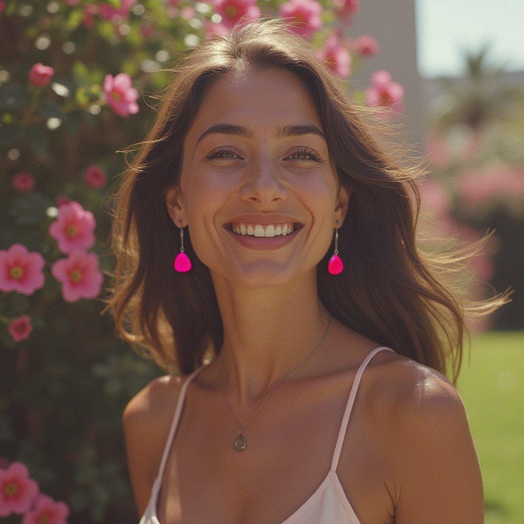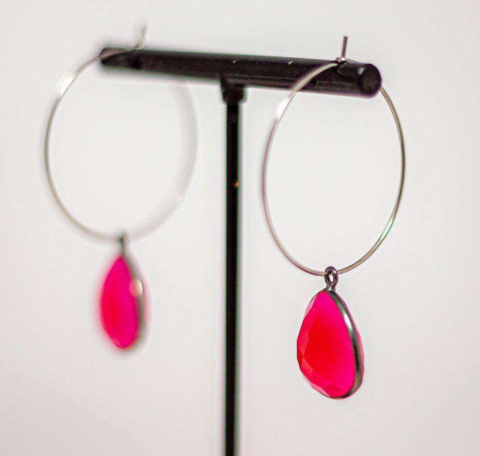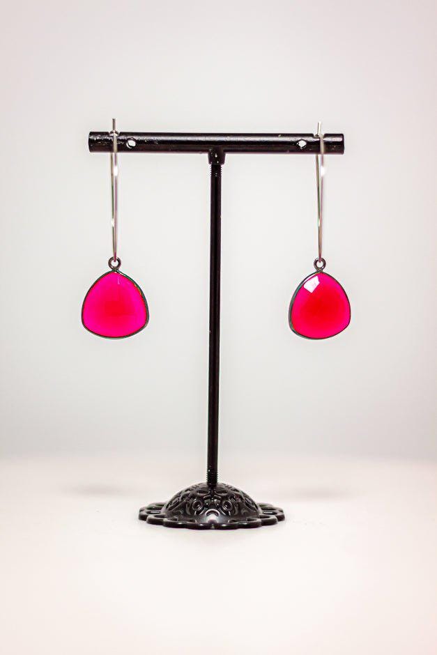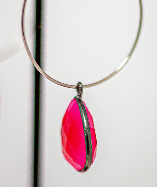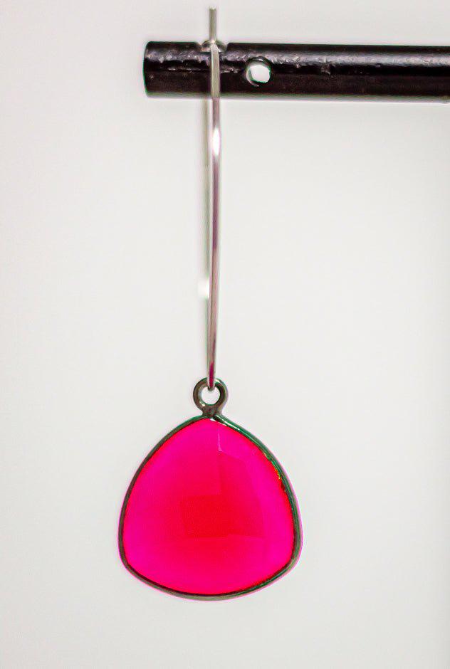 Make a bold statement with these stunning hot pink hoop earrings. Featuring vibrant pink chalcedony stones, these earrings dangle elegantly from sleek gunmetal grey stainless steel hoops, creating a captivating modern look. The striking contrast between the bright pink gemstones and steely grey adds a touch of sleek sophistication and girly edge to any outfit. Perfect for those who love to stand out, these hot pink earrings are a must-have addition to your gemstone hoop earring collection. Whether dressing up for a night out or adding a pop of color to your everyday style, these statement earrings are sure to turn heads. Add these bright bold crystal earrings to your jewelry collection for a fresh, energetic look that’s as unique and gorgeous as you are.