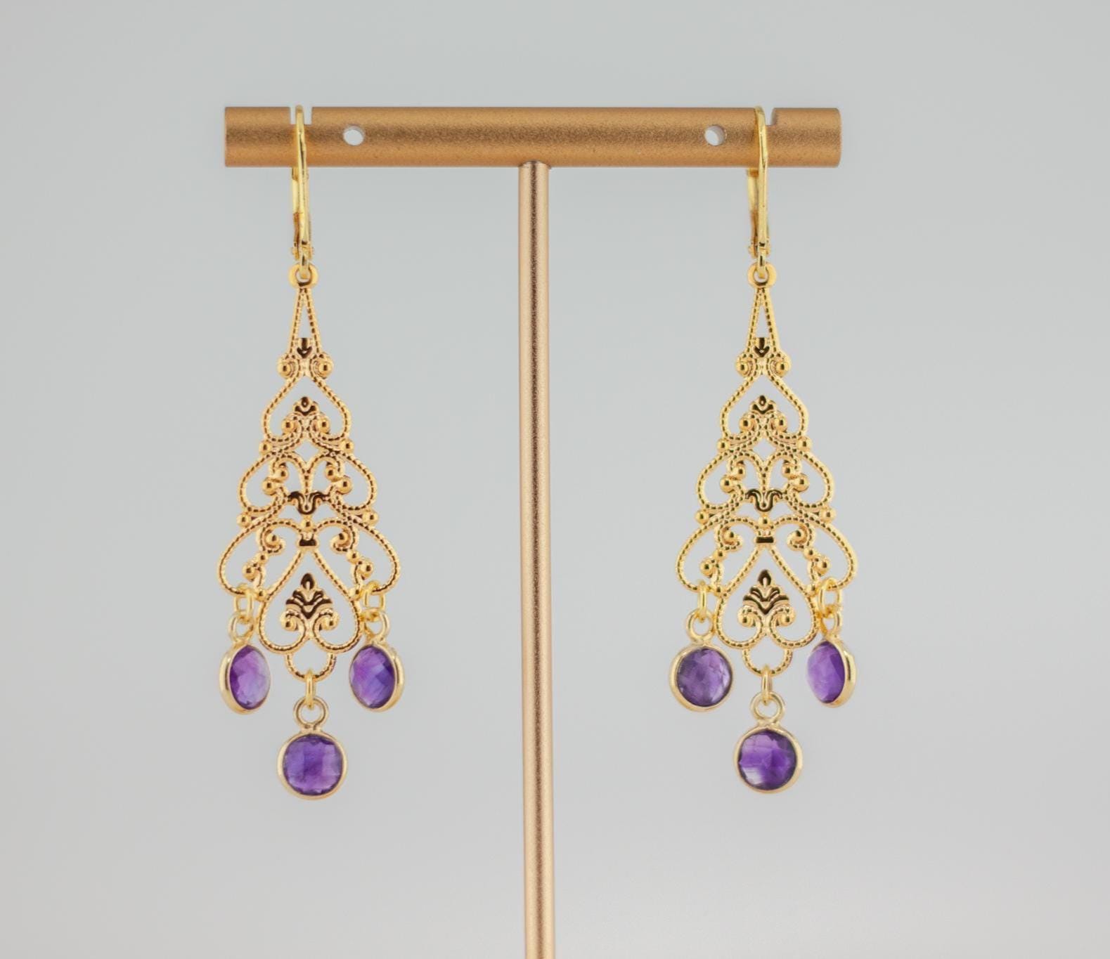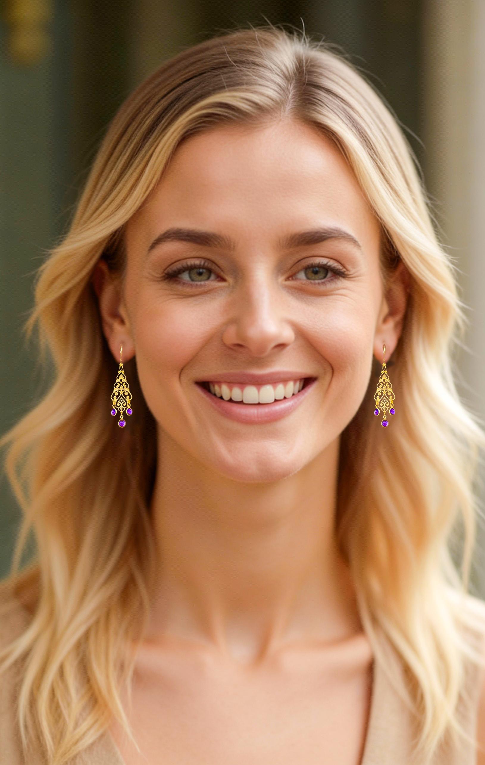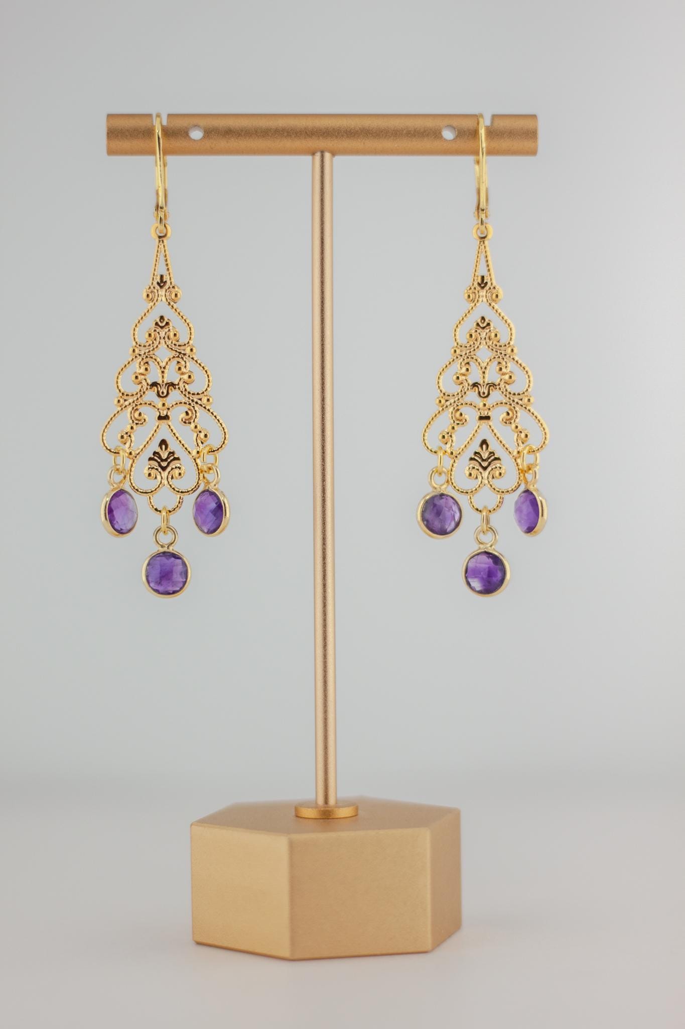 Elevate your style with these elegant Gold Filigree Dangle Earrings featuring deep purple amethyst gemstones. The intricate filigree design of these boho luxe amethyst drops exudes timeless femininity, while the rich dark purple amethyst stones add a touch of refined sophistication and charm. These long gold dangle earrings are perfect for any occasion, effortlessly transitioning from daytime elegance to evening glamour.